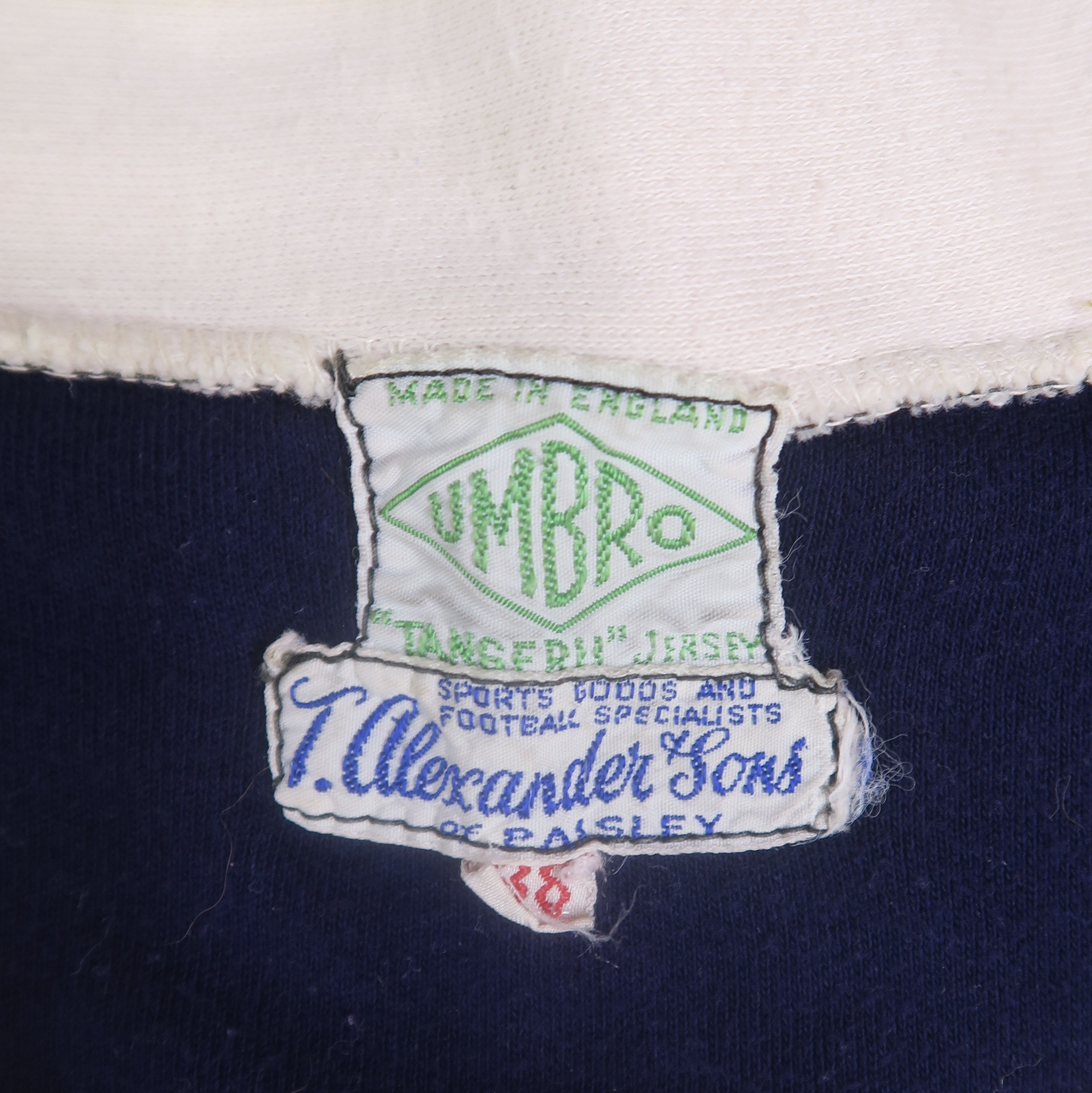 Size 38, with embroidered badge to the left chest and internal labels for Umbro and T. Alexander & Sons of Paisley, Sports Goods and Football Specialists; together with a copy of The King - Denis Law: The Autobiography published by Bantam Press, 2003 (2)