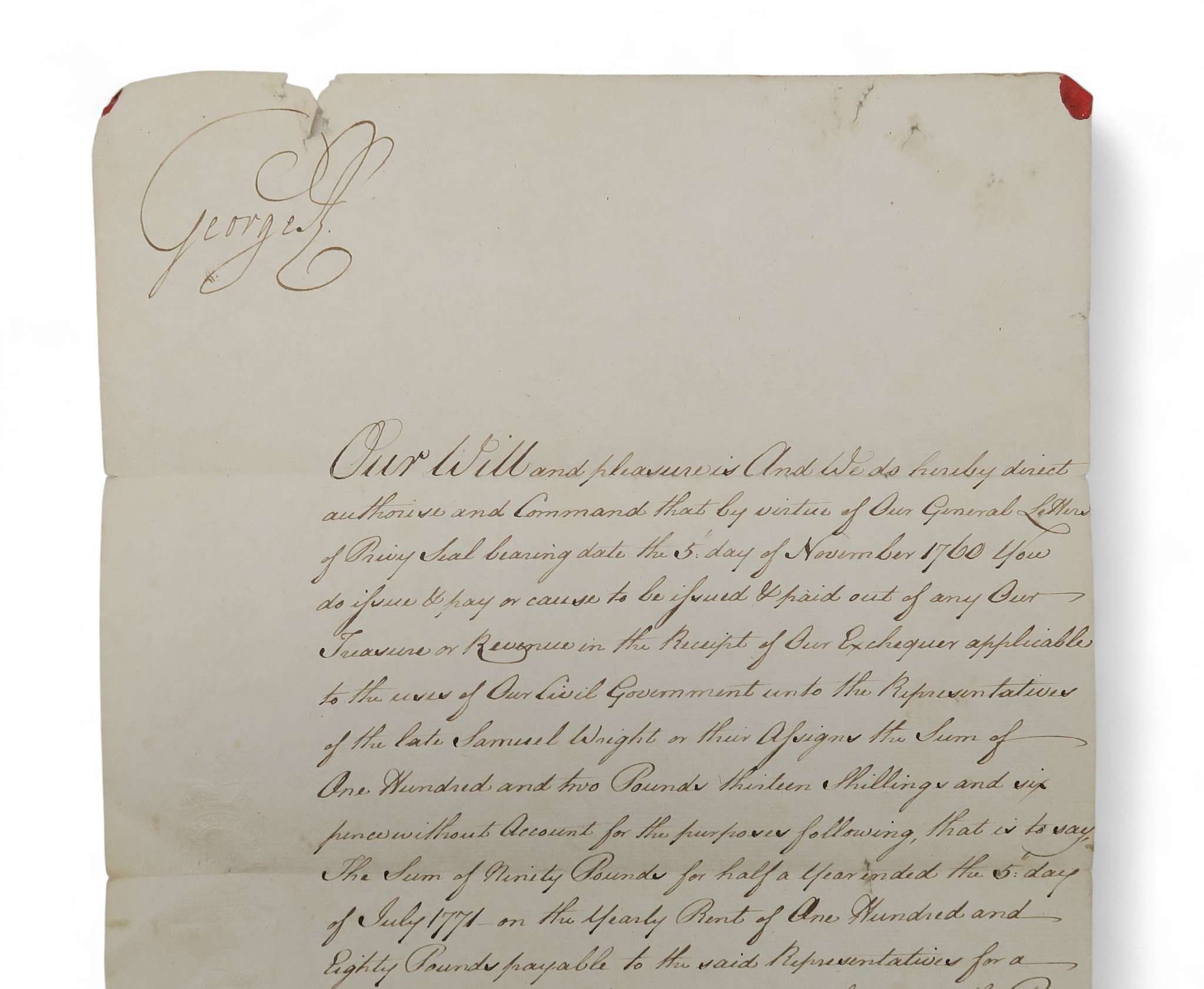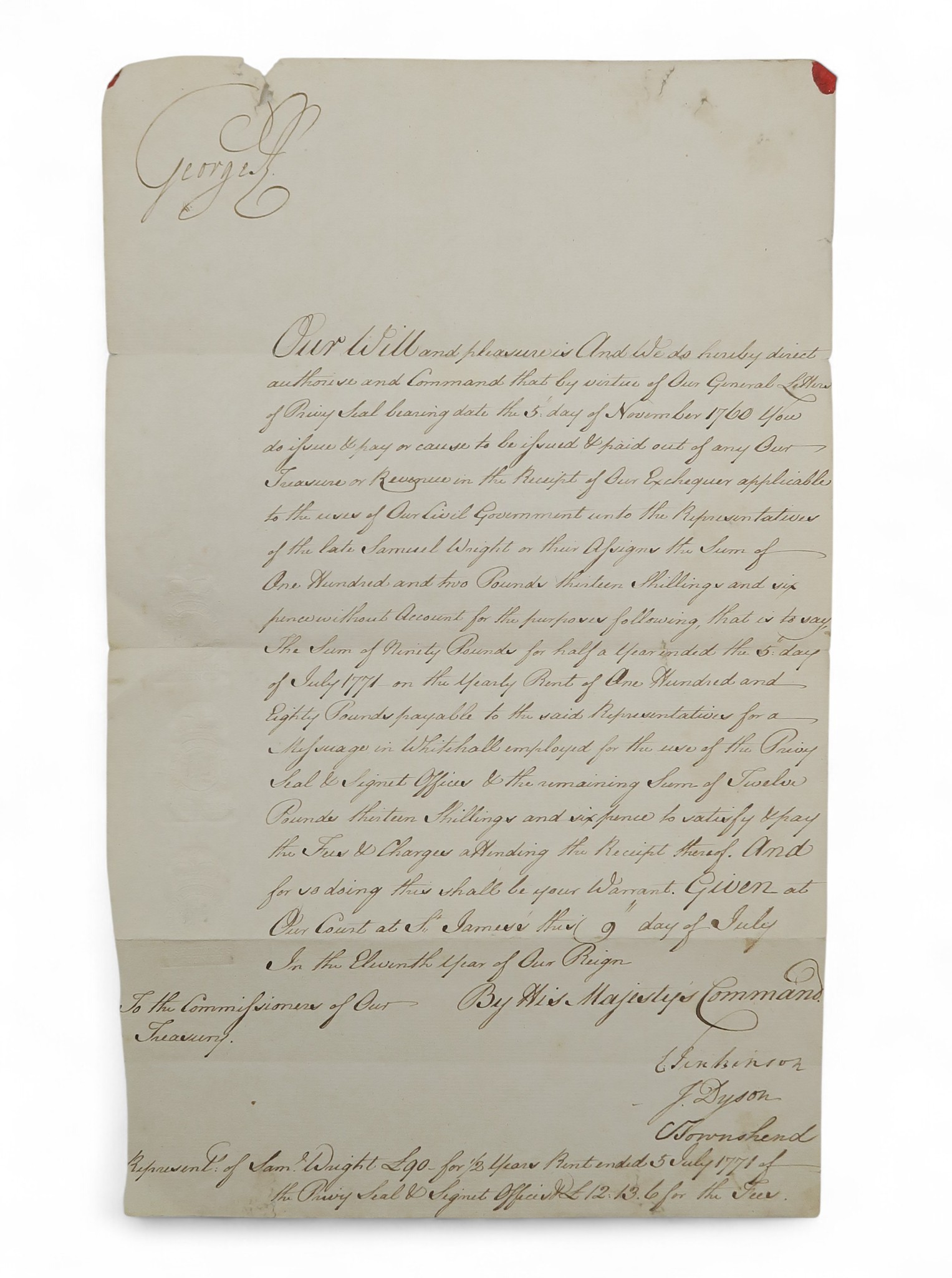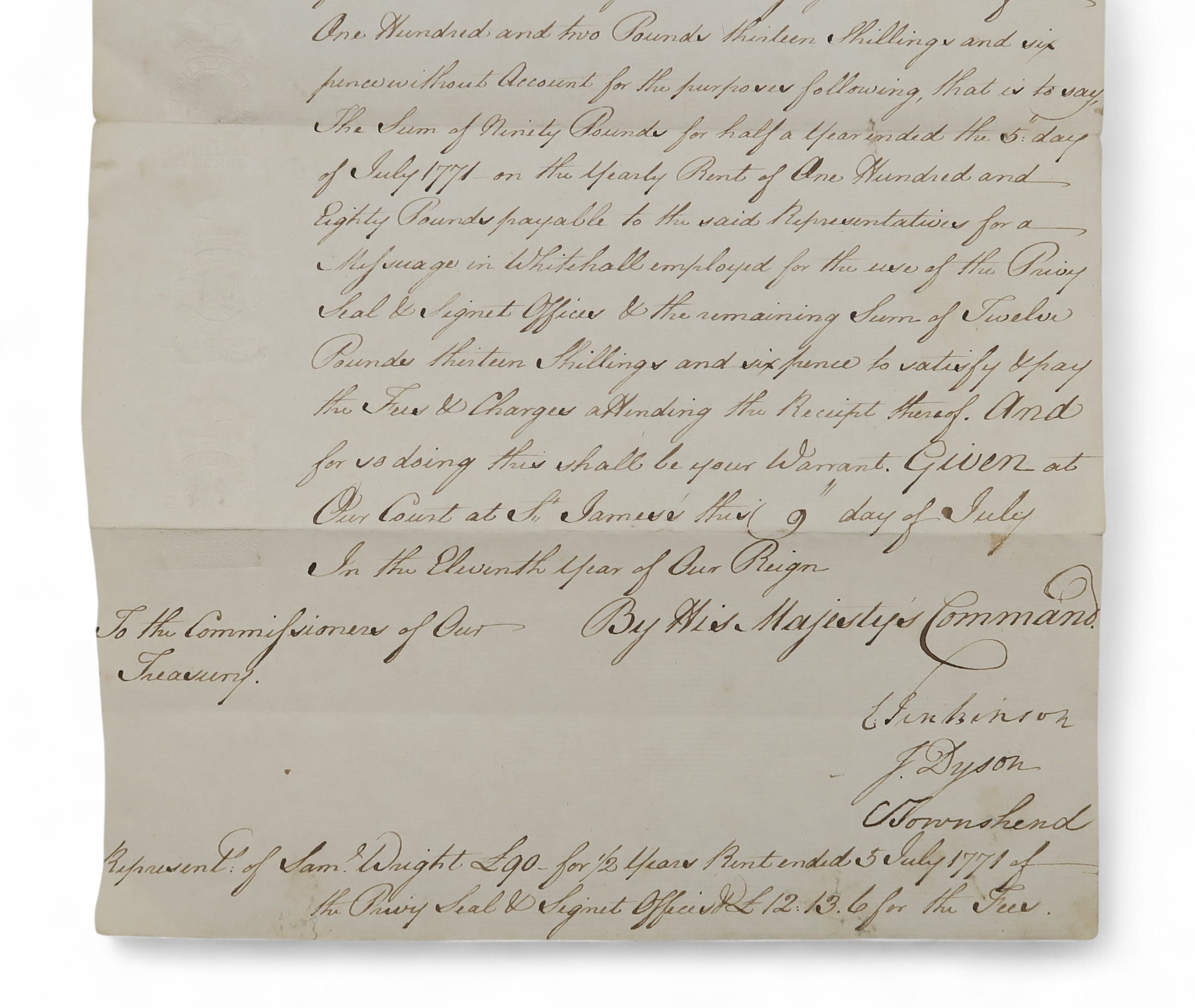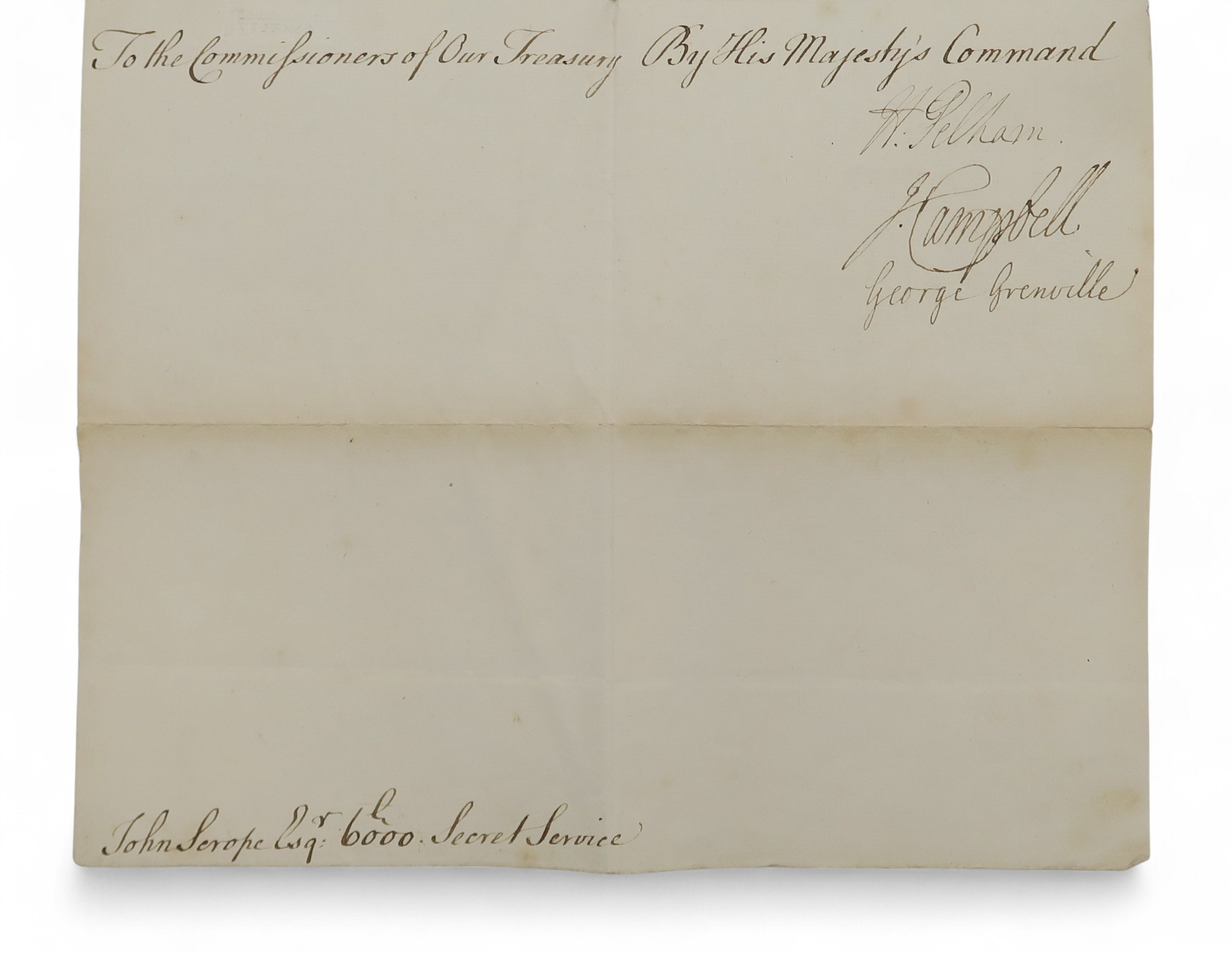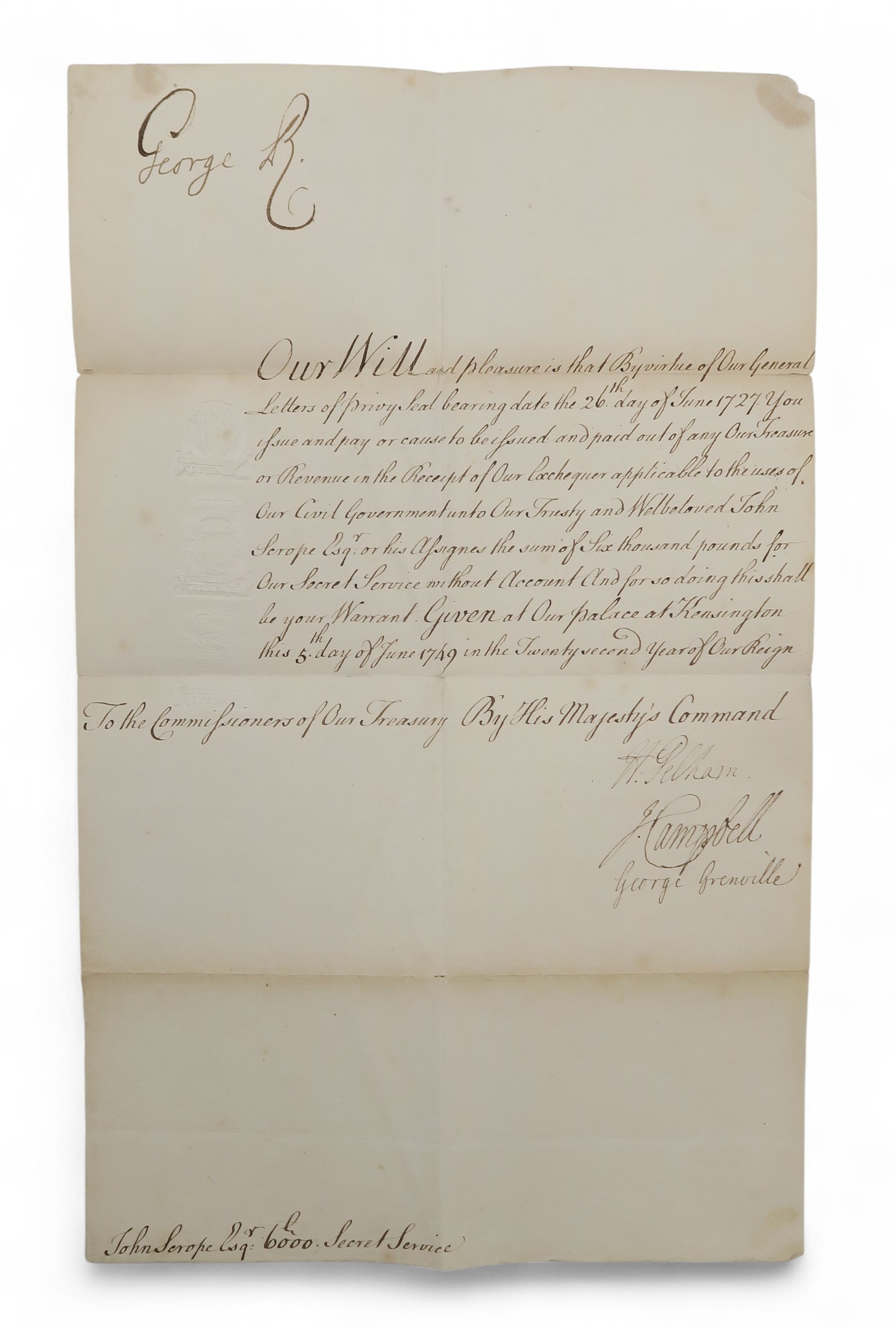 A document signed by King George II, dated 5th June 1747, recording the payment of six-thousand pounds to John Scrope Esqr. "for Our Secret Service", the lower portion countersigned by Lords Commissioners of the Treasury Henry Pelham, J. Campbell and George Grenville, measuring approx. 37.4cm x 23cm; and a second document, signed by George III, dated 5th July 1771, recording rent payments owing to the Representatives of the Late Samuel Wright, the lower portion countersigned by Lords Commissioners of the Treasury Charles Jenkinson, Jeremiah Dyson and Charles Townshend (2)