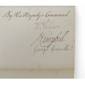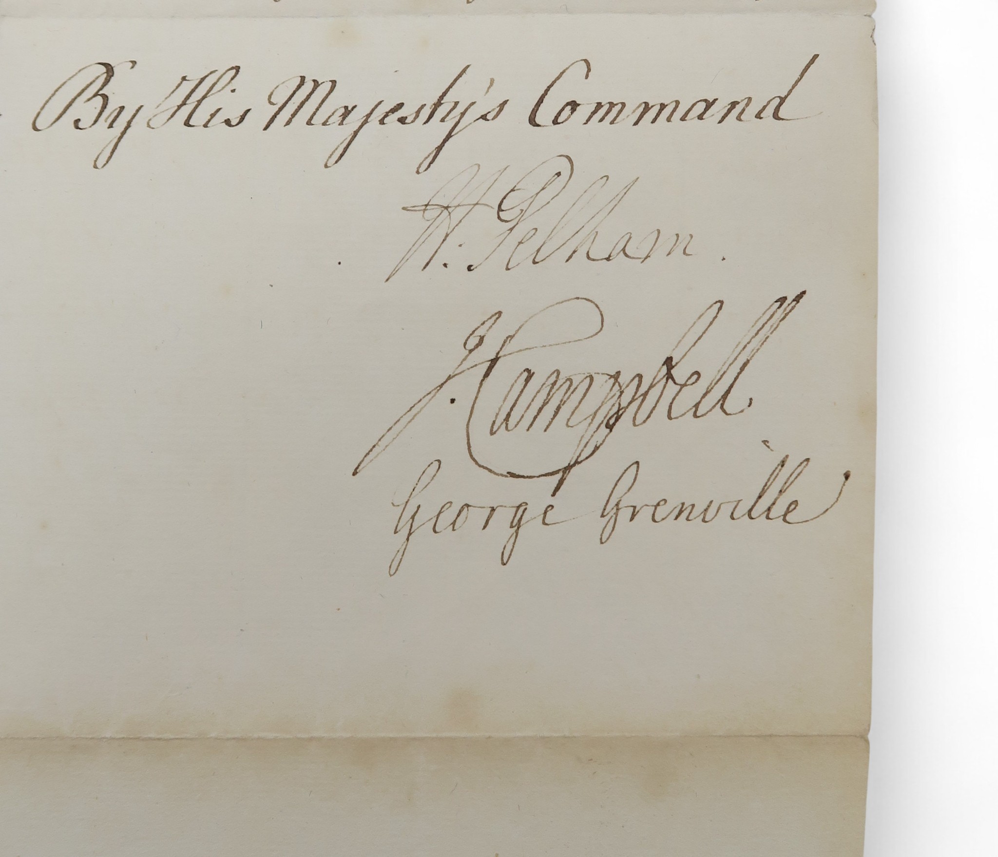 George Grenville (1712-1770), politician, Prime Minister of Great Britain 1763-65. Appointed Lord of the Treasury in 1747, two years prior to signing this document.
