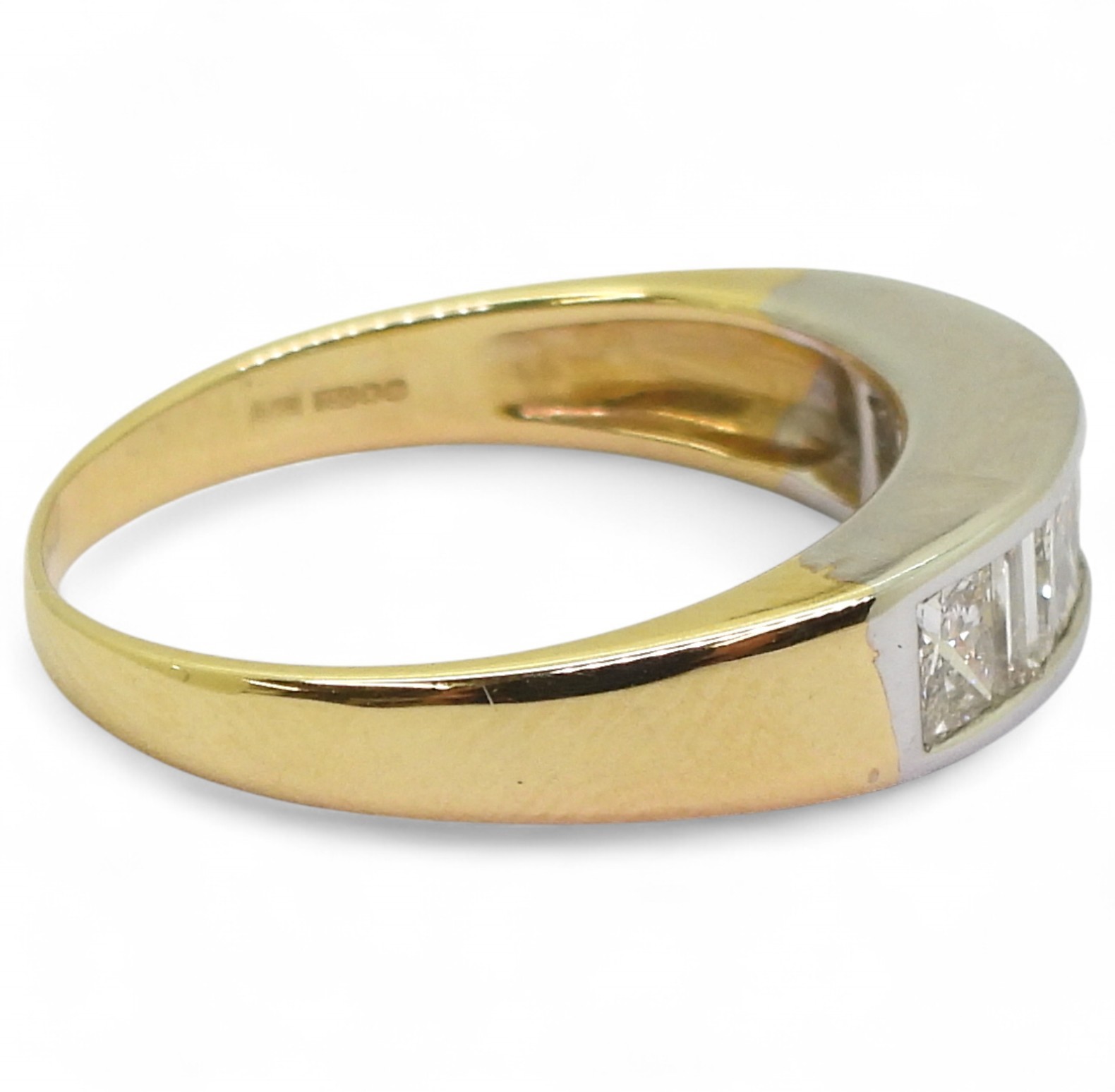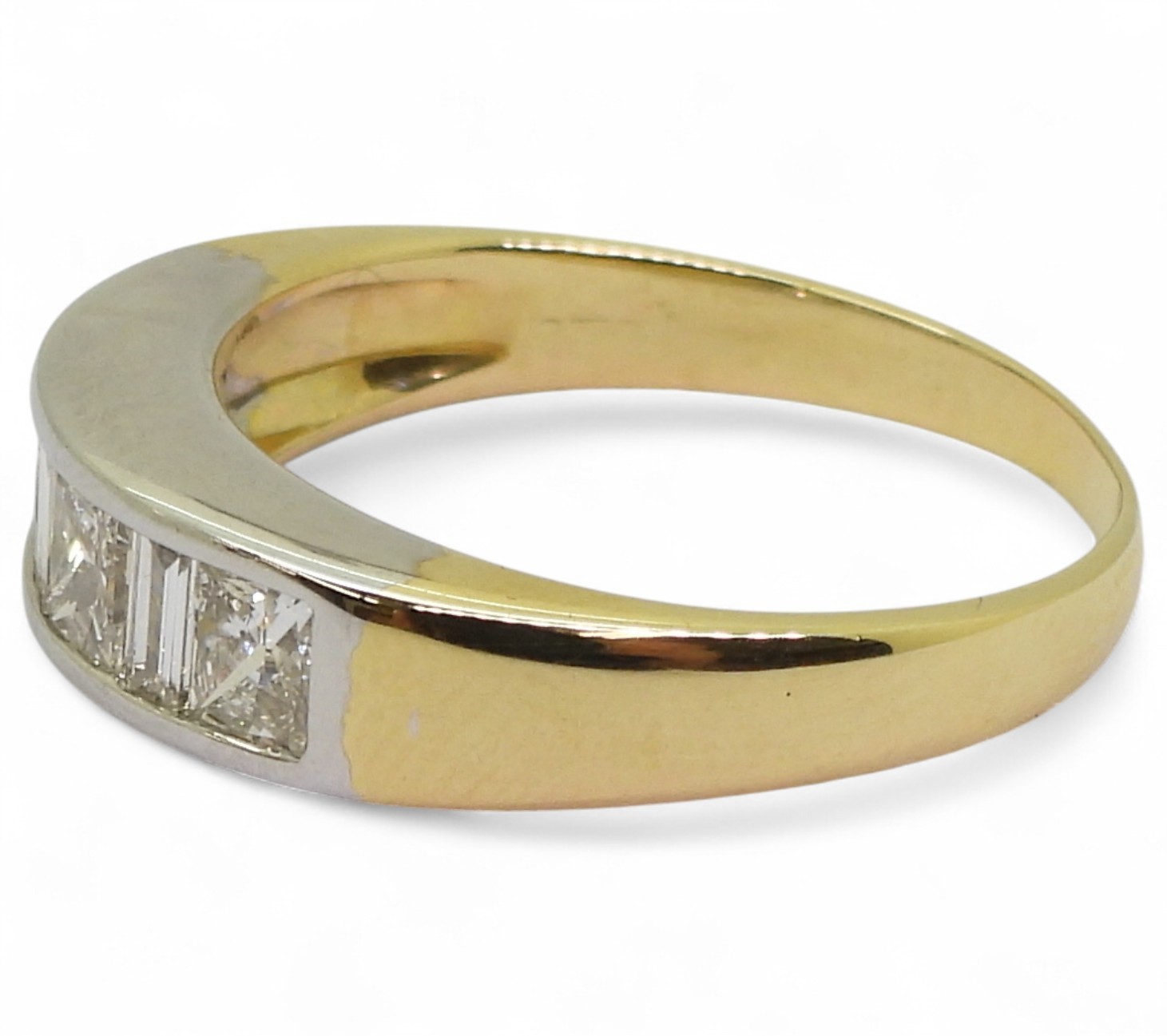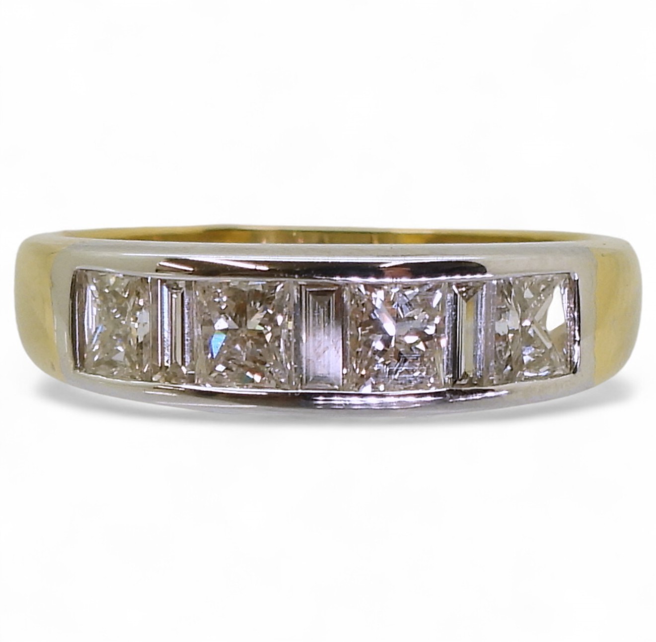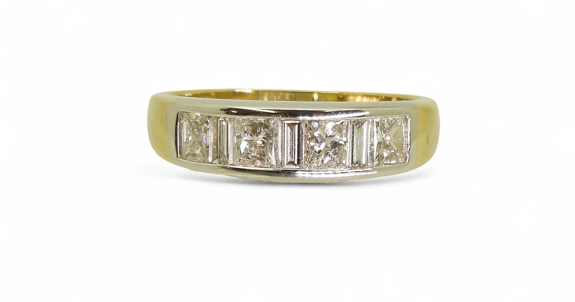 the mount in yellow and white 18ct gold, is set with four princess cut diamonds and three baguette diamonds with an estimated approx diamond total of 1ct. Finger size O, weight 4.3gms
