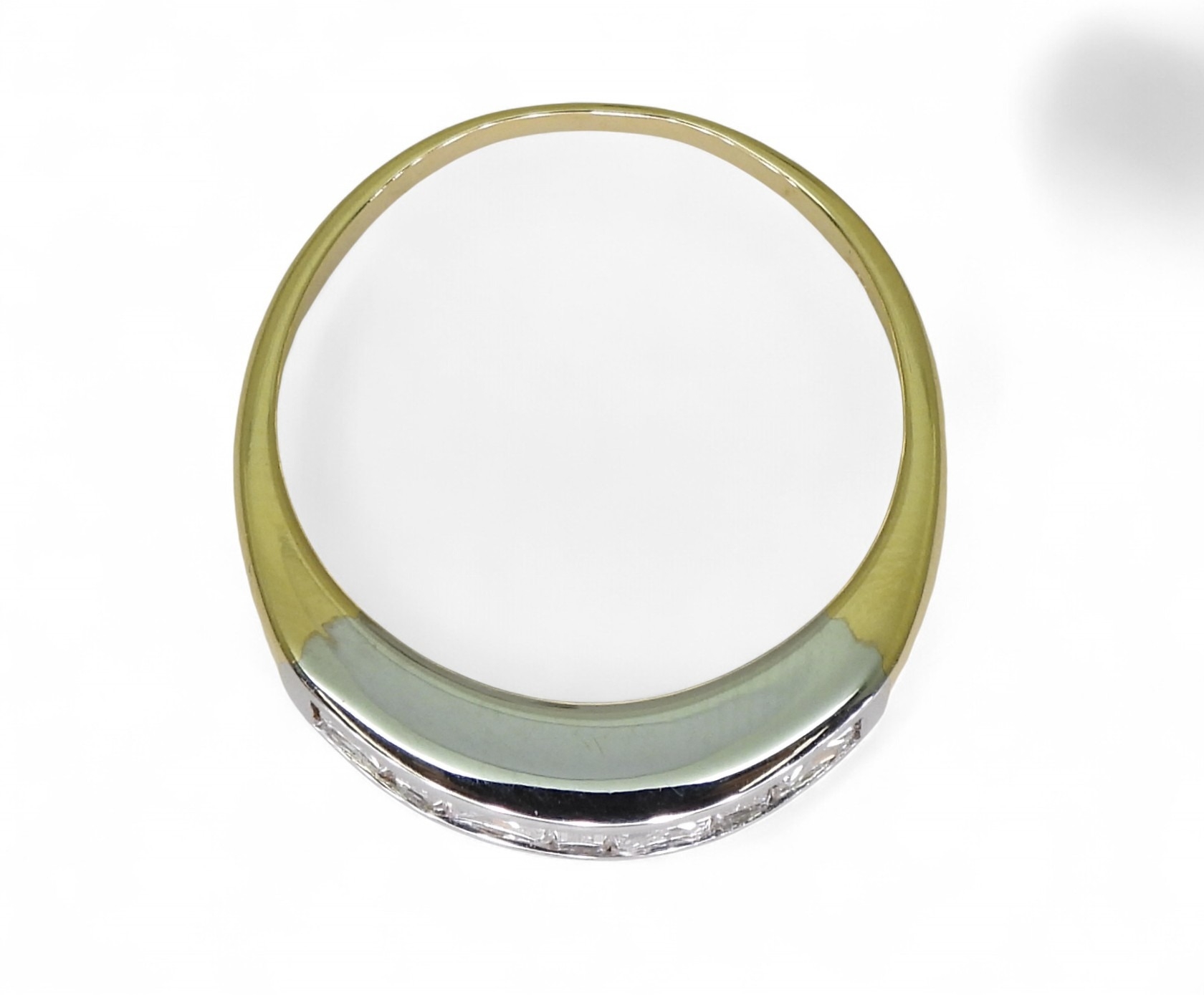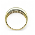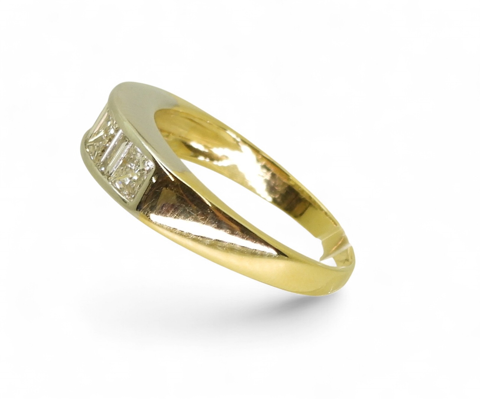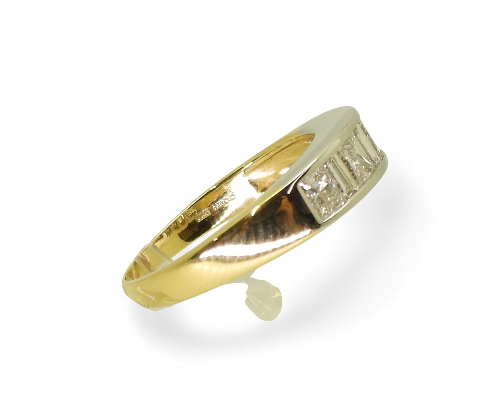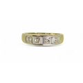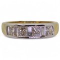 the mount in yellow and white 18ct gold, is set with four princess cut diamonds and three baguette diamonds with an estimated approx diamond total of 1ct. Finger size O, weight 4.3gms
