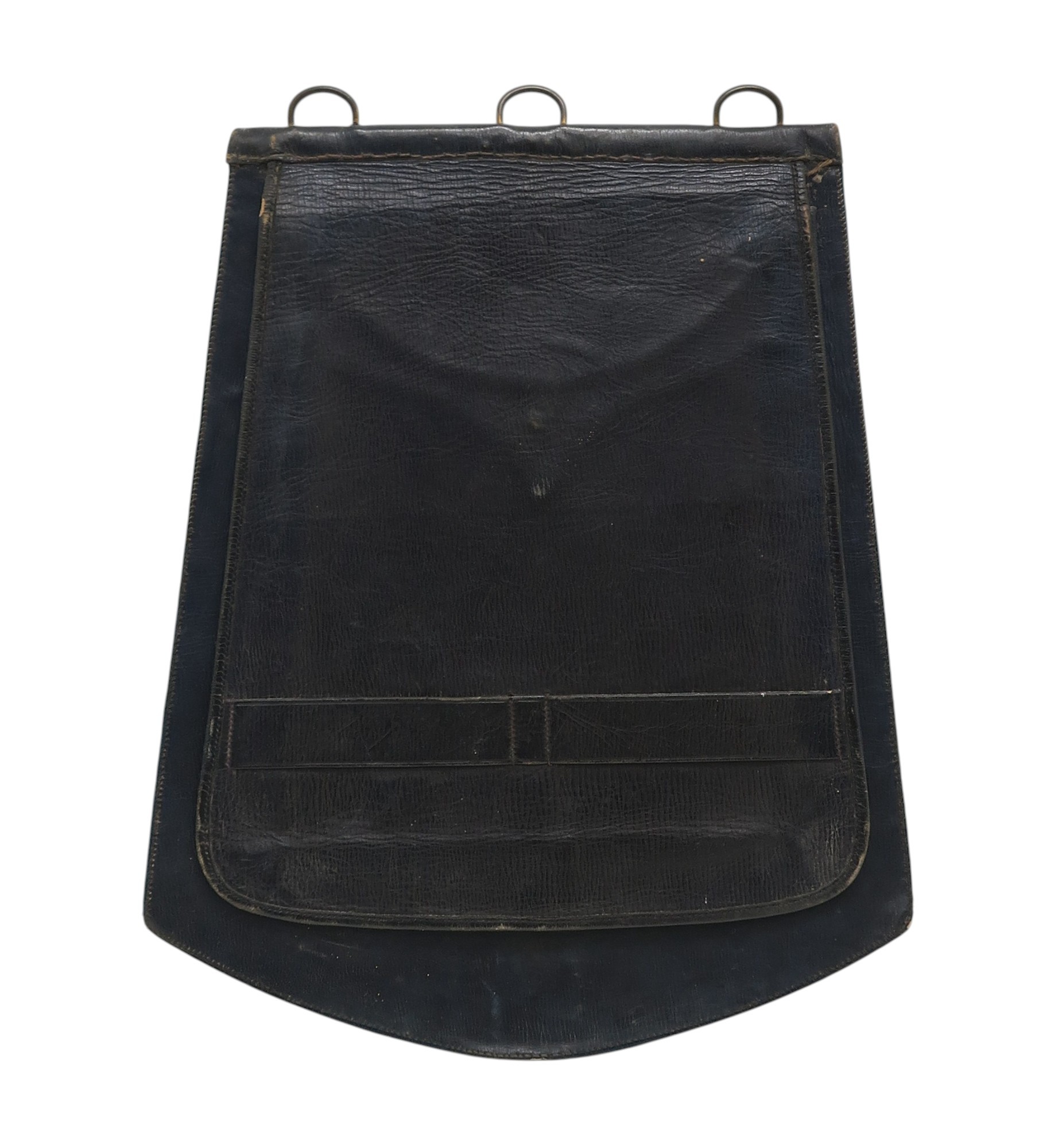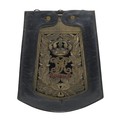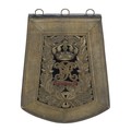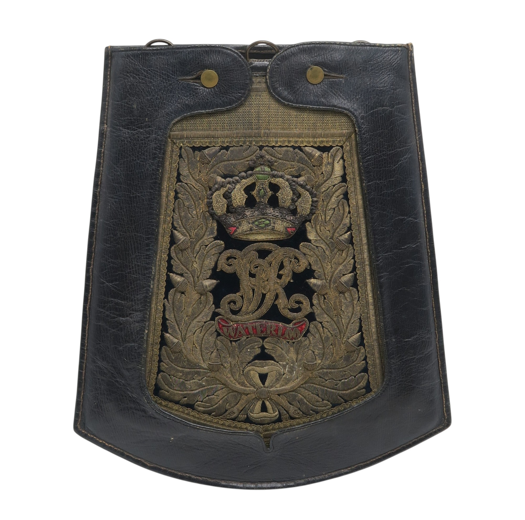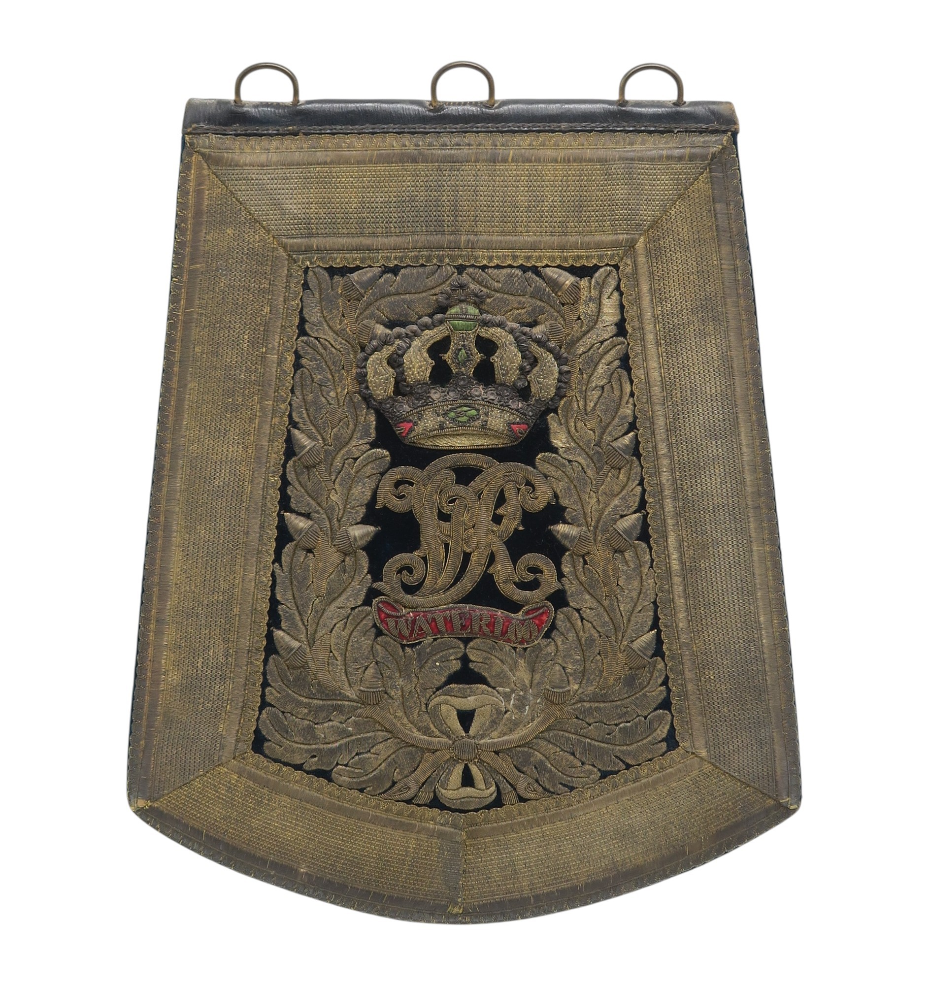 Bullion-embroidered with VR cipher, crown and Waterloo battle honour, amidst trailing oak foliage upon on a deep blue velvet base, the coordinating Morocco cover fastening with two brass buttons, the whole measuring approx. 37.5cm x 32cm