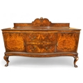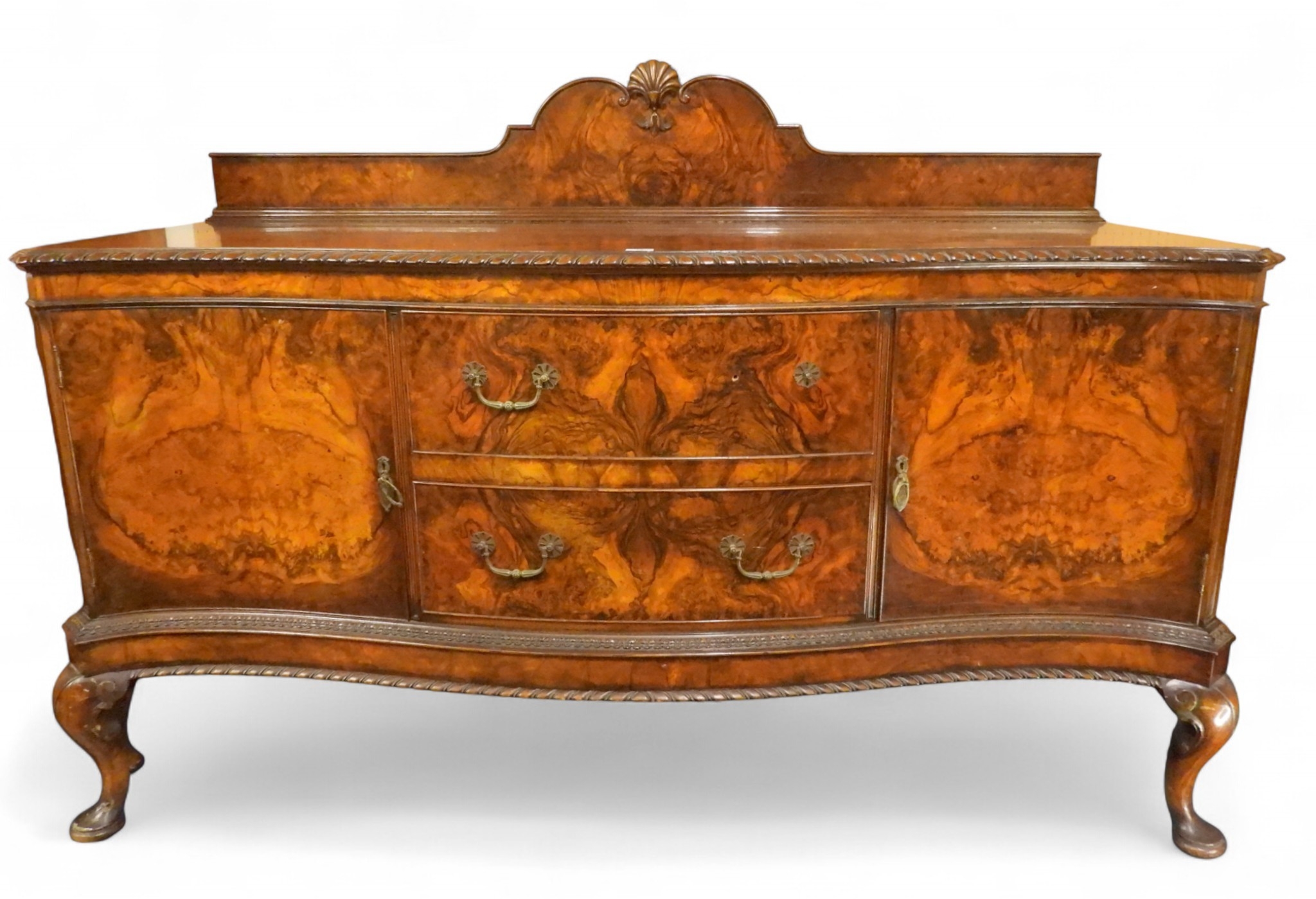 A late 19th century mahogany serpentine front sideboard with shaped backsplash over two central drawers flanked by cabinet doors on cabriole supports, 128cm high x 183cm wide x 64cm deep