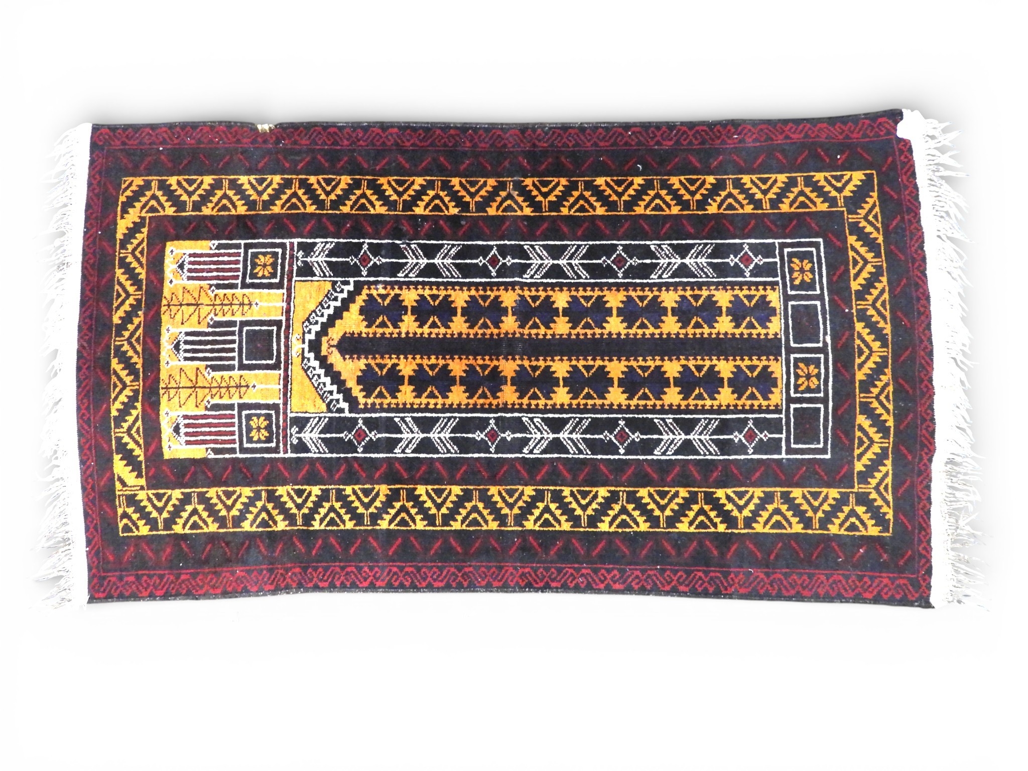 A multicoloured Turkish geometric pattered prayer style rug with red, orange and white colouration, 157cm long x 84cm wide