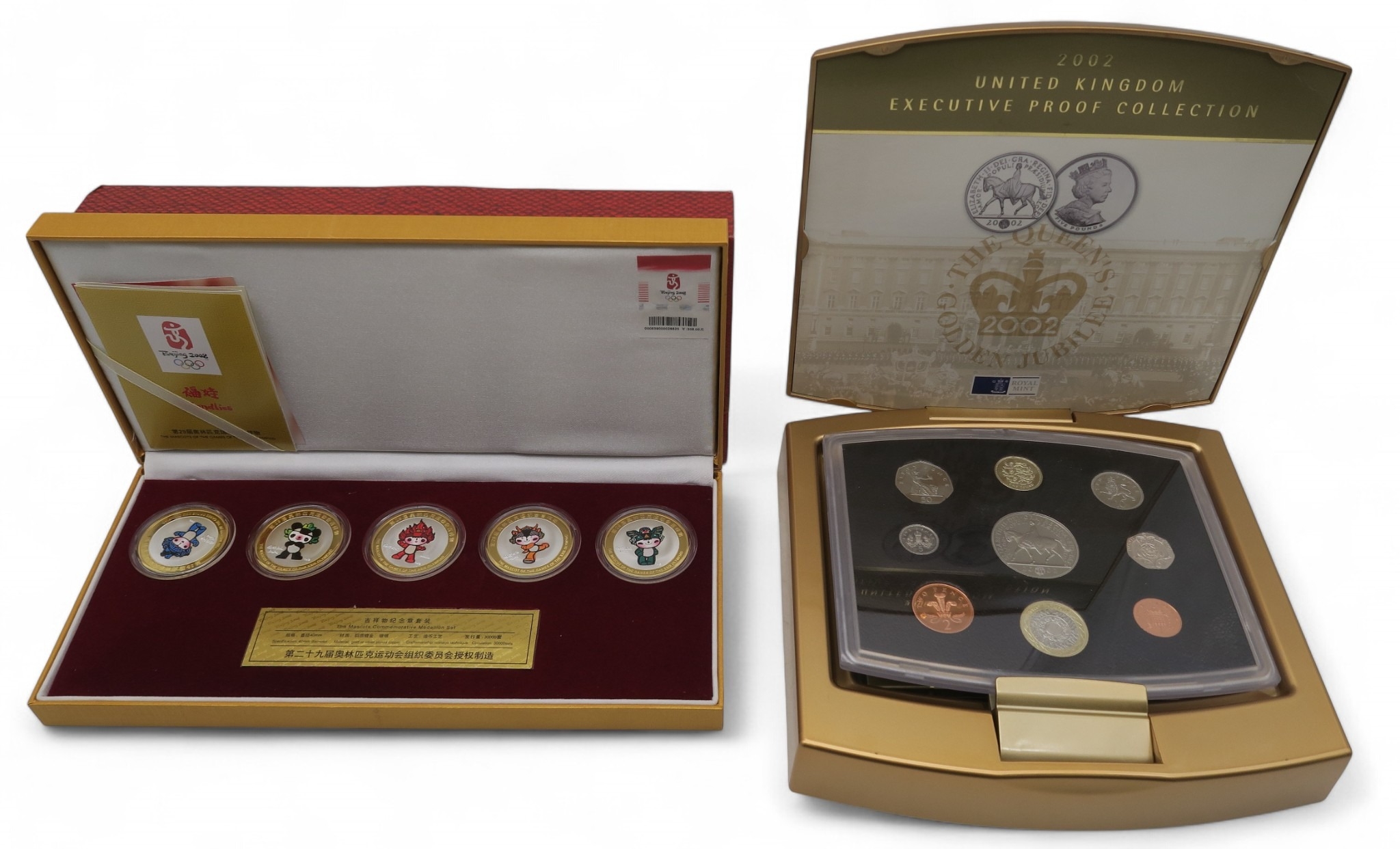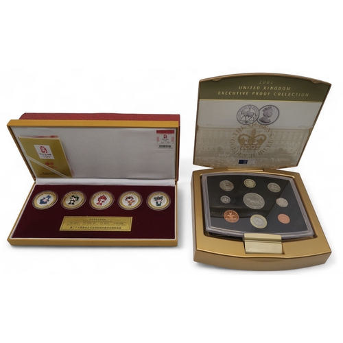 The 2002 United Kingdom Executive Proof Collection with COA together with The Beijing 2008 Mascots Commemorative Medallion Set with COA