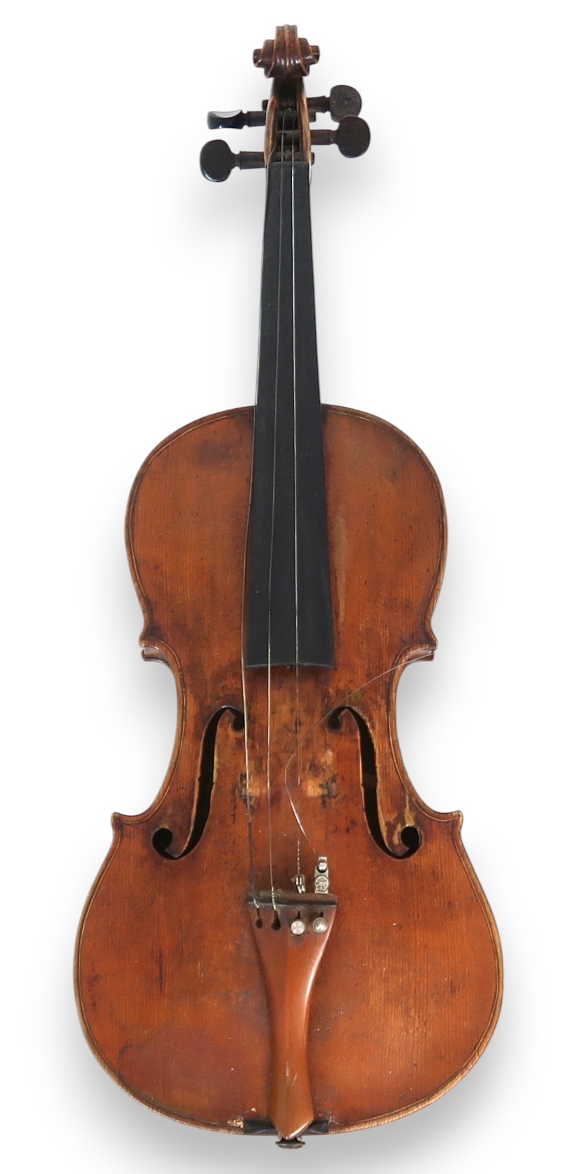 and belly, various minor scuffs and marks to the top. Areas of varnish wear and texture to back, small mark to the back below the nose. Visible cracks at the middle left rib towards the top, visible crack to the upper right rib, loss of various loss of varnish to ribs, scuff marks at the bottom rib at button. Small visible crack above A peg, various small dings and dents to scroll. Jointing at back lower right and left rib to lower right and left purfling is disconnecting but in place. There is texture to the varnish surface in places but not through out.