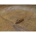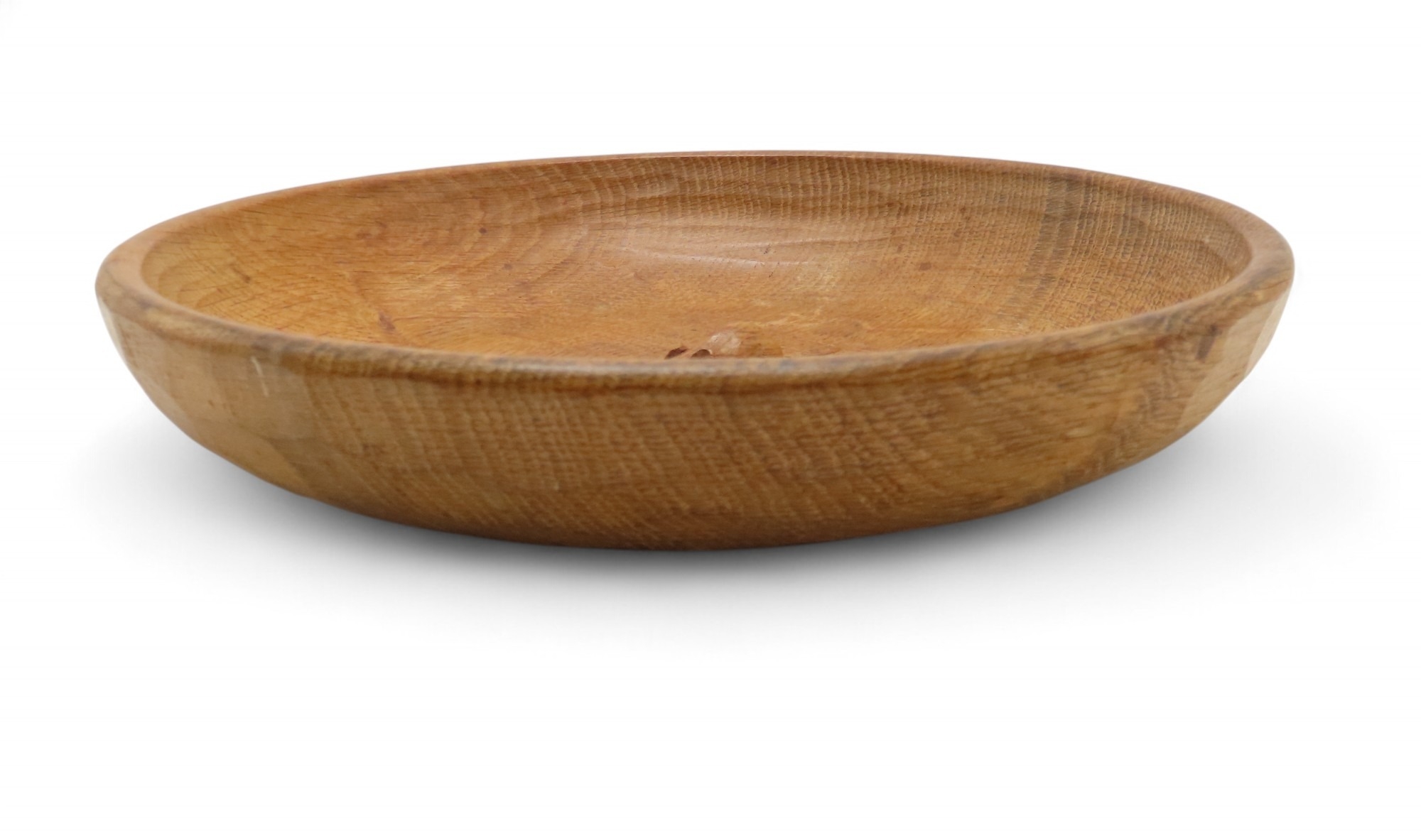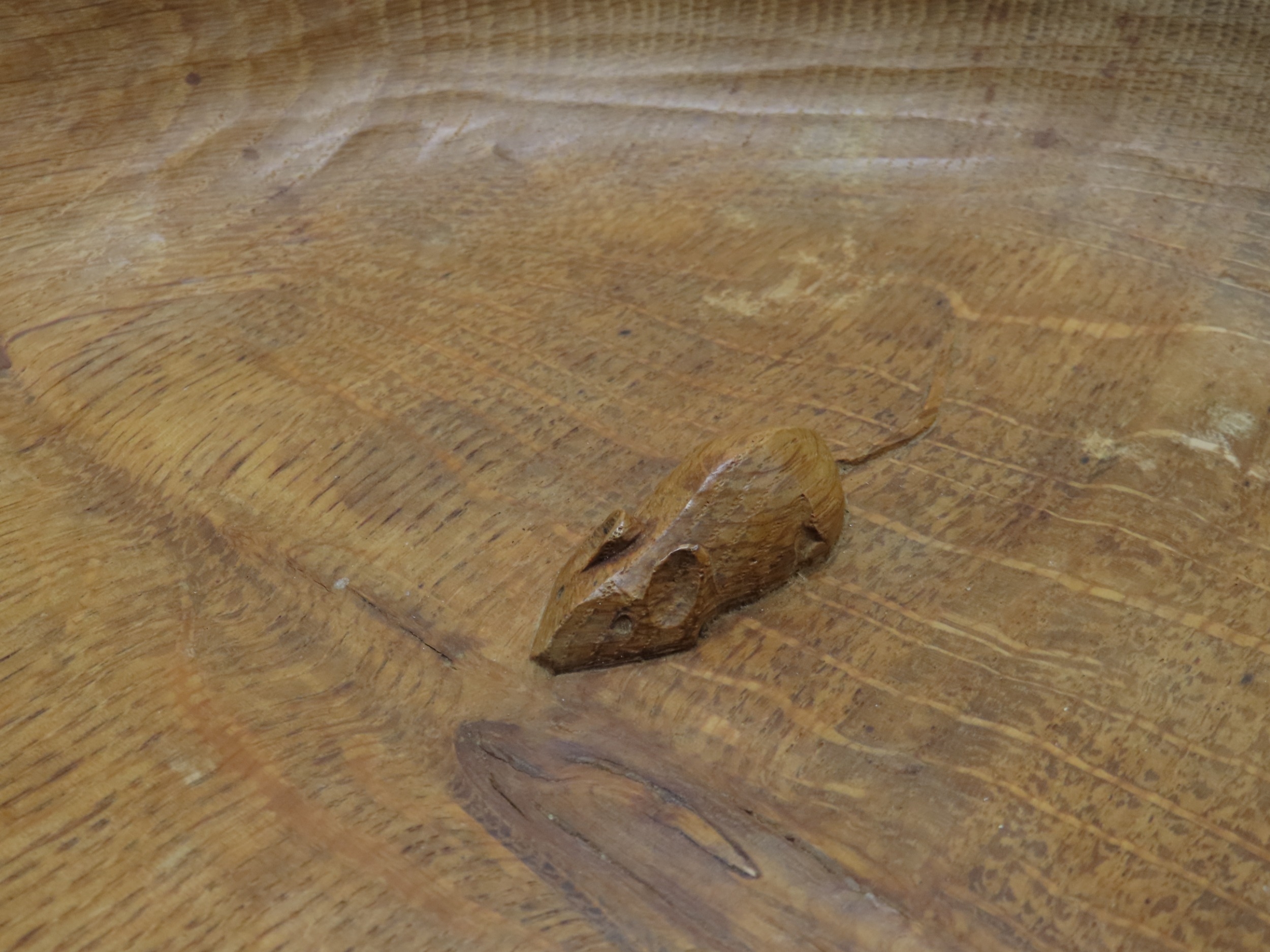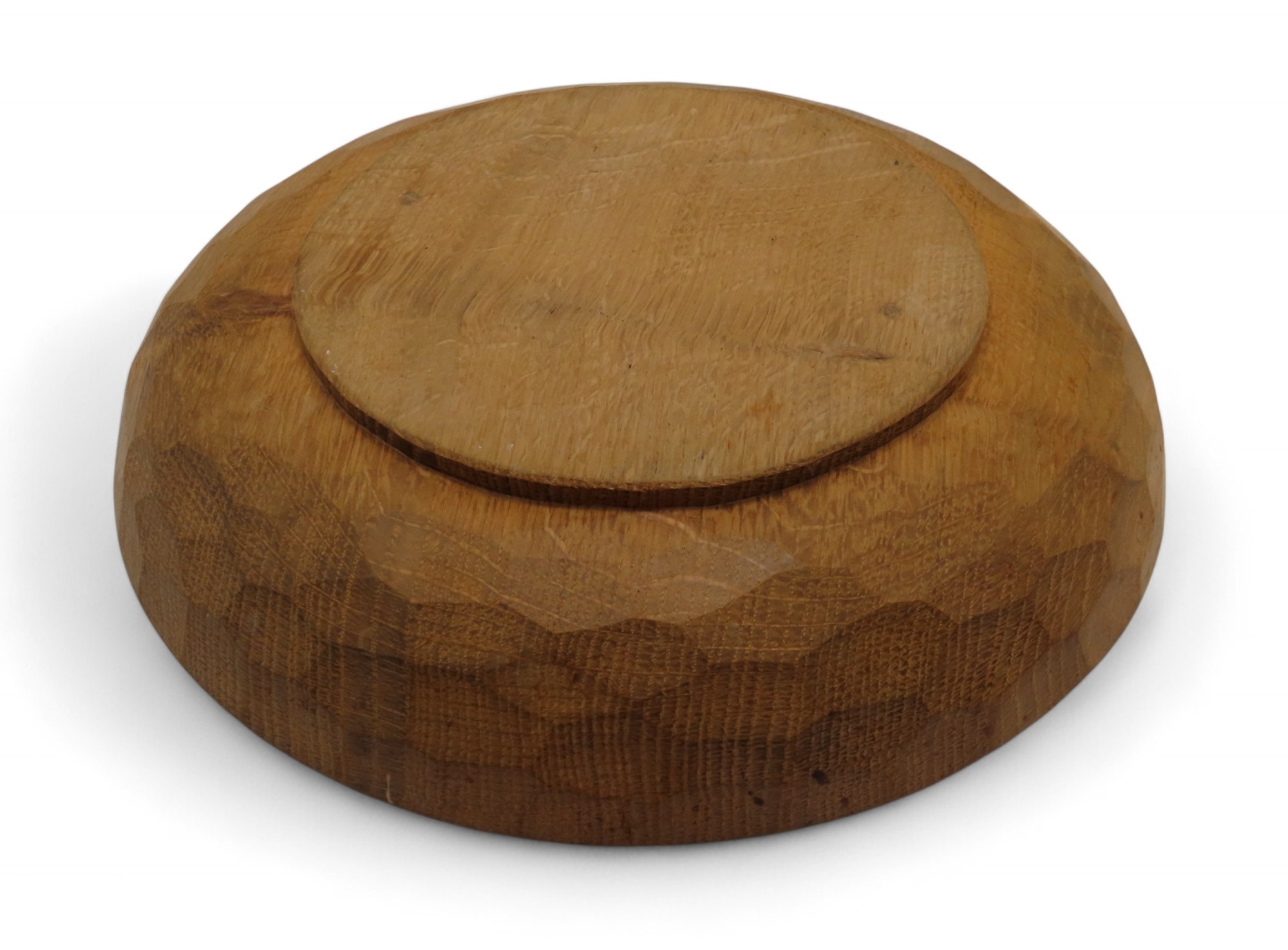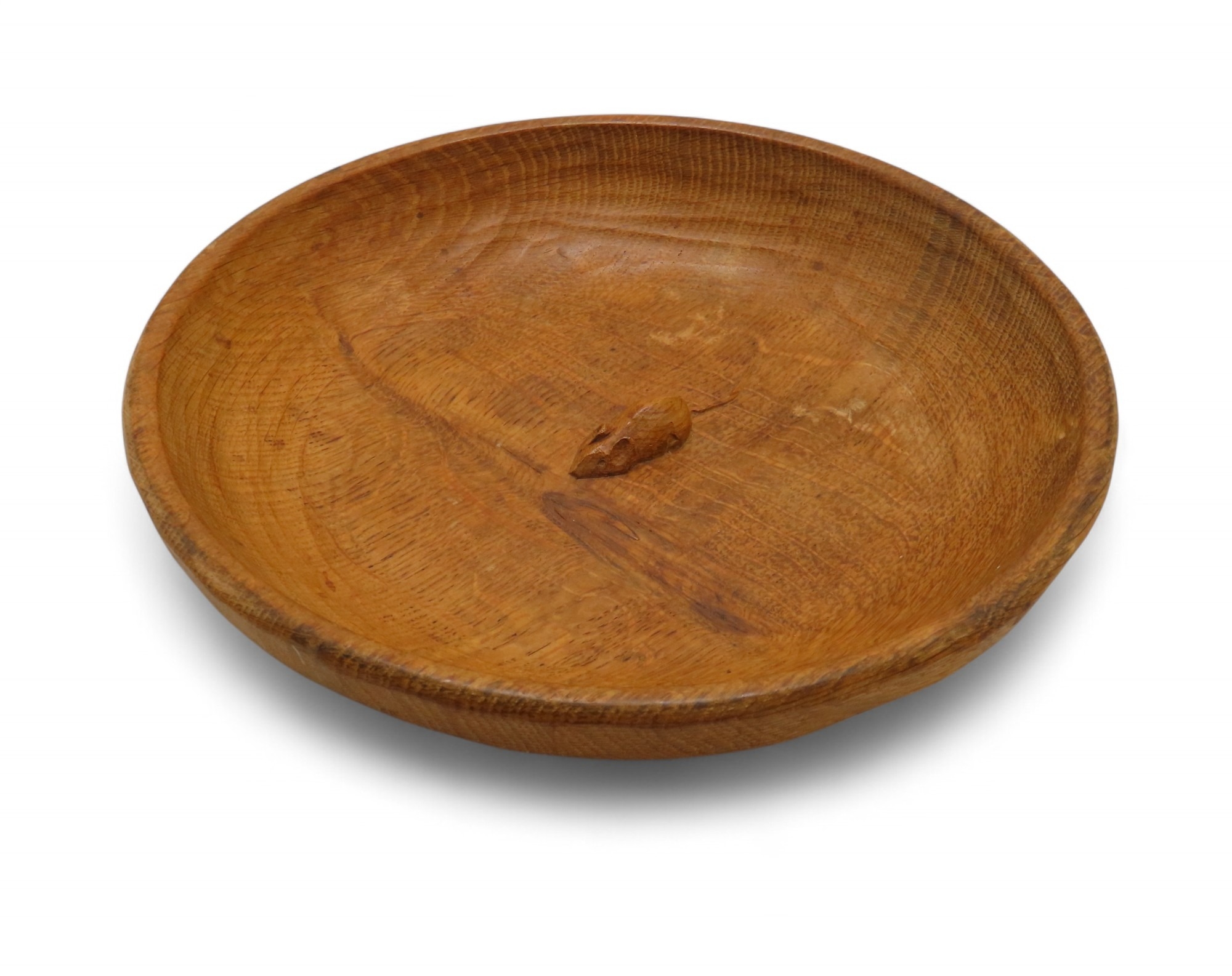 oak fruit bowl, of circular form with adzed finish and carved mouse to the centre, 29cm diameter