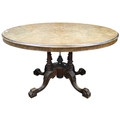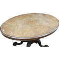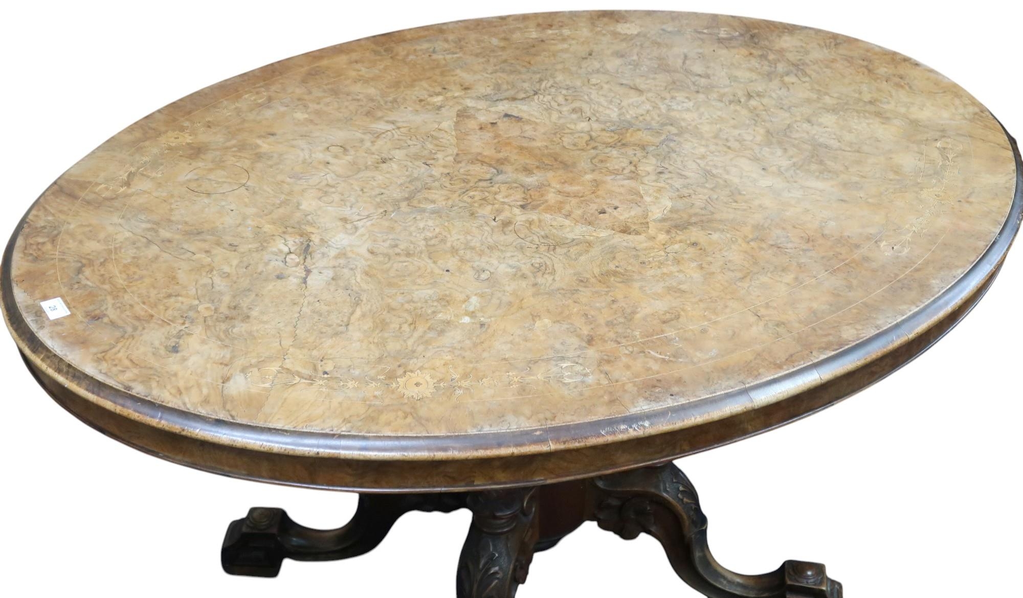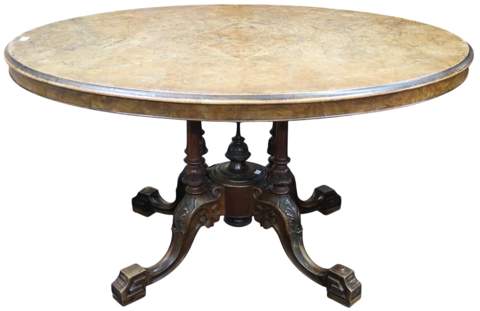 A Victorian burr walnut quarter veneered oval tilt top breakfast table on turned supports on quadrupedal base, 72cm high x 136cm long x 102cm deep