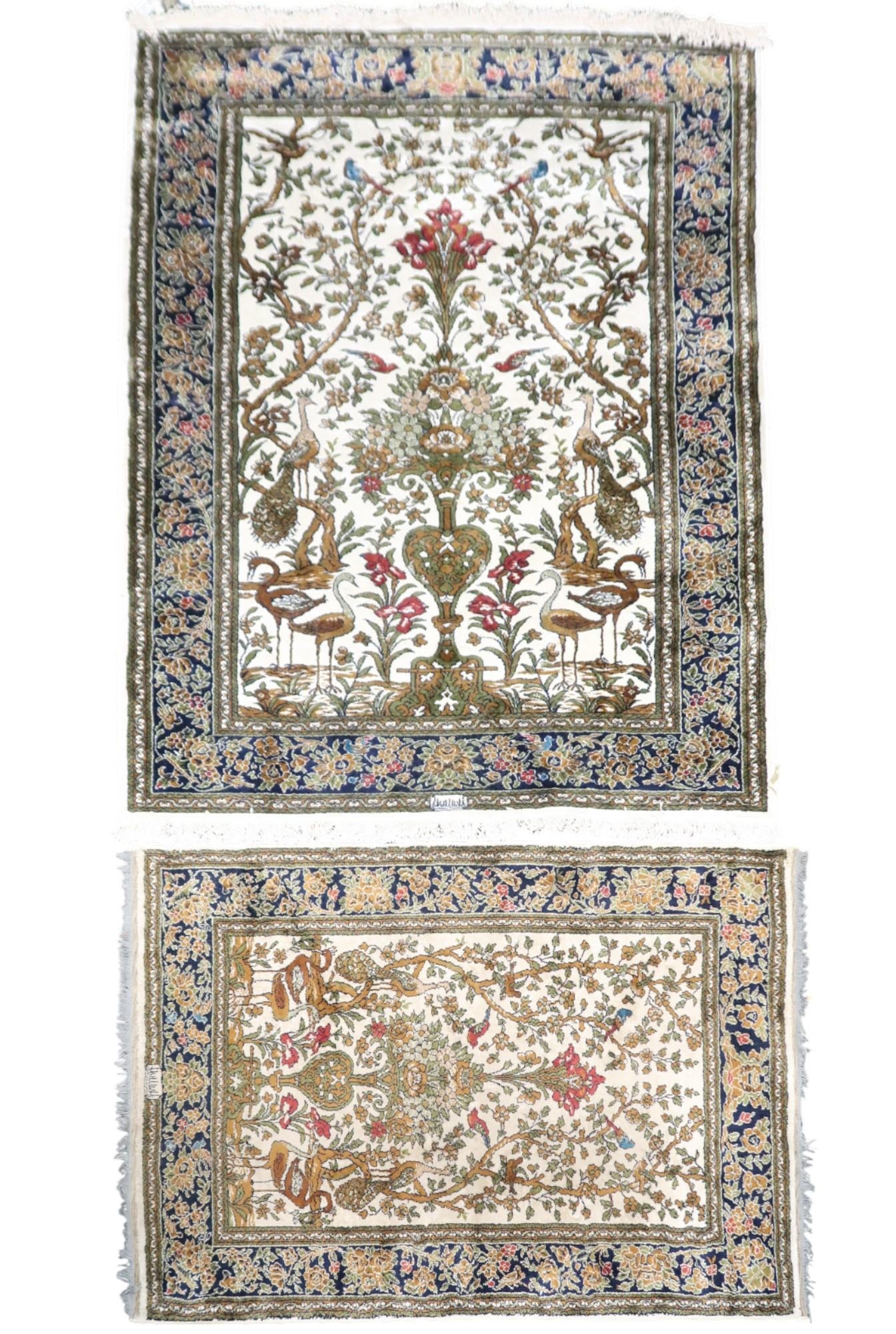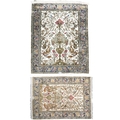A lot comprising a white ground tree of life rug with multicoloured floral/foliate ground within dark blue floral patterned border, 229cm long x 169cm wide and a smaller beige ground rug with matching pattern, 169cm long x 131cm wide (2)