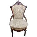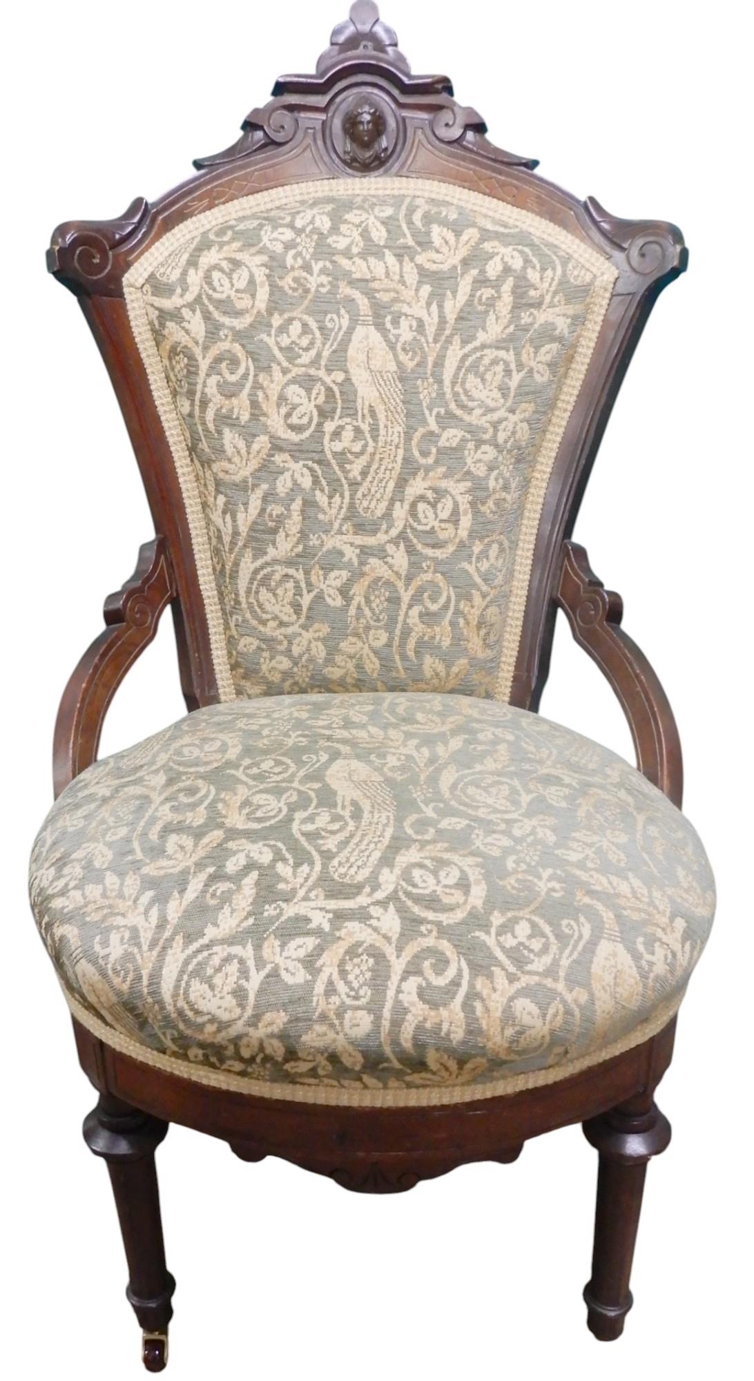 A late Victorian mahogany framed chair with carved back with foliate peacock brocade upholstered back and seat on reeded turned supports, 99cm high x 53cm wide x 68cm deep