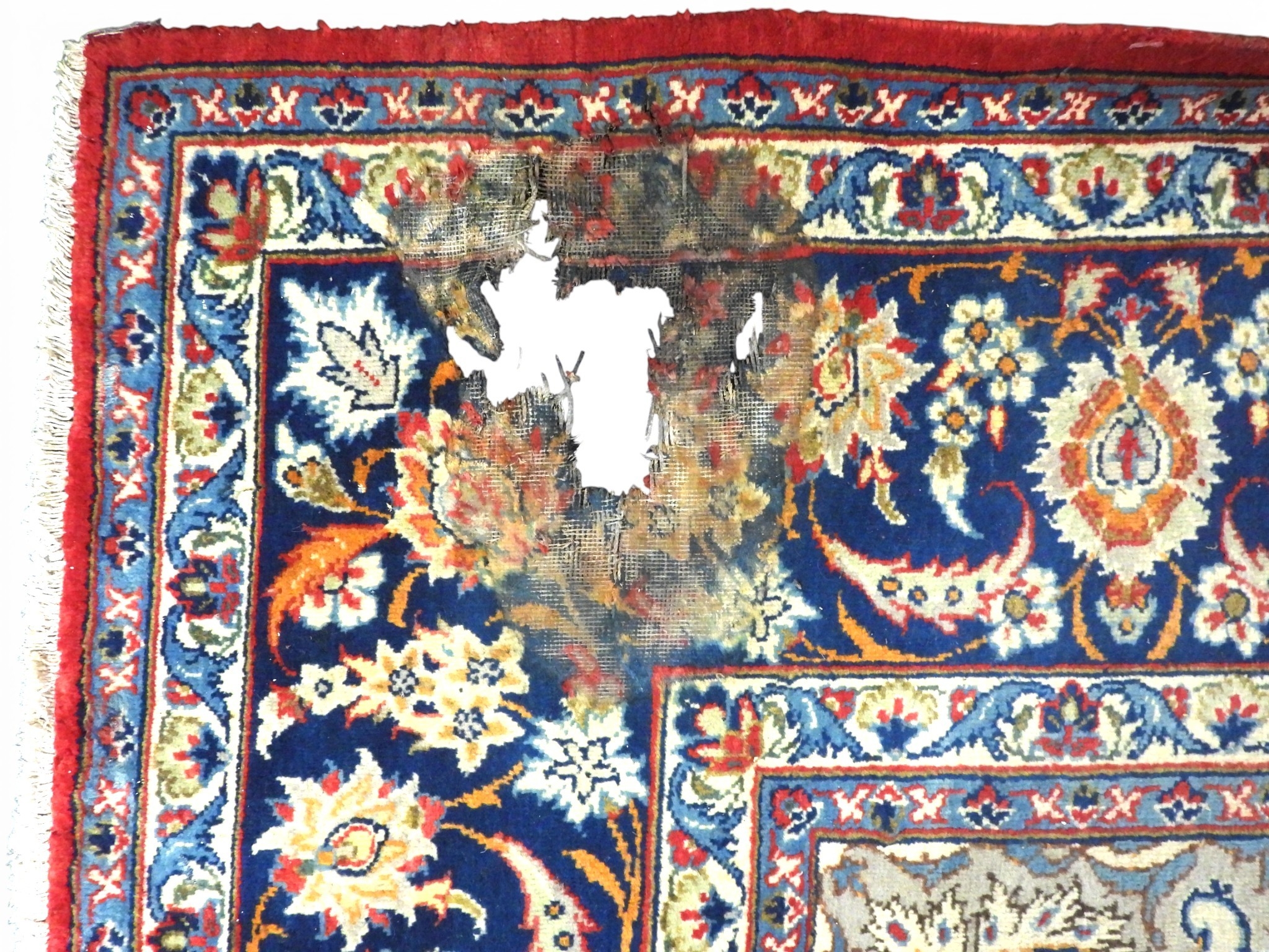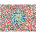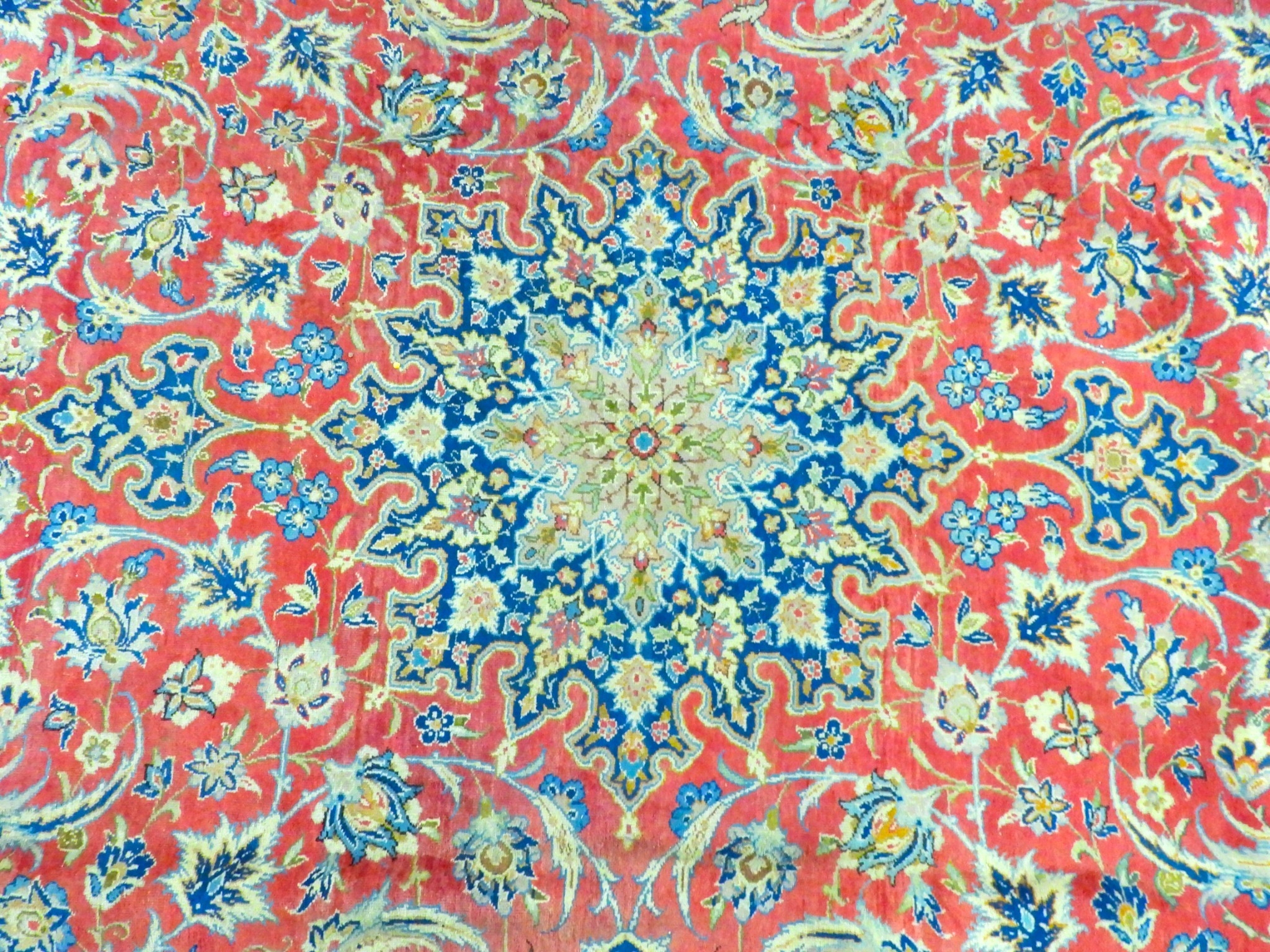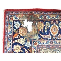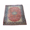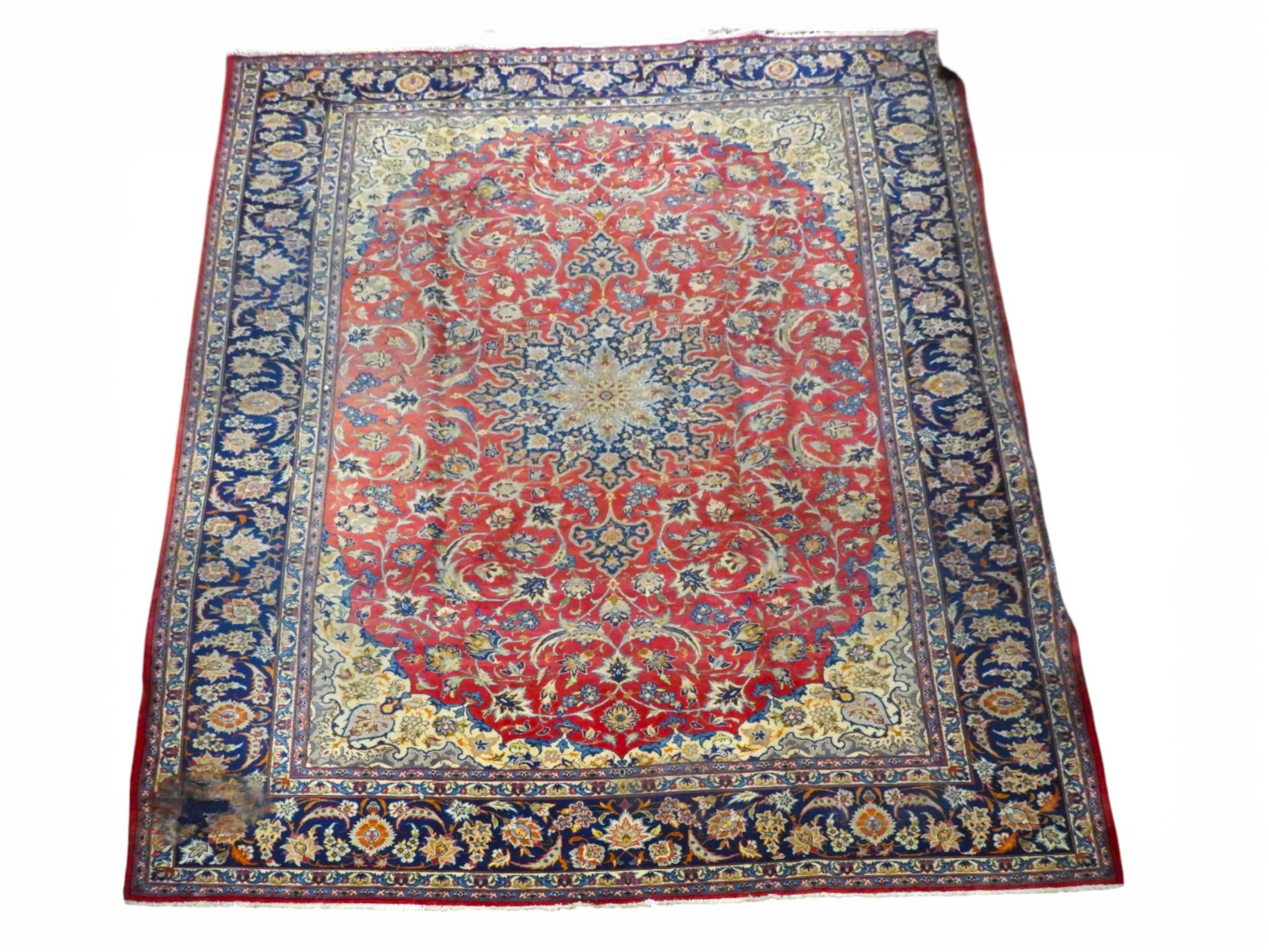 A terracotta ground Persian rug with cream and blue sunburst central medallion and matching spandrels on floral/foliate patterned ground within dark blue flowerhead border (def), 415cm long x 297cm wide