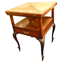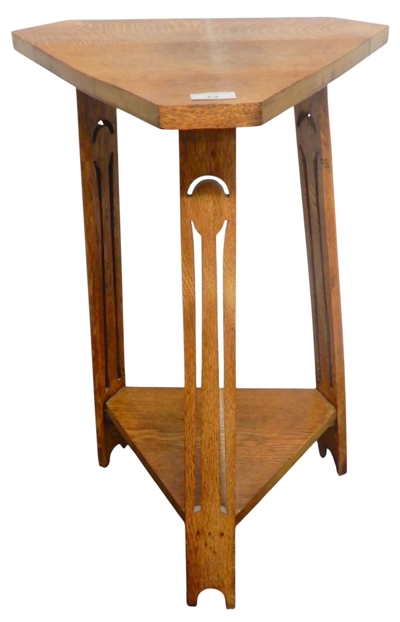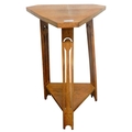 An early 20th century oak cricket style stable with shaped triangular top on three pierced supports joined by lower tier, 69cm high x 46cm wide x 40cm deep