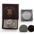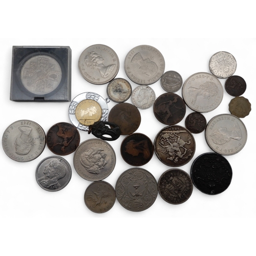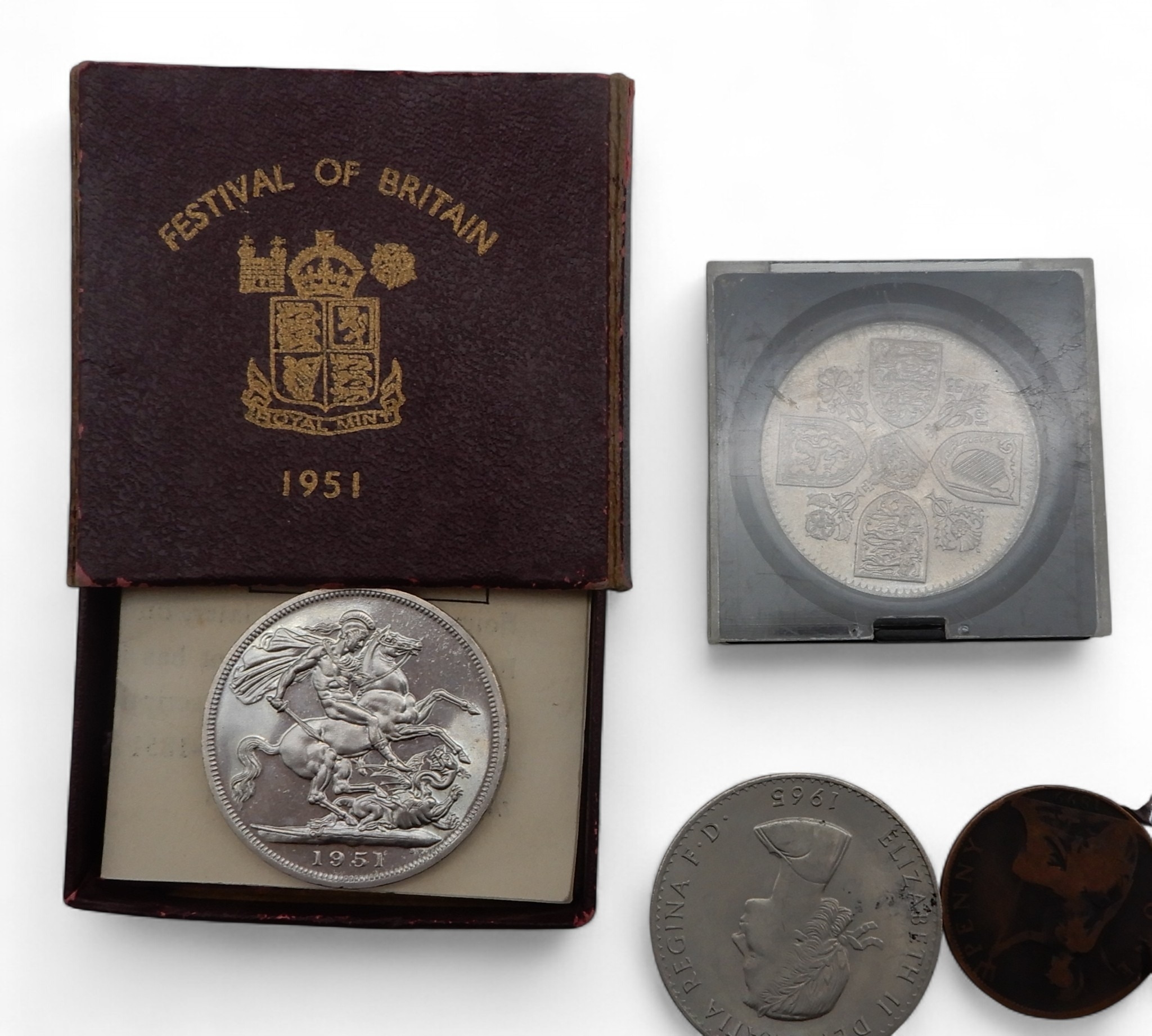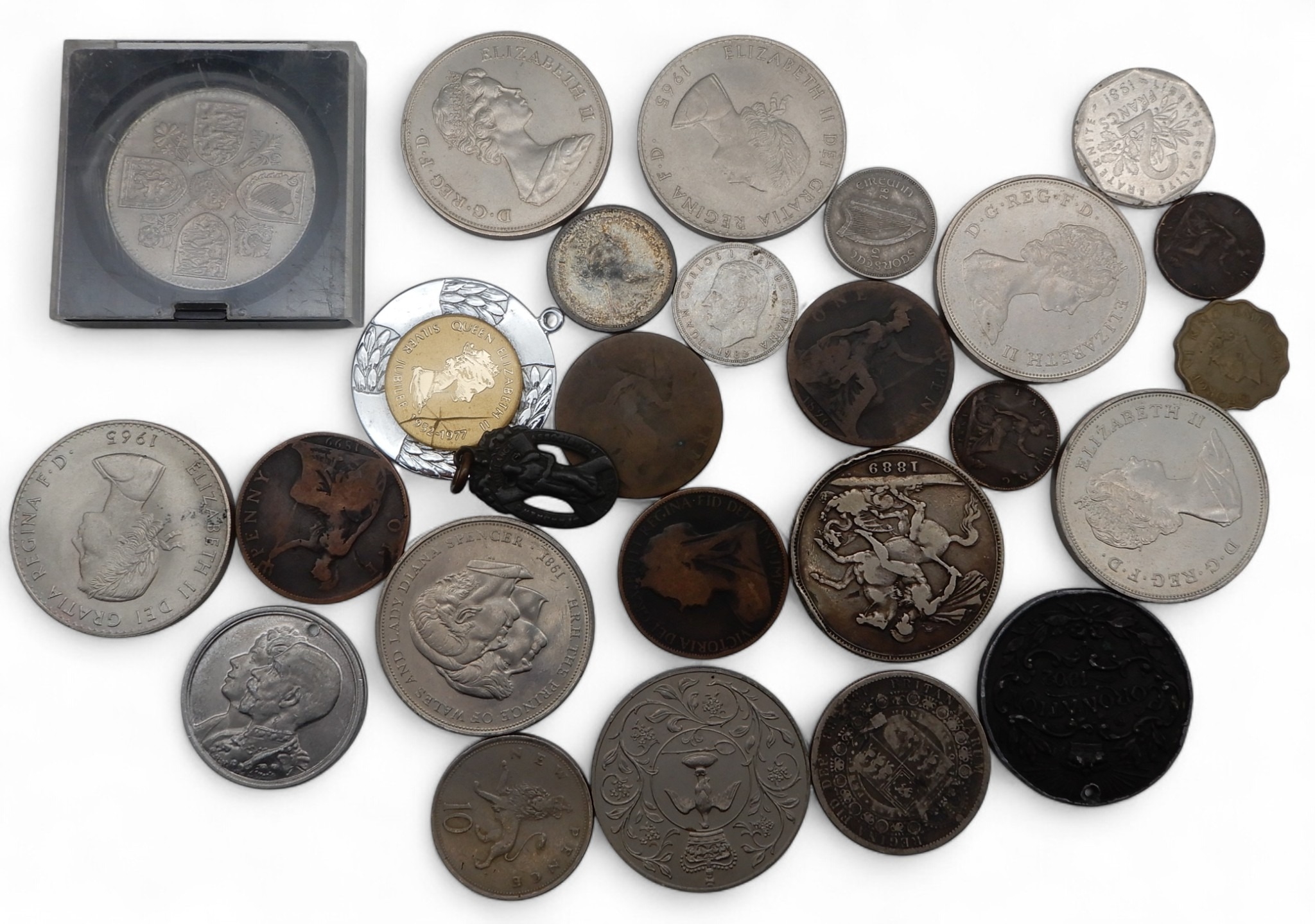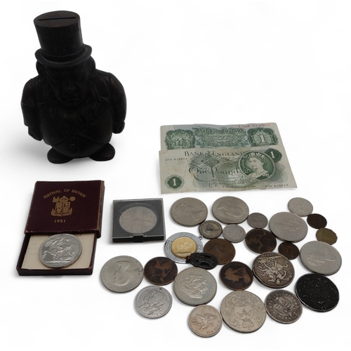A small collection of coins, banknotes and medals to include a Victoria crown 1889 together with a Paul Kruger novelty coin box