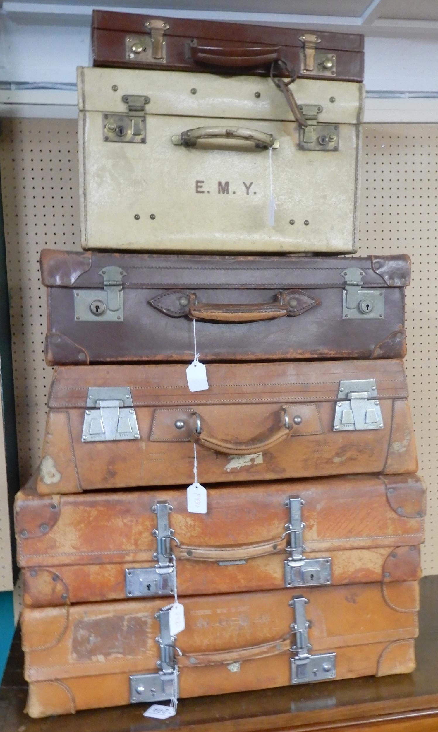 A lot of four assorted late 19th/early 20th century leather suitcases, cream leather hat box and a small leather attaché case (6)