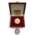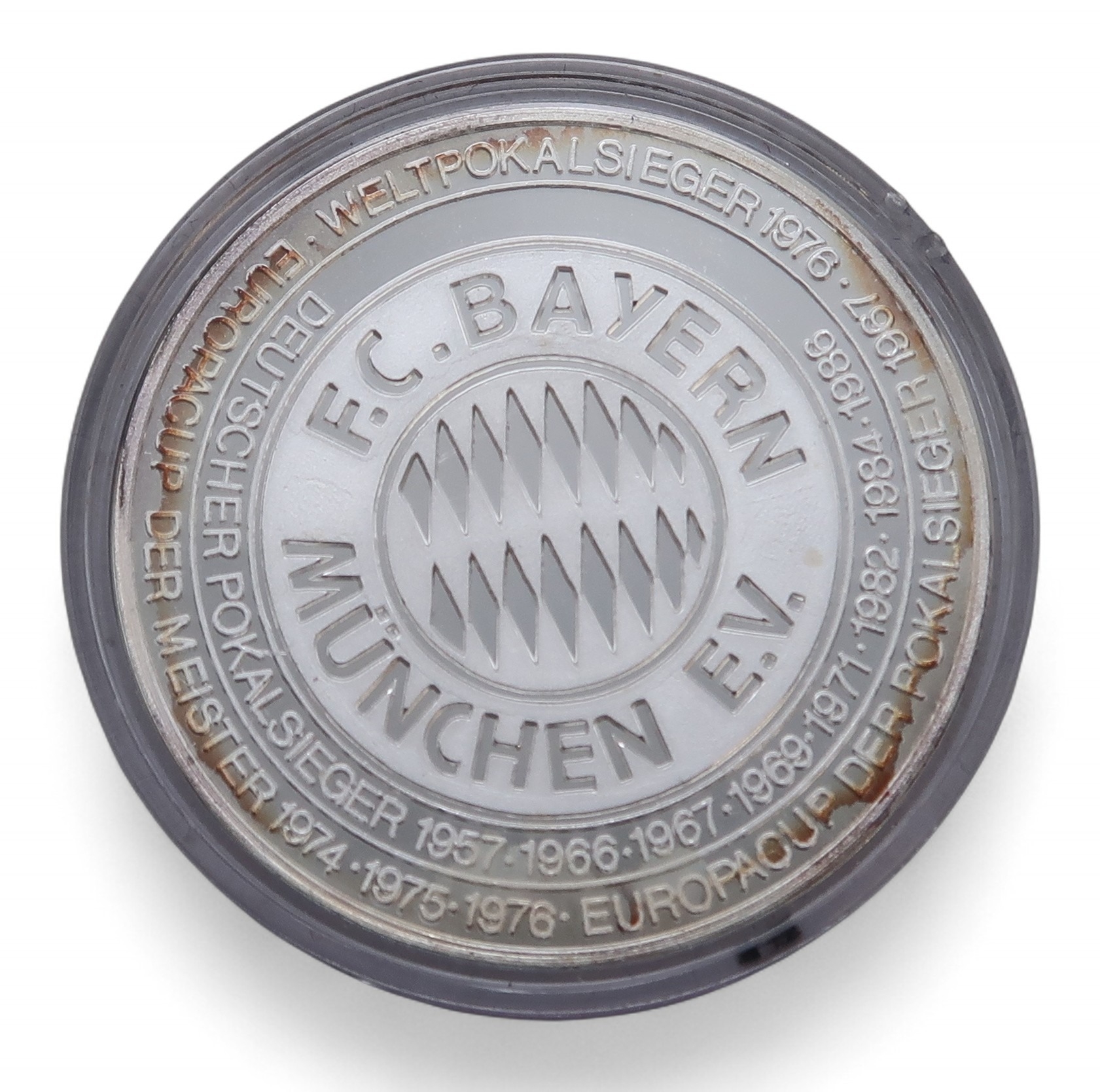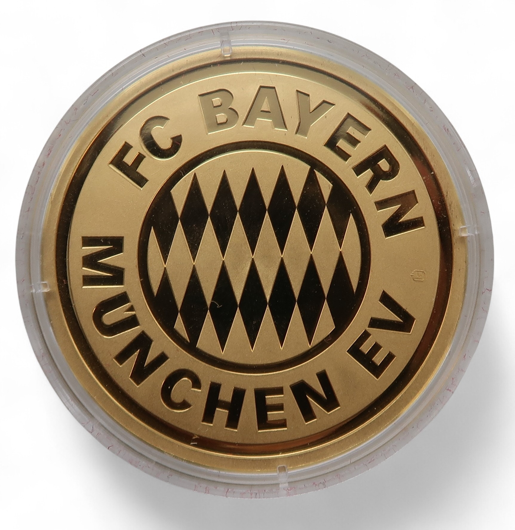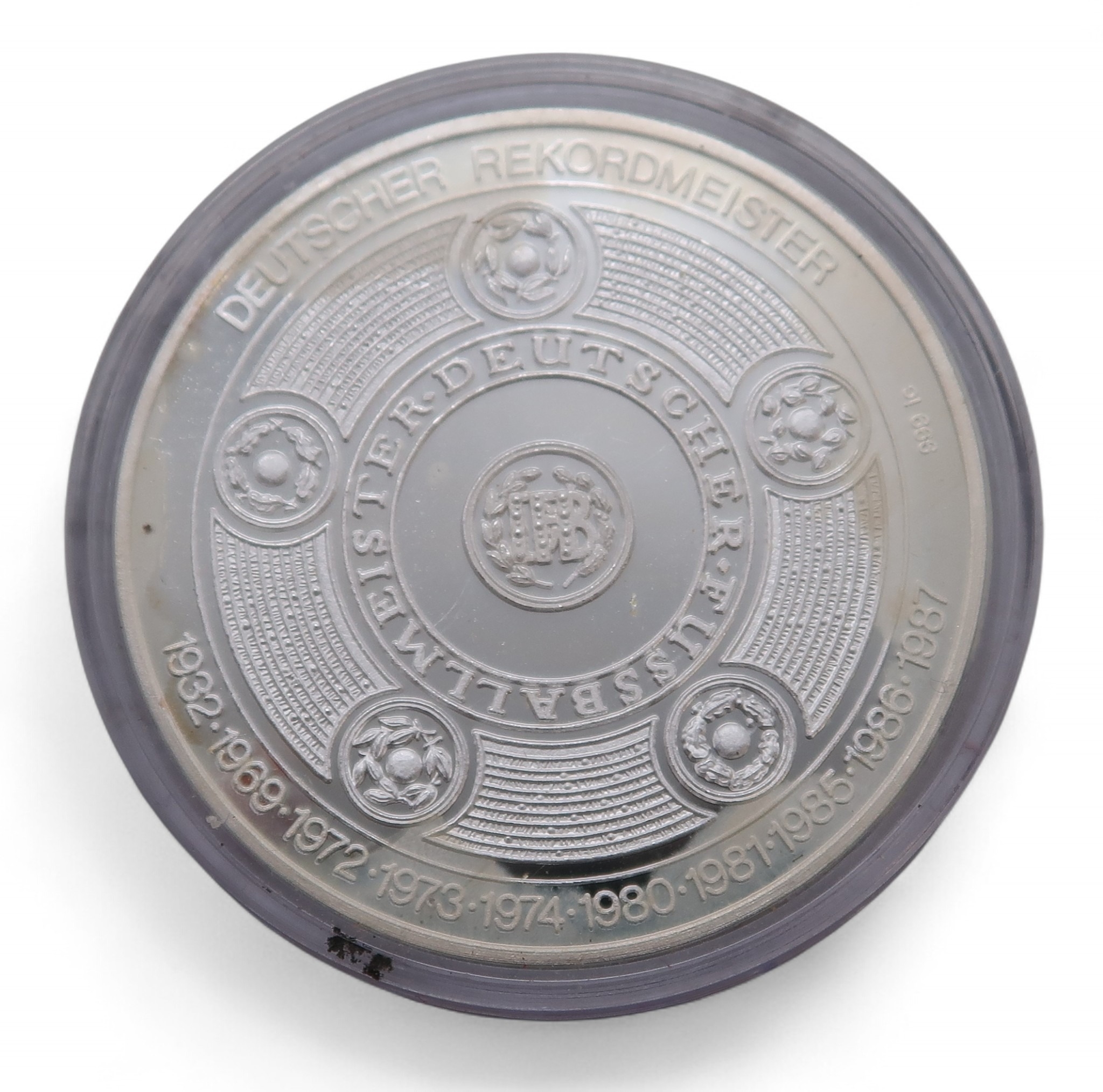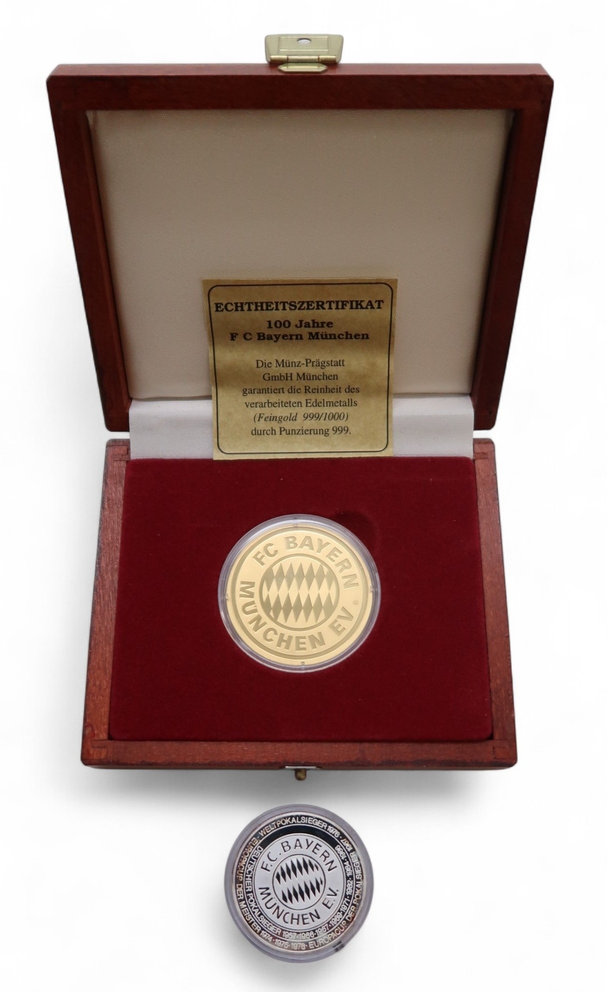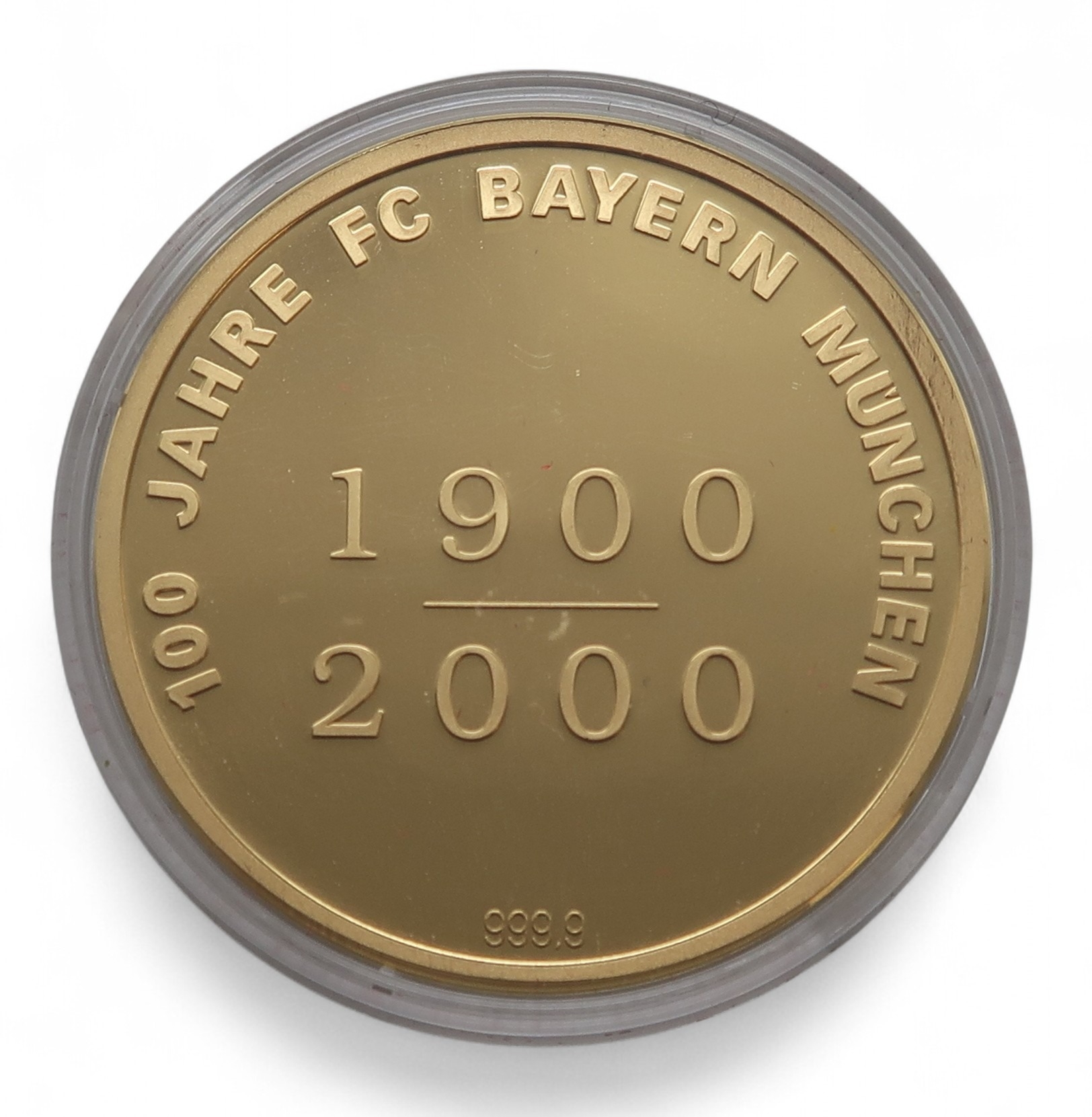 A 1900-2000 100th Anniversary commemorative medallion in 999.9 fine gold, weight 30.5g, in presentation case, with certificate of authenticity; and a Deutscher Rekordmeister (German Record Champion) example in 999 fine silver, weight 15.1g (2)