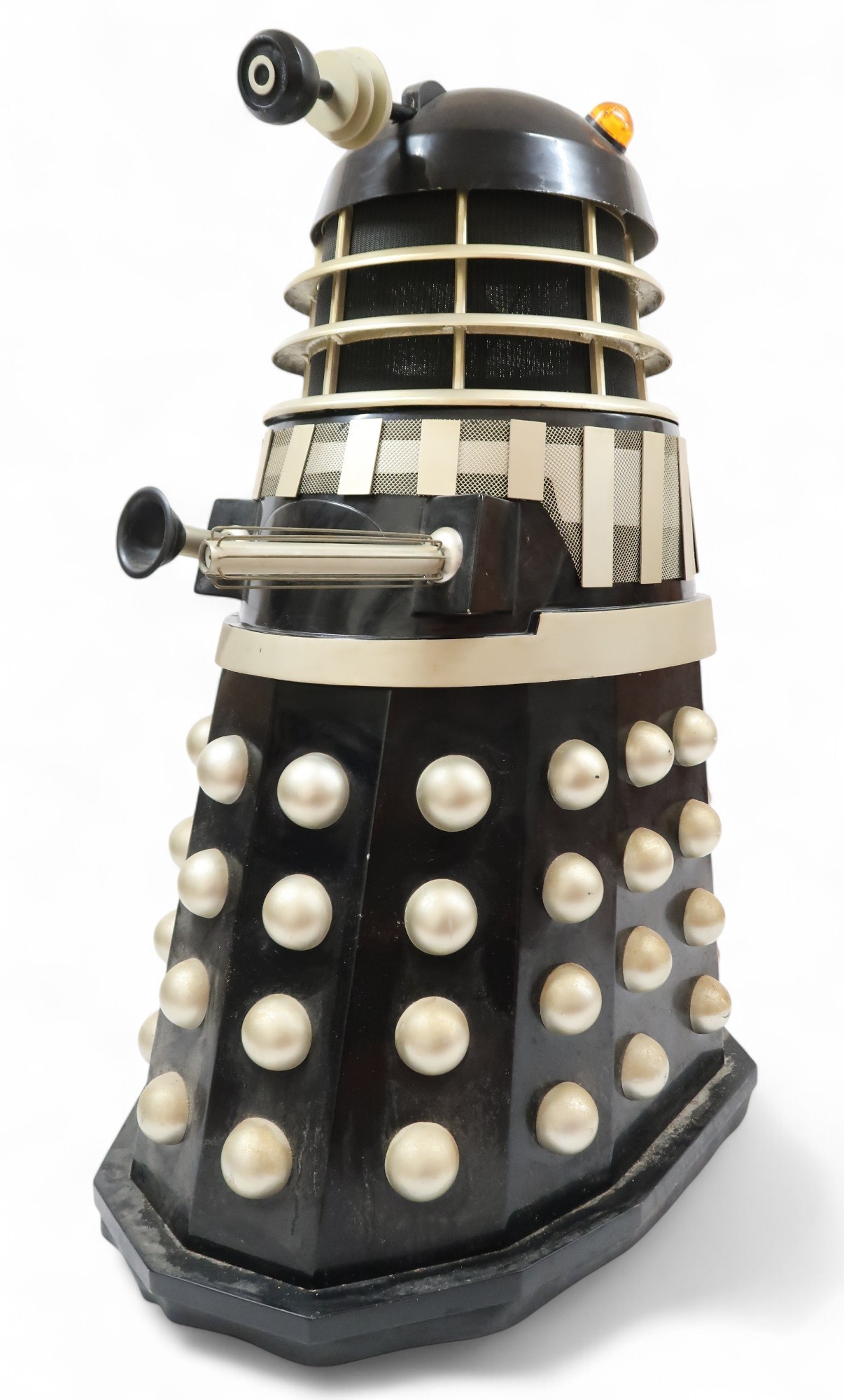 Of wood and fibreglass sectional construction, manufactured by This Planet Earth Ltd., with plaque affixed internally reading "'the Dalek' from Remembrance of the Daleks, taken from original BBC mouldings, Serial No. 15397A"