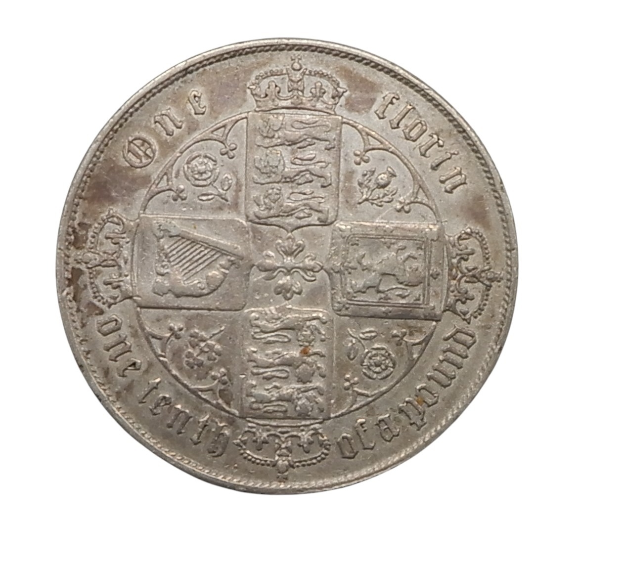 Crowned cruciform shields of England, Scotland and Ireland, national flower emblems in angles, legend around One florin