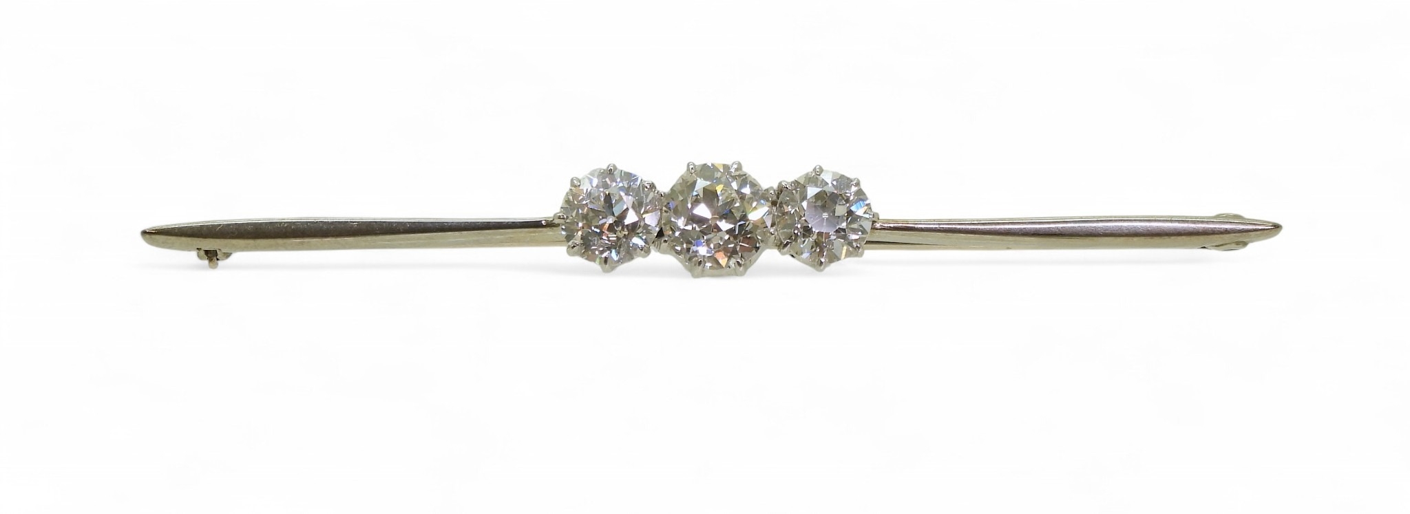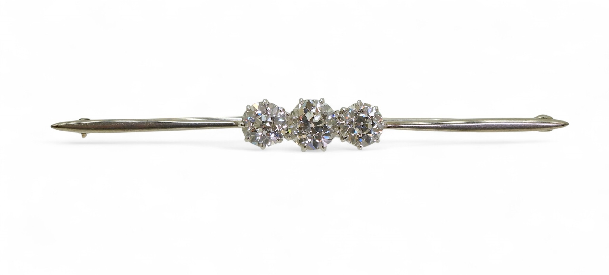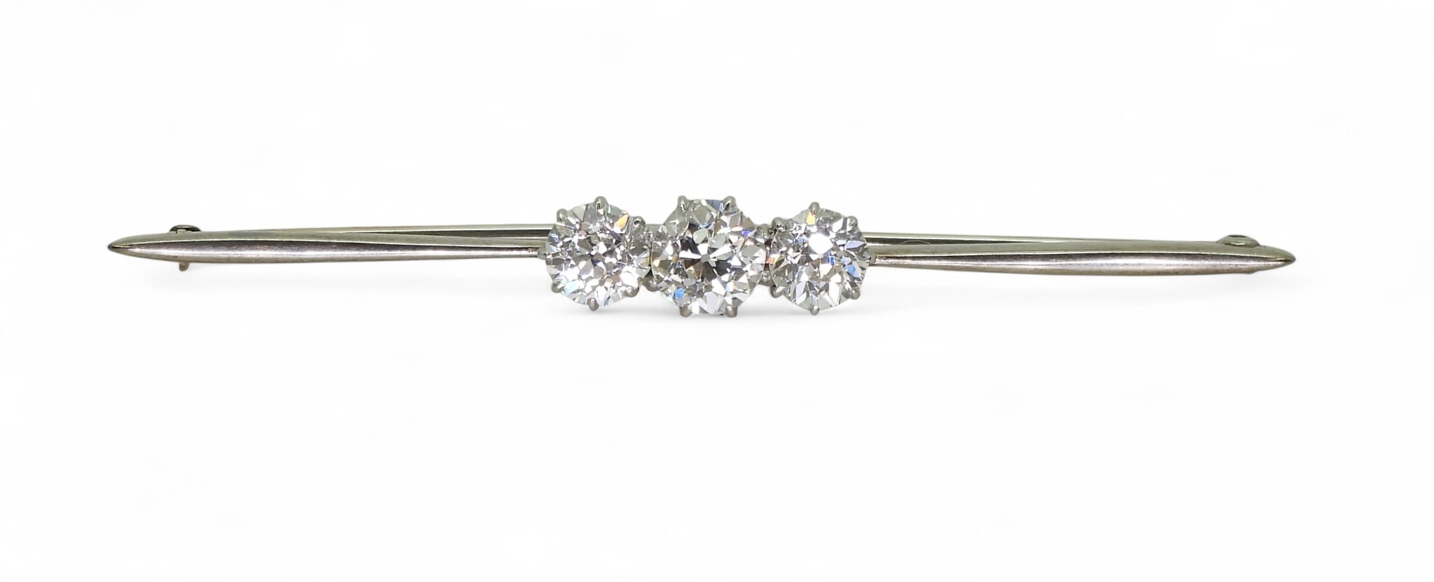 set with estimated approx 2.50cts of old cut diamonds, in a white metal bar brooch with classic crown mounts. Length 6.8cm, weight 5.5gms