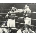 A large black and white photograph of Muhammad Ali and Joe Frazier signed by both boxers in silver felt-tip and measuring approx. 51cm x 40.5cm, requiring re-framing, with accompanying certificate of authenticity from Pride Records Limited