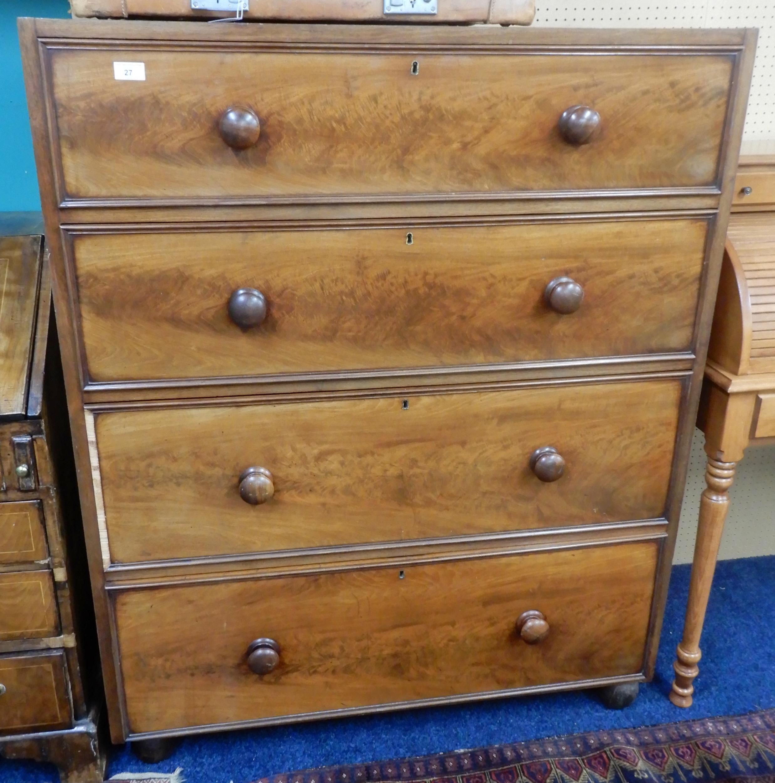 A 19th century mahogany chest of drawers with four long drawers with turned handles on bun feet, 130cm high x 104cm wide x 51cm deep