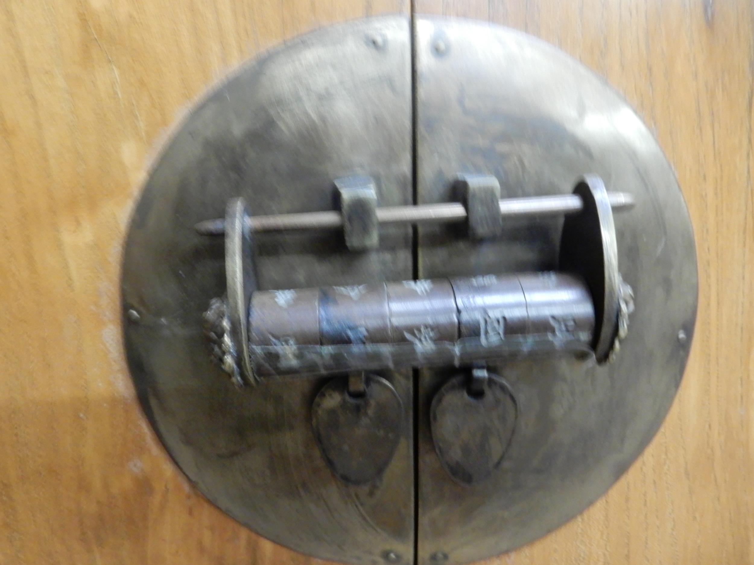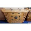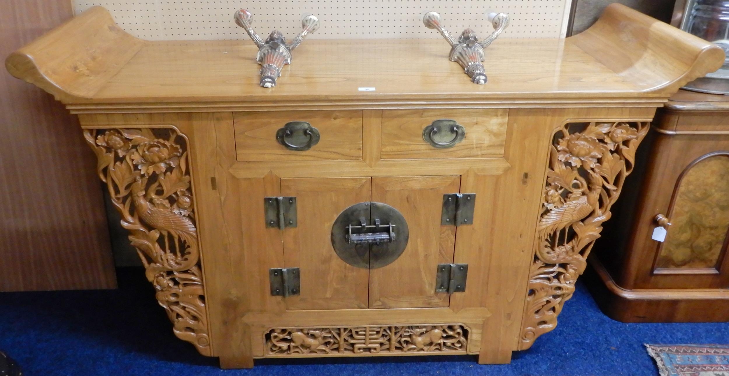 A 20th century Chinese elm altar style side cabinet with upturned top over two short drawers and pair of cabinet doors with combination lock flanked by carved pierced friezes depicting peacocks amongst flowers, 93cm high x 160cm wide x 51cm deep