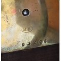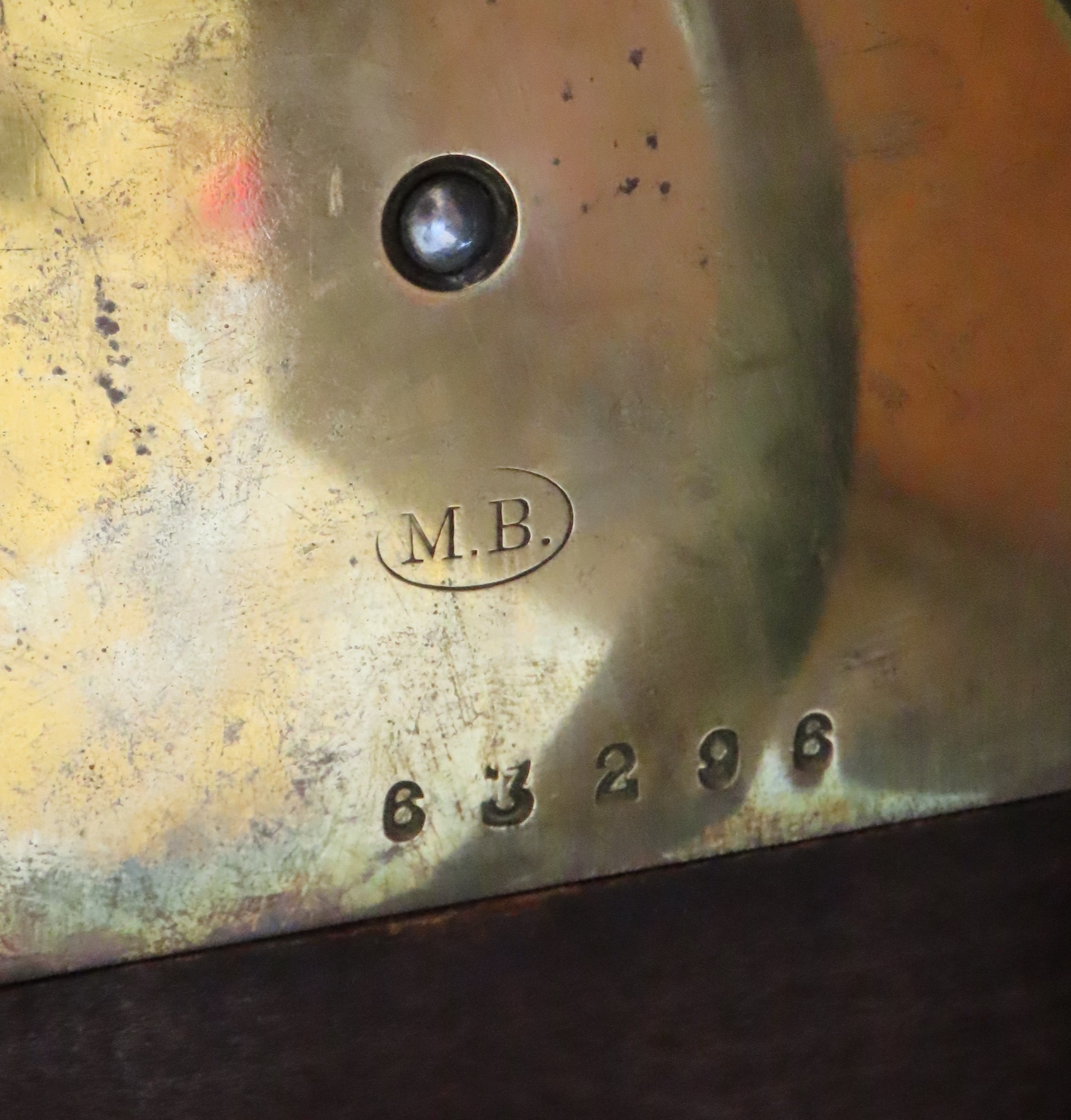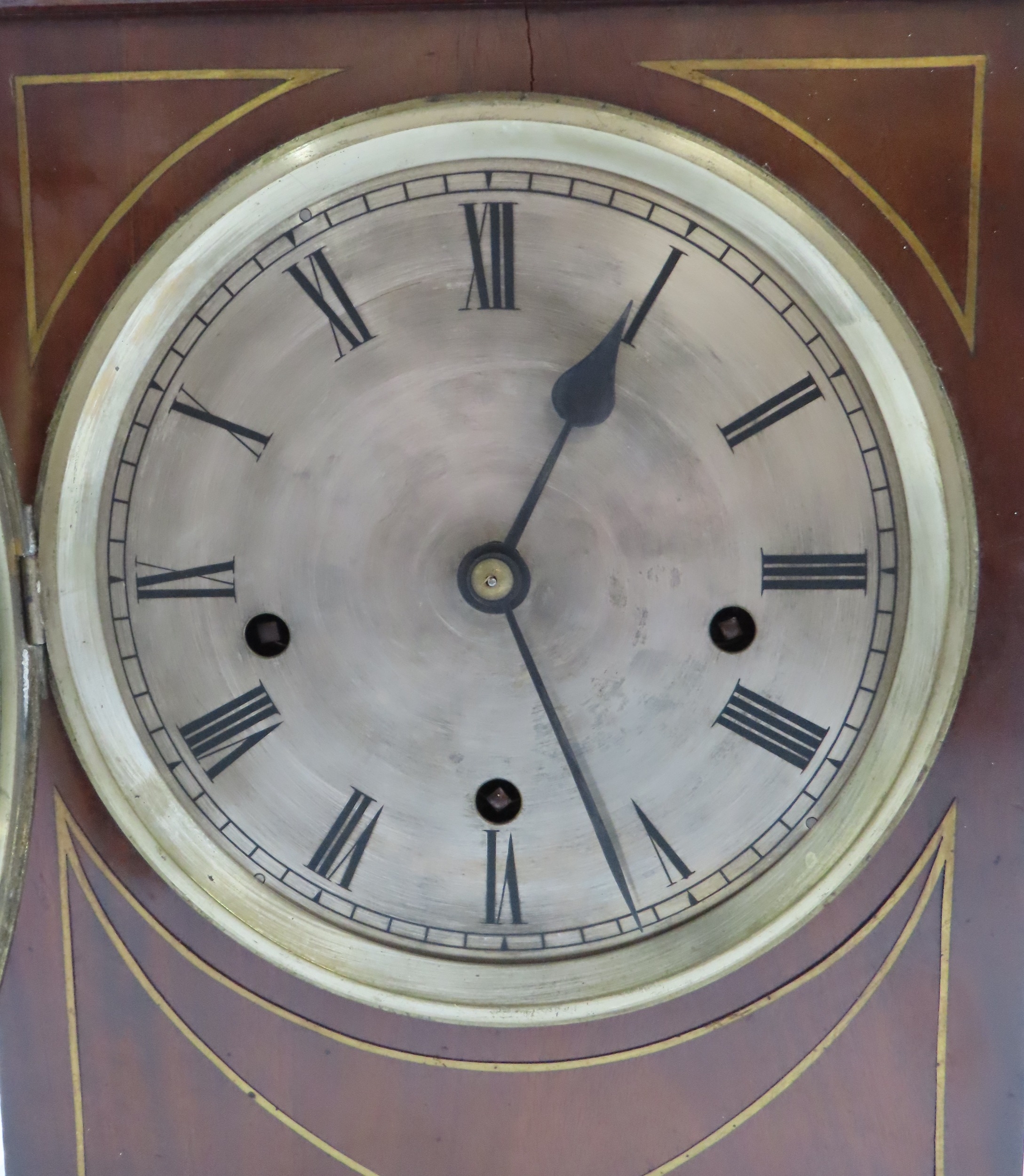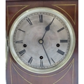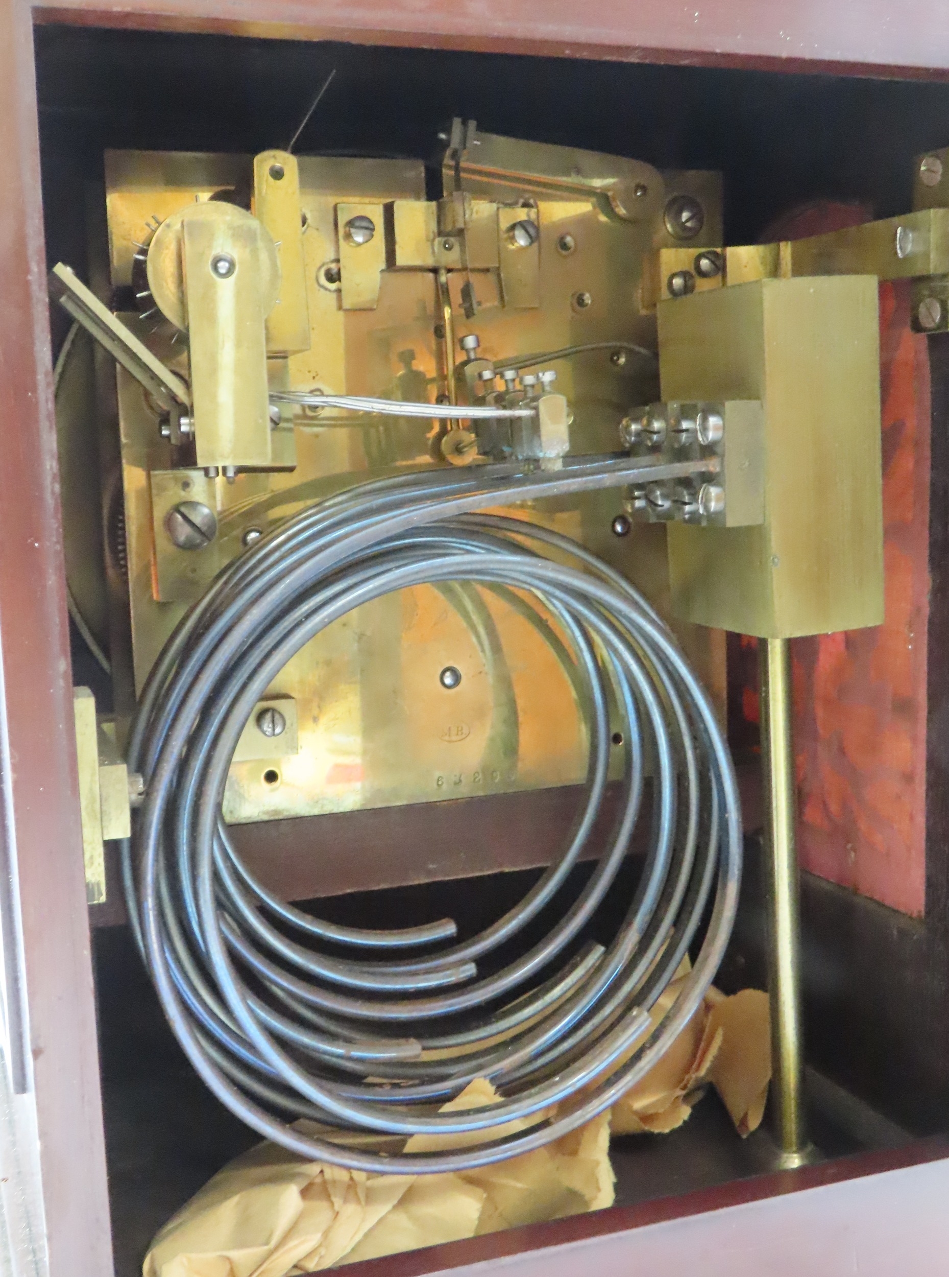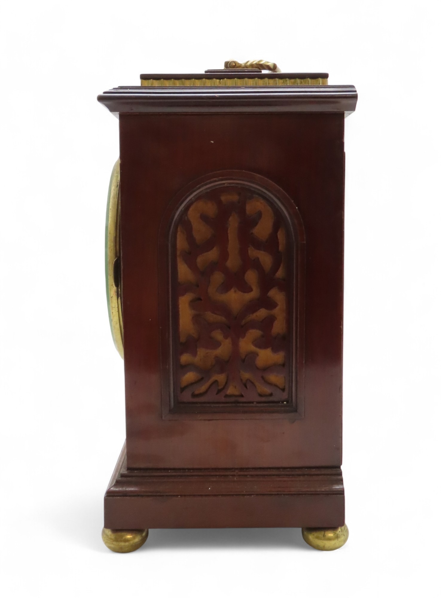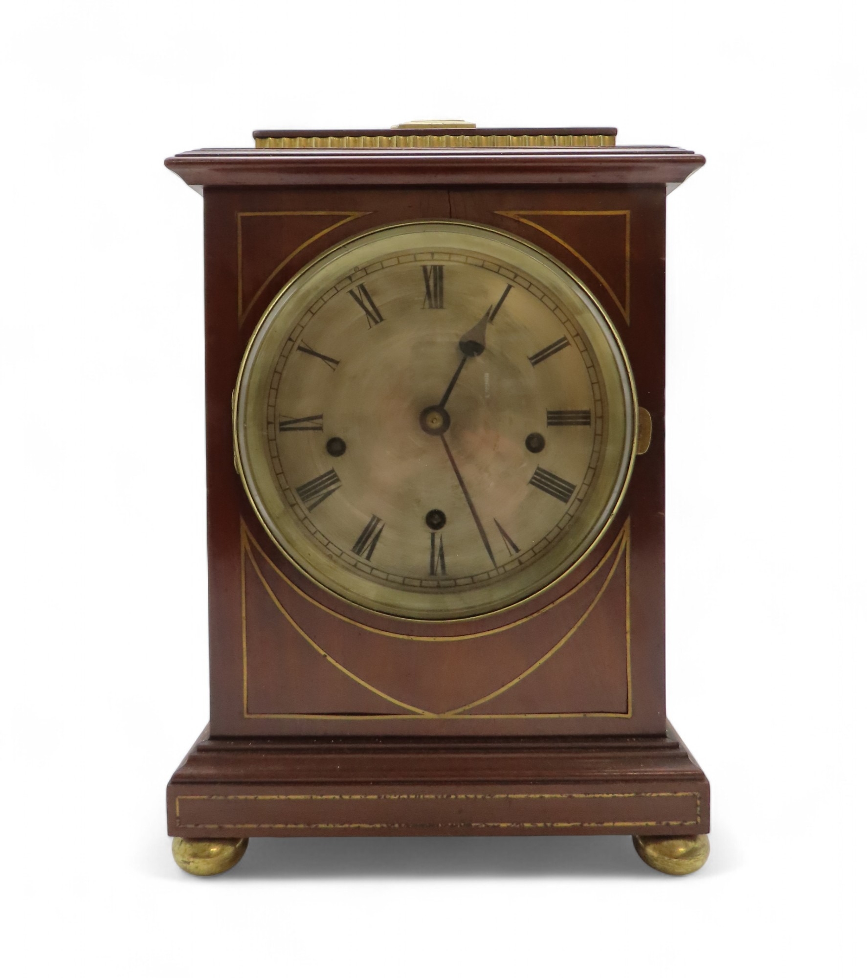with inlaid brass detail, the silvered dial with roman numerals, the brass movement marked MB in an oval, with numbers 63296, the case with bun feet, and carrying handle, 41cm high