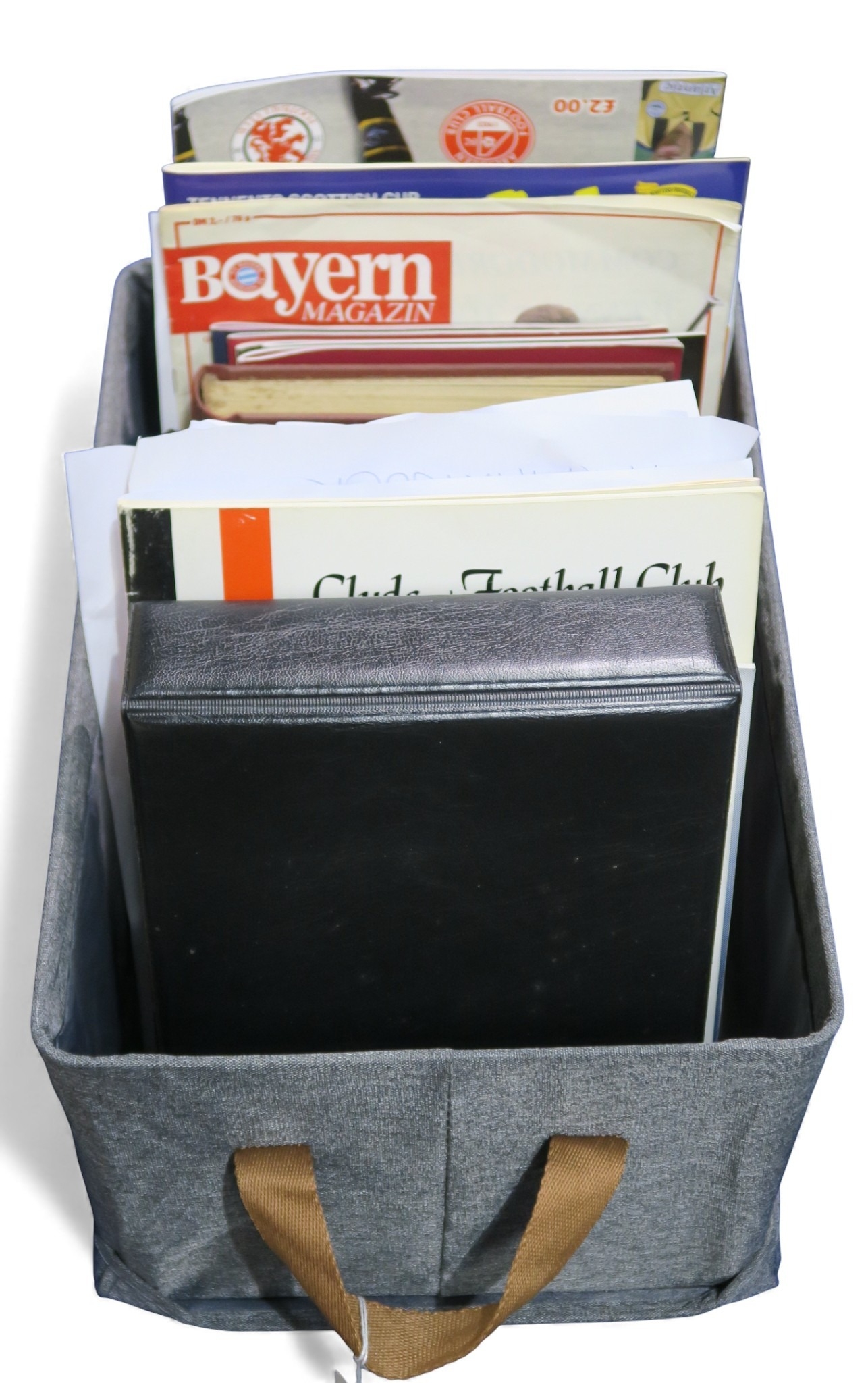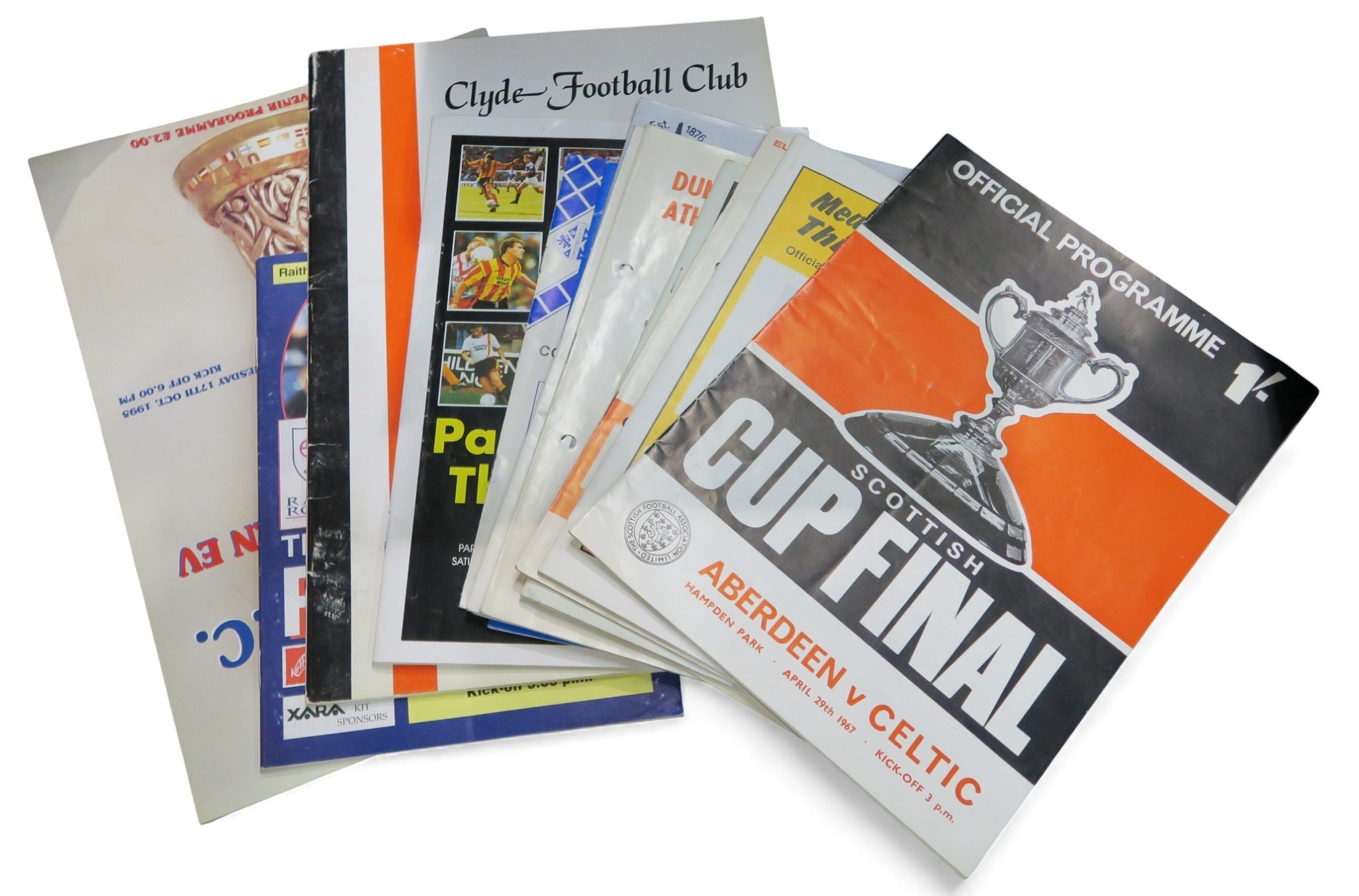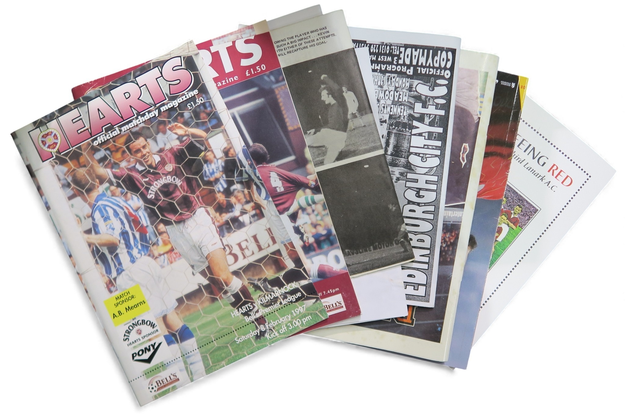A collection of Scottish club football programmes, mostly 1970s and later, with some earlier, including two bound volumes of Hearts' 1980-81 season, a 1966 Inter City Fairs Cup Hearts vs. Real Zargoza programme bearing numerous signatures and a 1962 East Fife vs. Sportsklubben Brann programme; with Hibernian, Aberdeen, Dundee United and Kilmarnock programmes examples