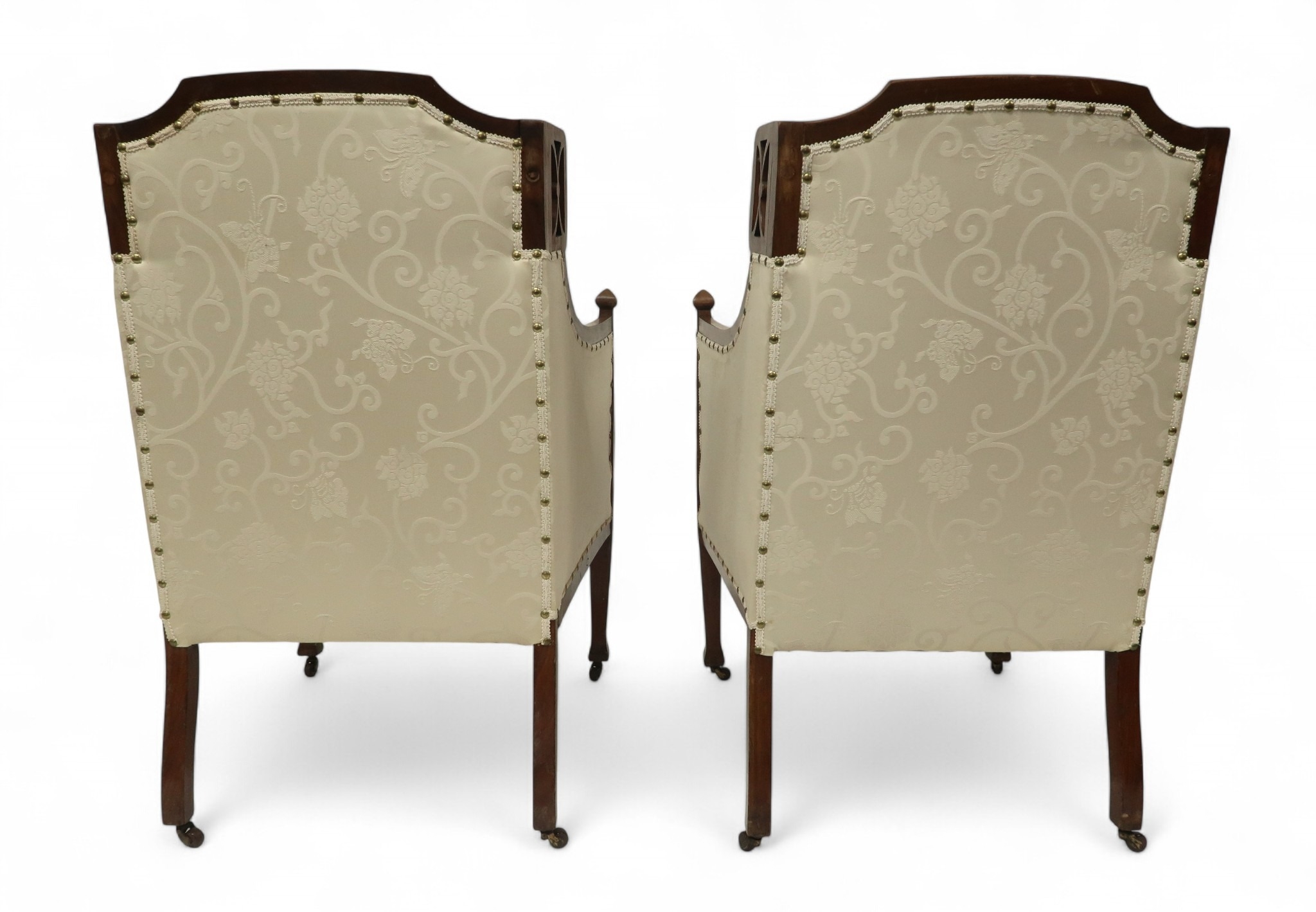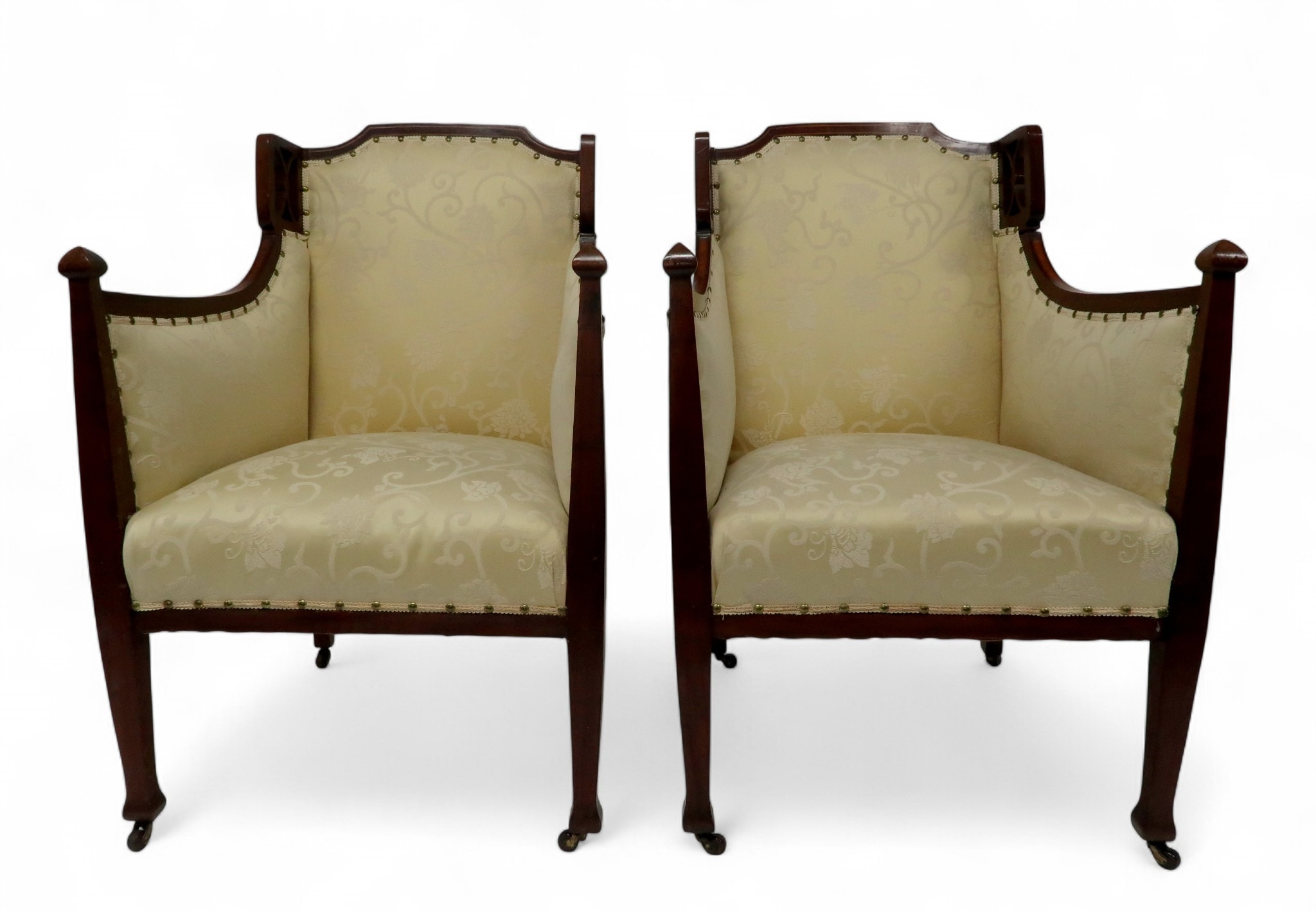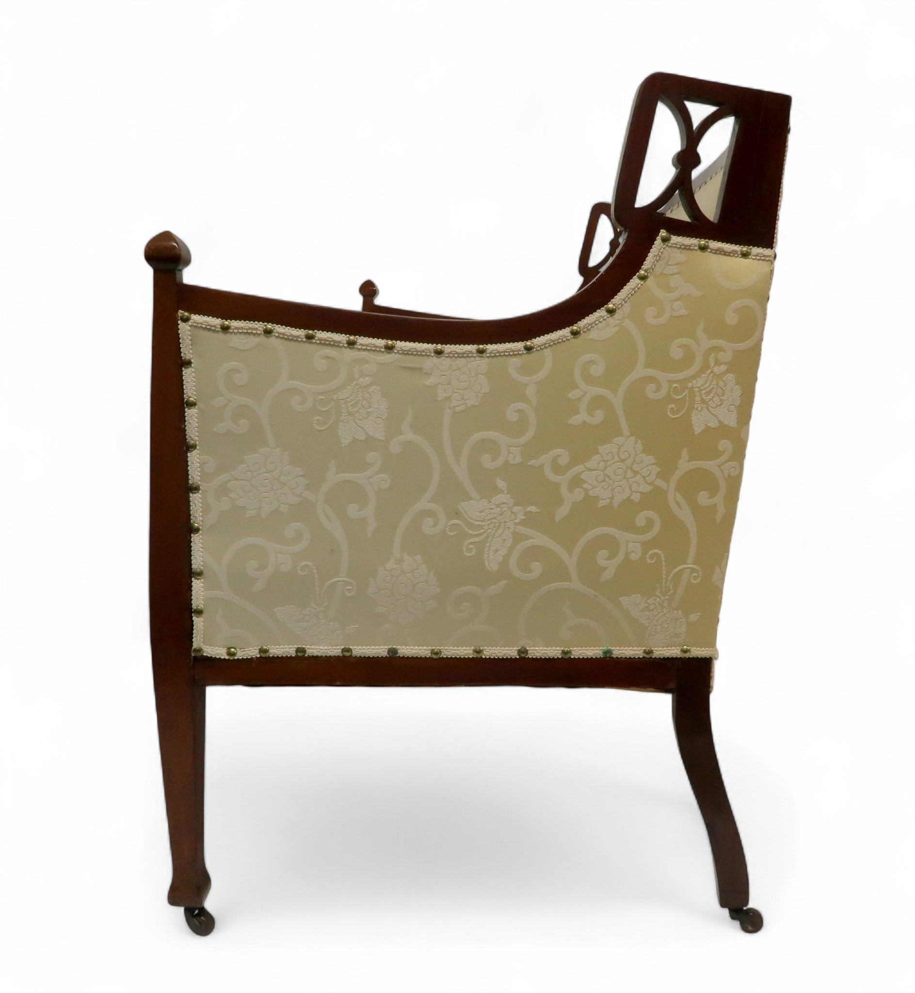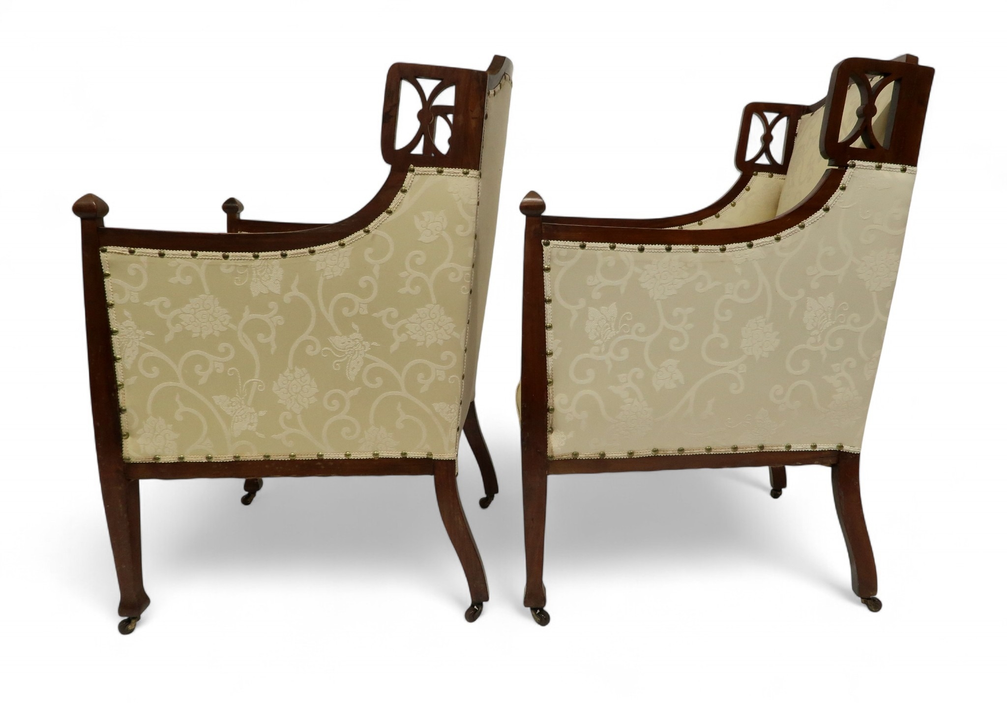 consisting two seater settee, 94cm high x 127cm wide x 67cm deep and pair of accompanying armchairs 98cm high x 65cm wide x 70cm deep all with stylized pierced framework over cream foliate patterned upholstery on square tapering front supports (3)