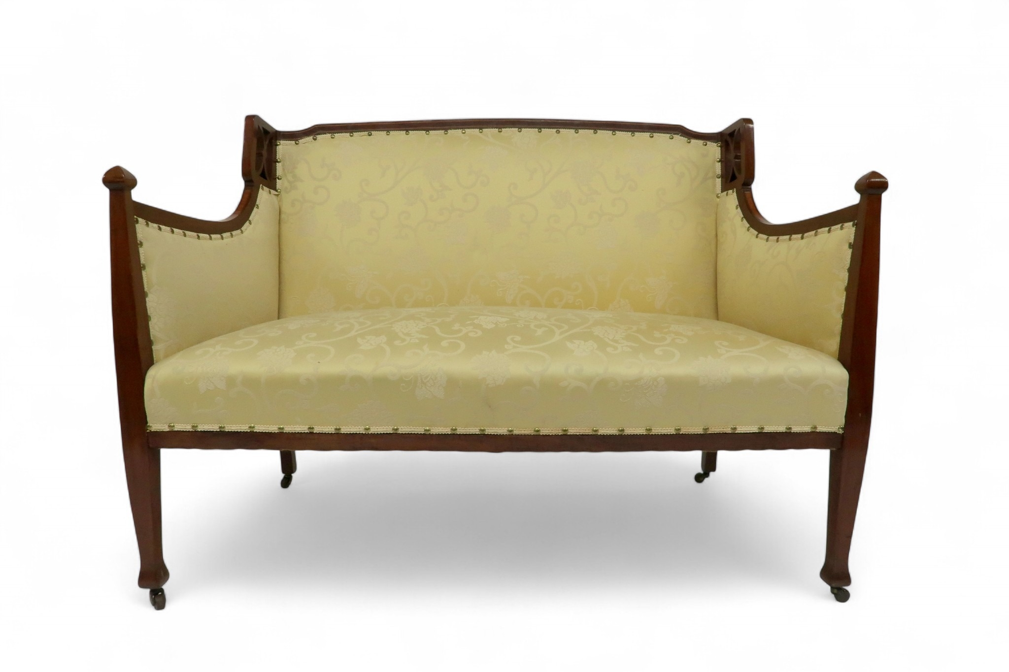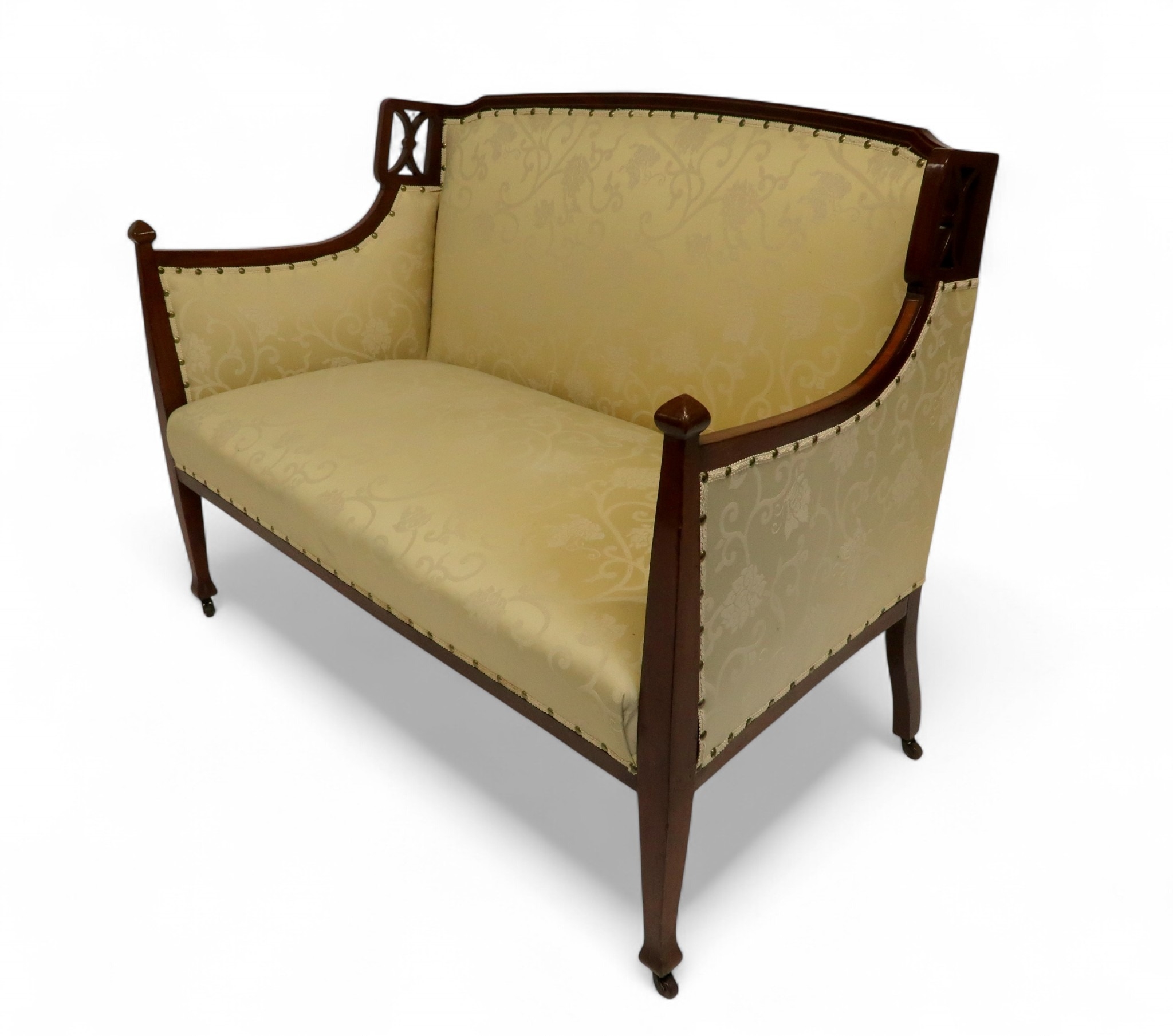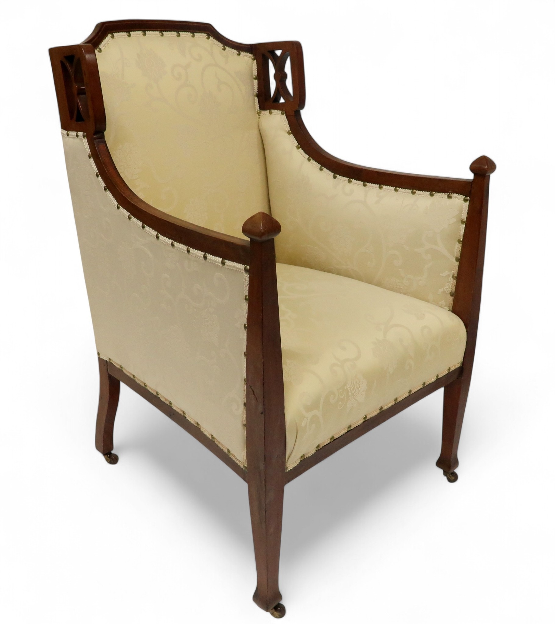 consisting two seater settee, 94cm high x 127cm wide x 67cm deep and pair of accompanying armchairs 98cm high x 65cm wide x 70cm deep all with stylized pierced framework over cream foliate patterned upholstery on square tapering front supports (3)