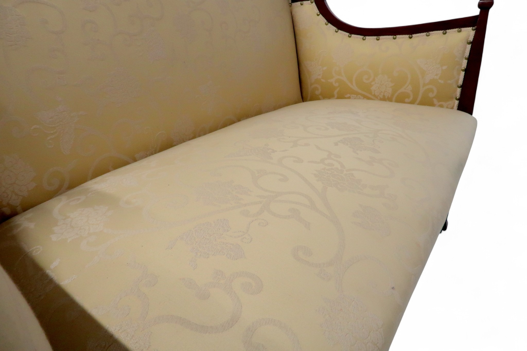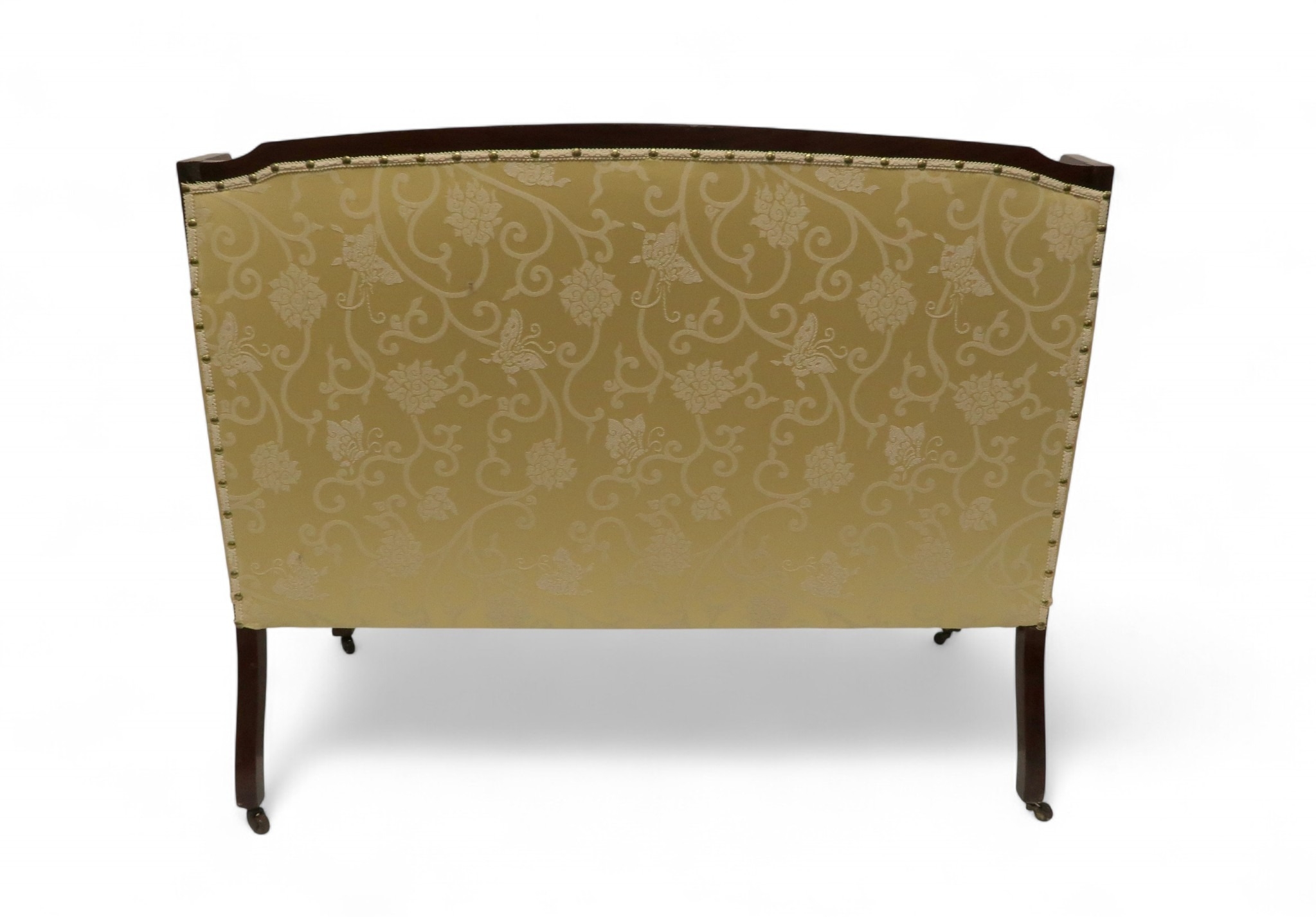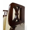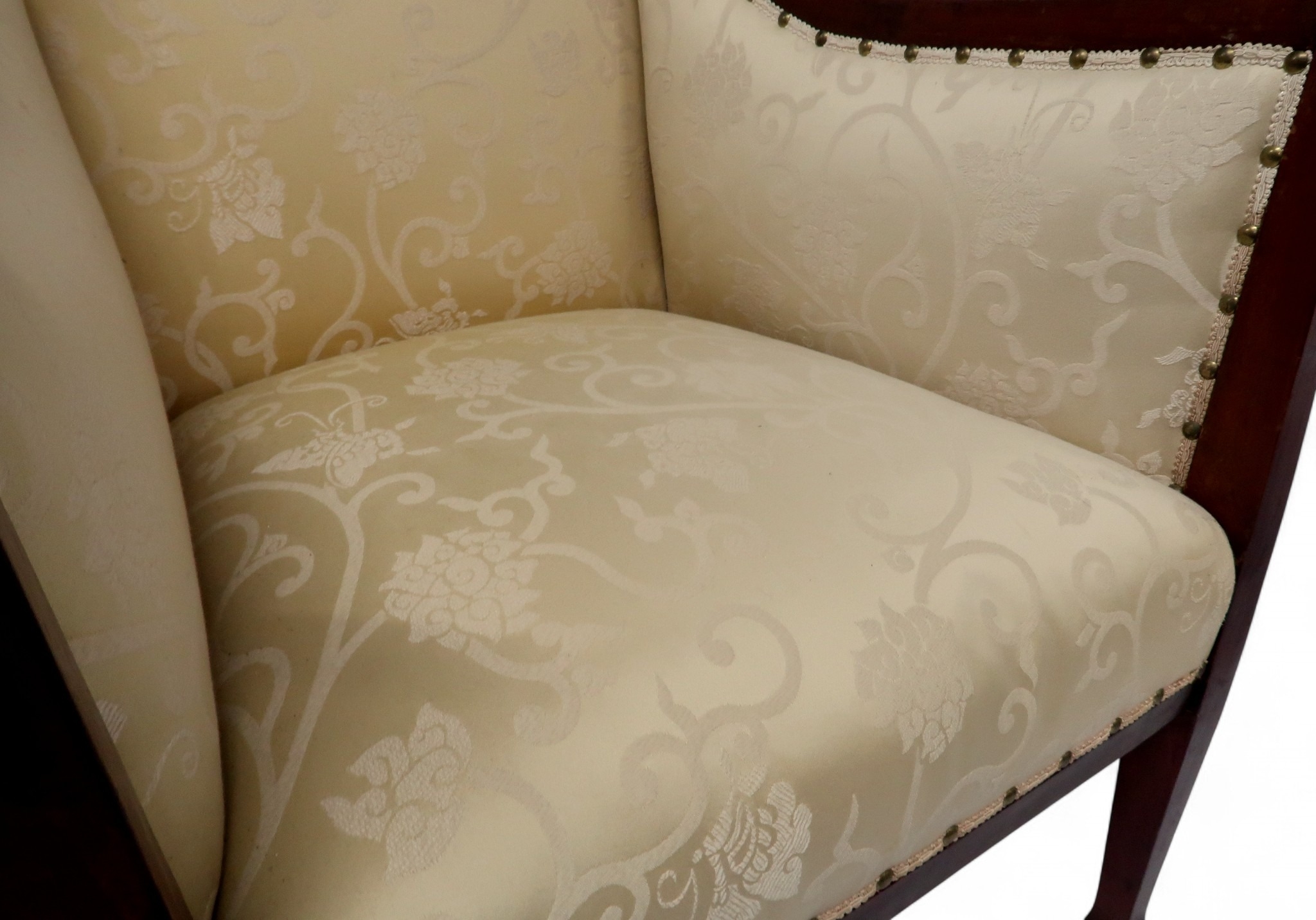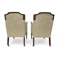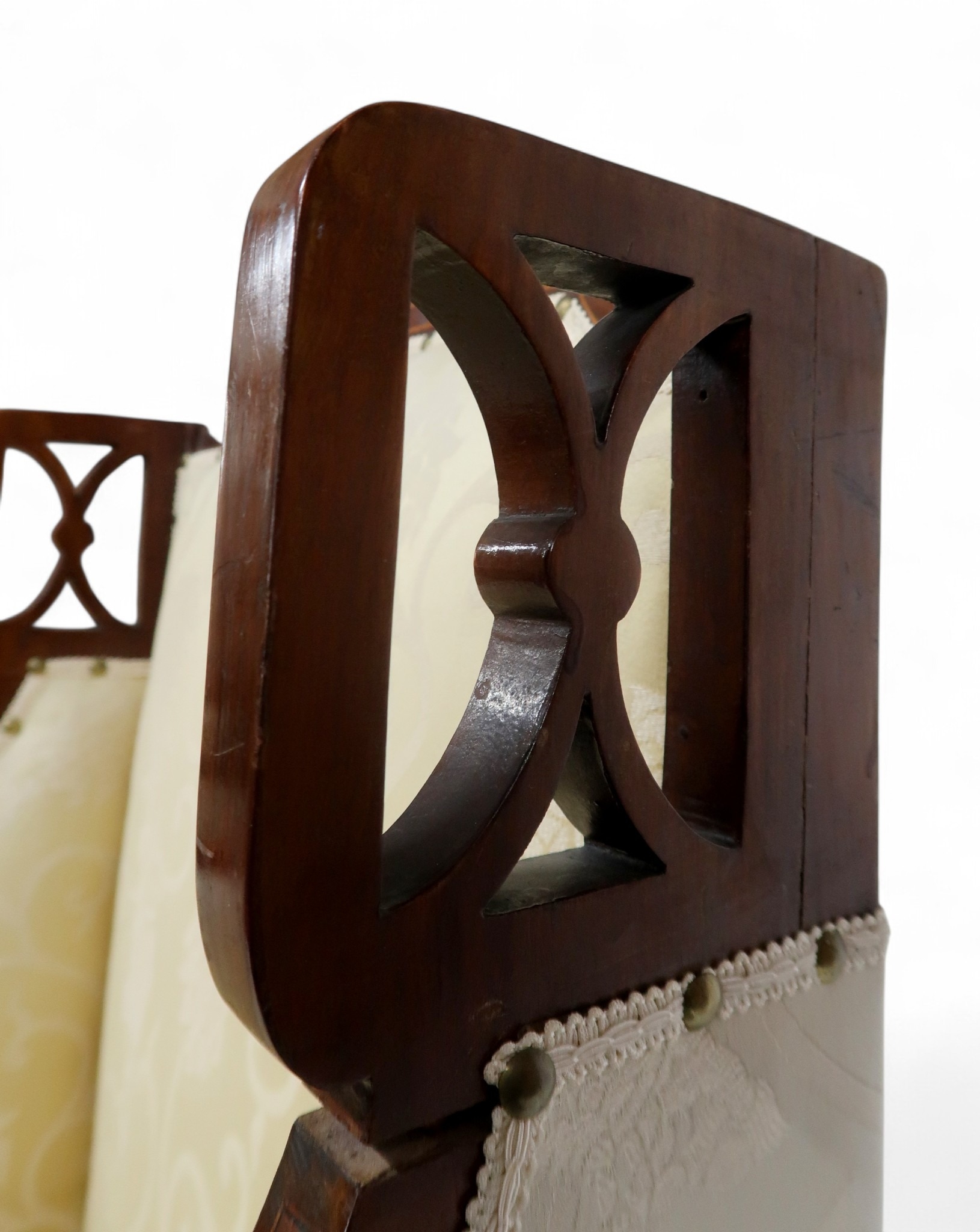 consisting two seater settee, 94cm high x 127cm wide x 67cm deep and pair of accompanying armchairs 98cm high x 65cm wide x 70cm deep all with stylized pierced framework over cream foliate patterned upholstery on square tapering front supports (3)