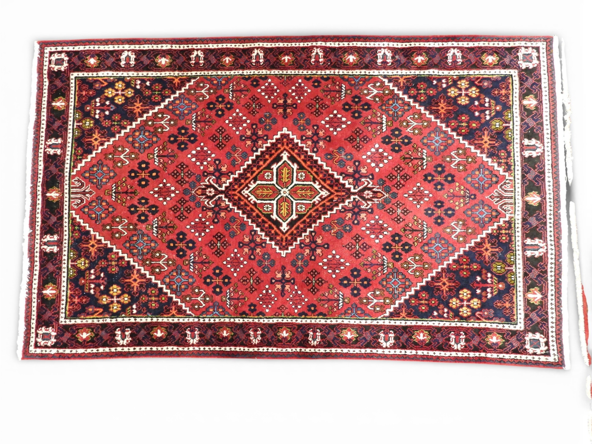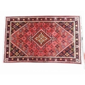 A dark red ground Persian rug with multicoloured geometric central medallion and matching spandrels on geometric floral patterned ground within dark floral decorated border, 214cm long x 132cm wide