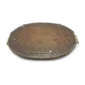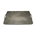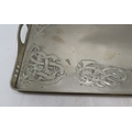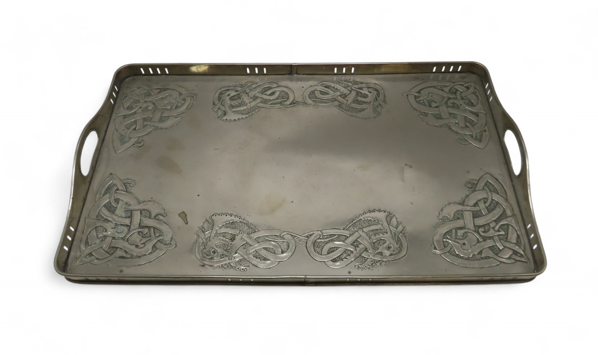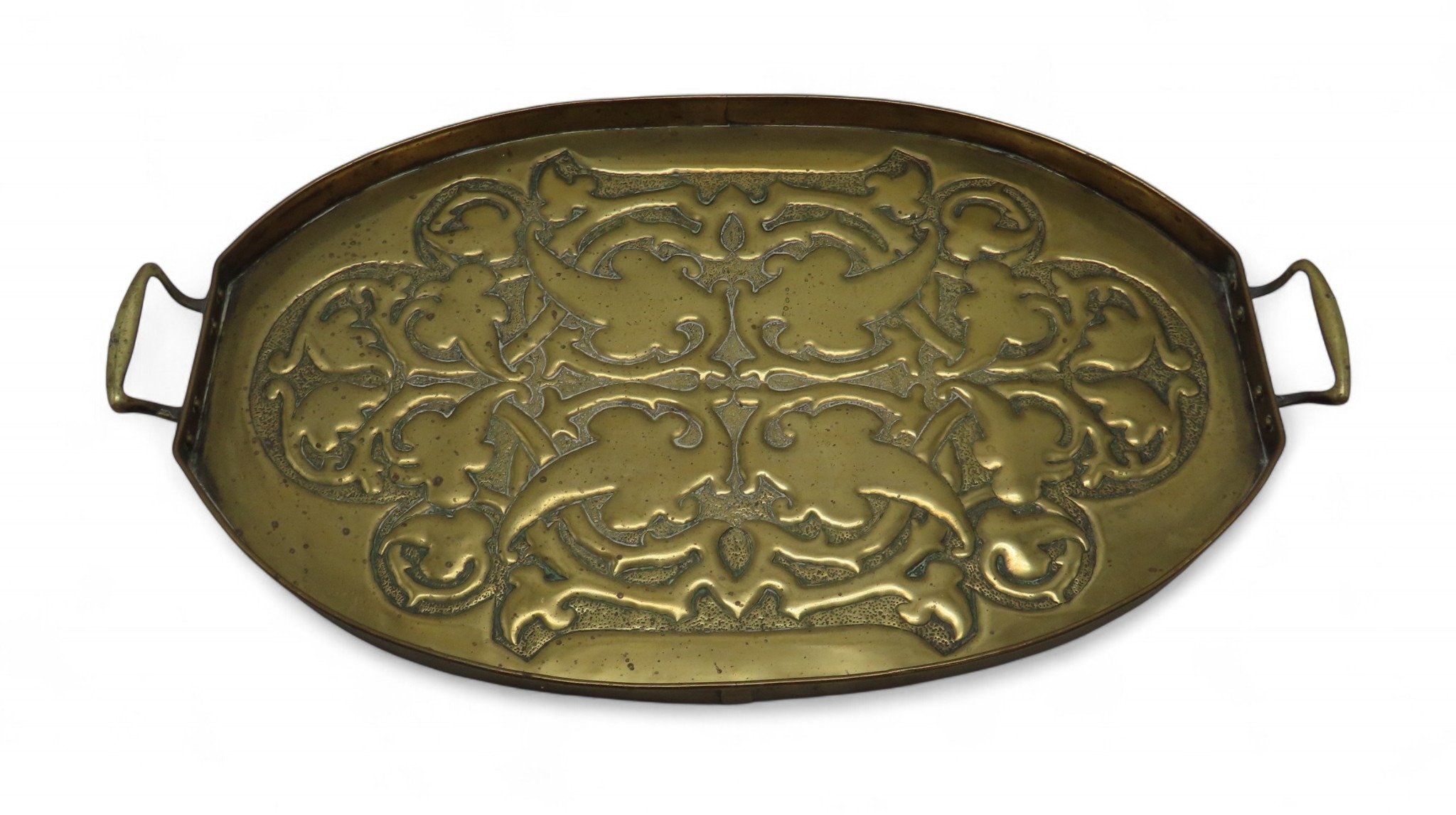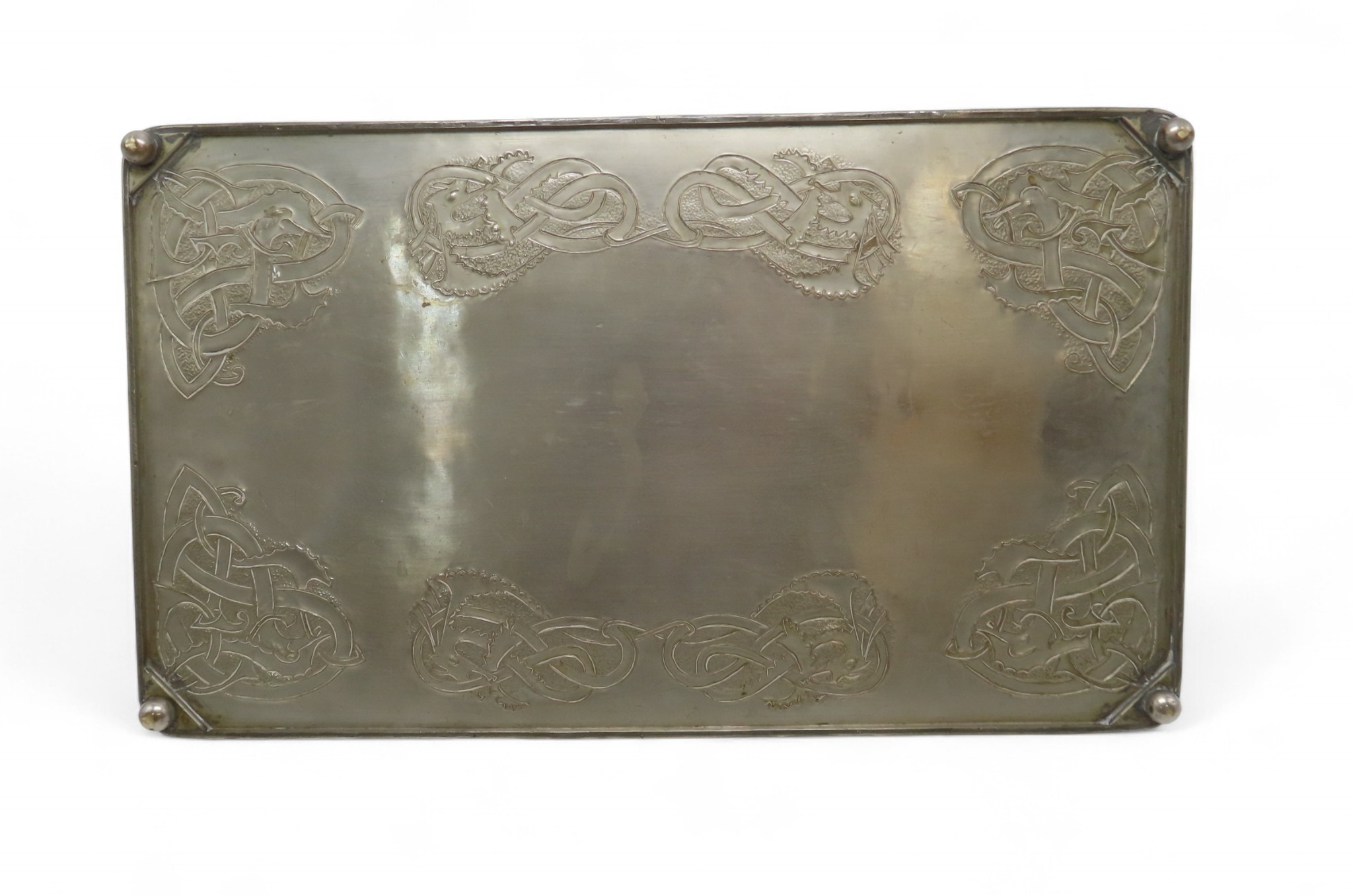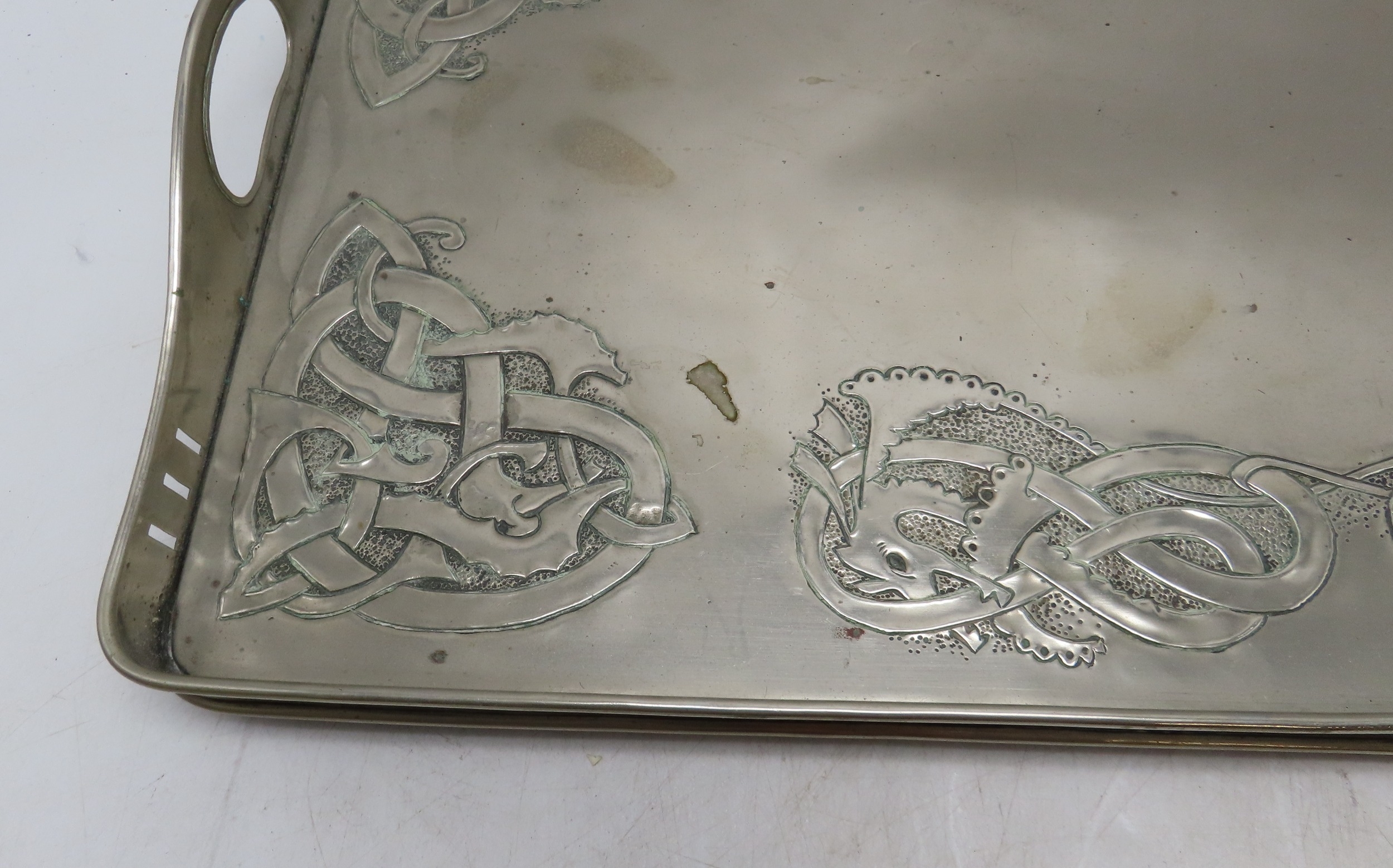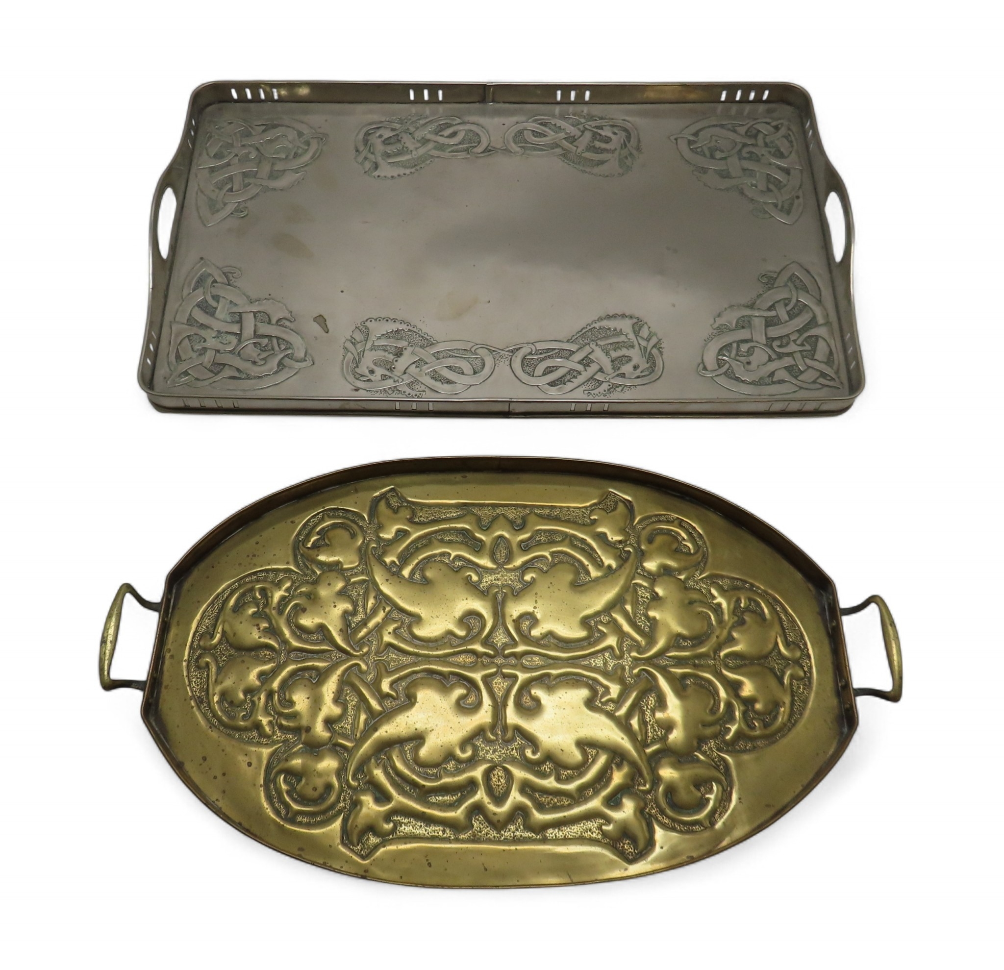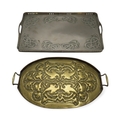 of rectangular form decorated with Celtic knotwork beasts, 35.5cm x 60.5cm together with a Scottish School brass tray, of oval shape with scrolling foliage (2)