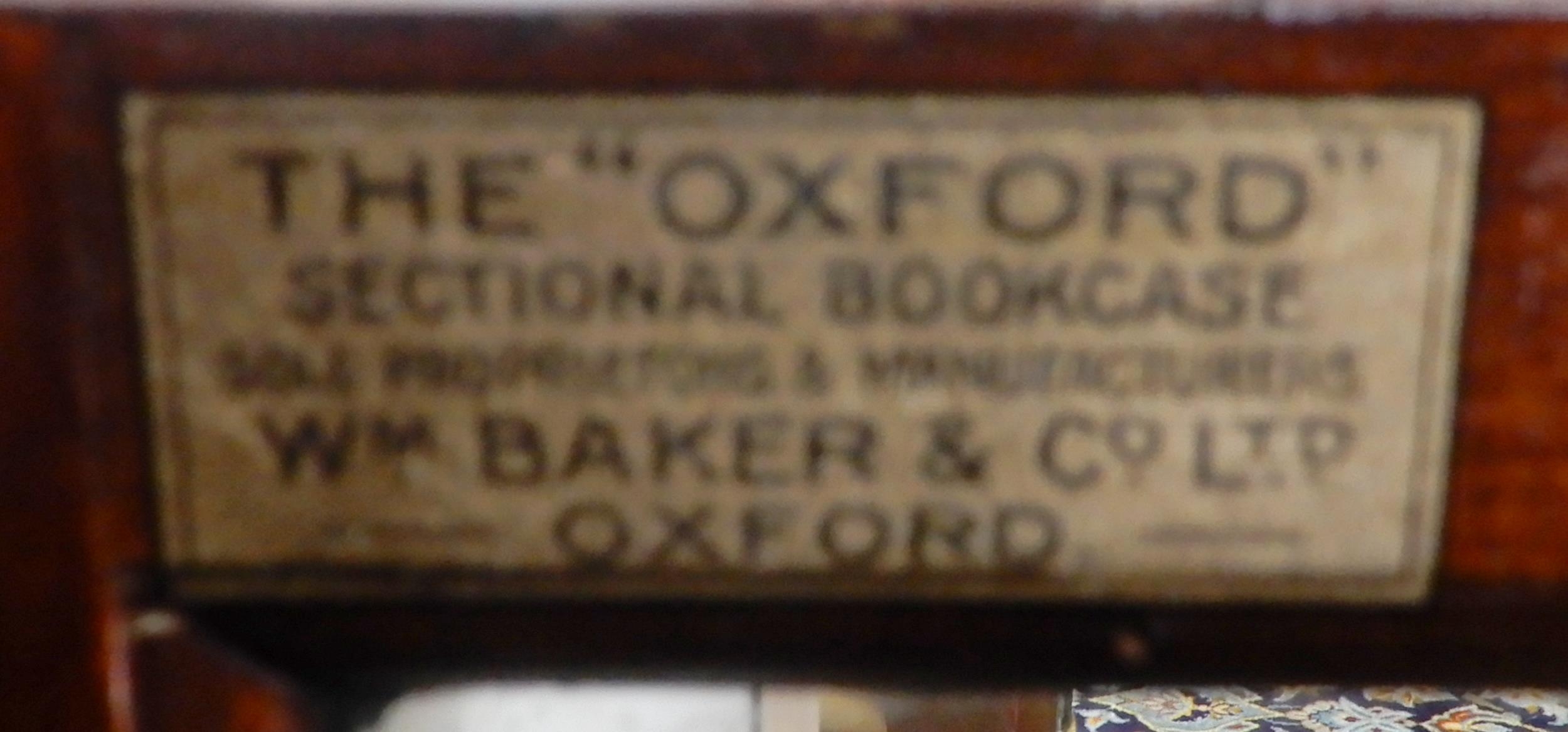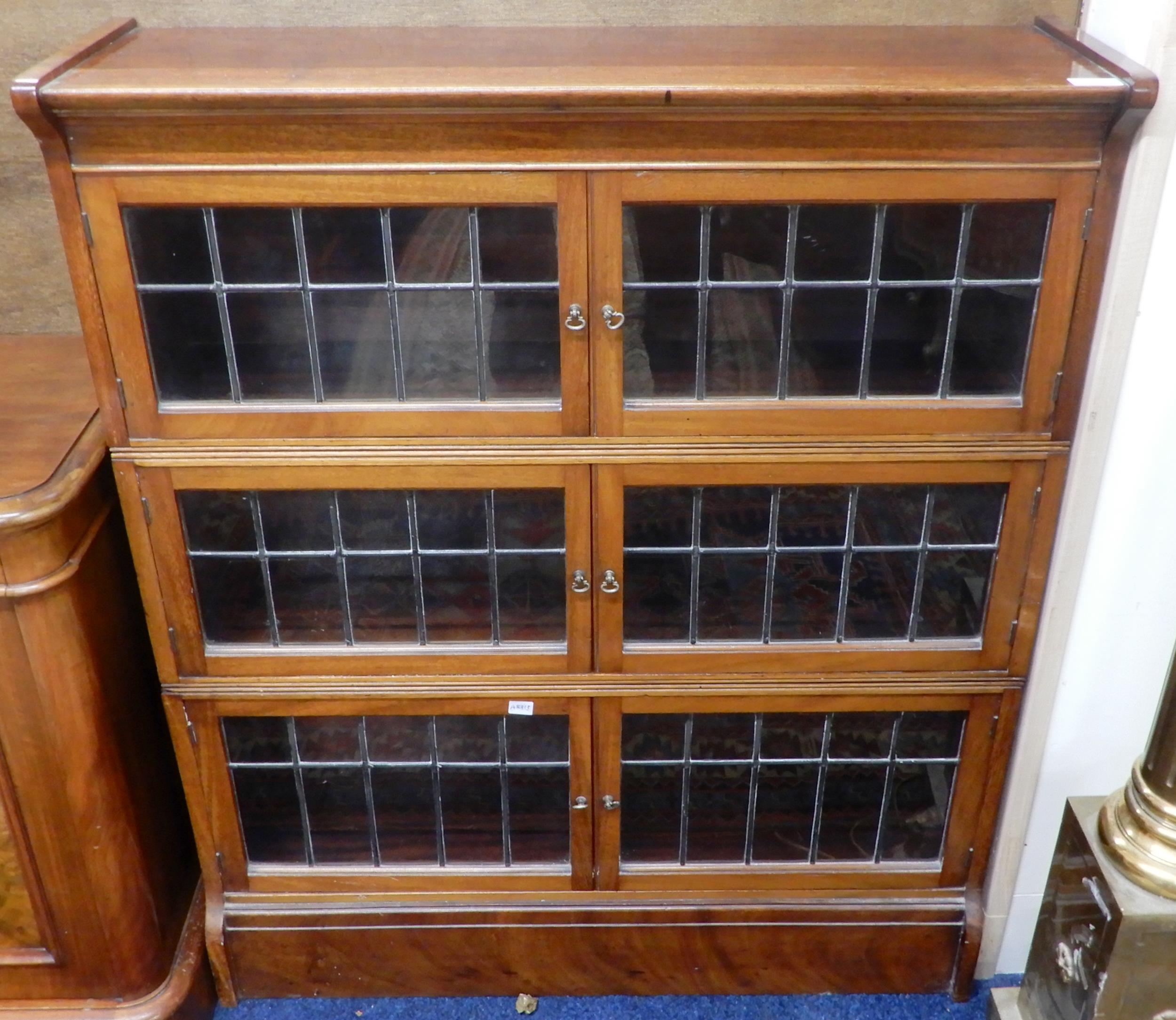 An early 20th century mahogany Wm Baker & Co Ltd "Oxford" three tier sectional bookcase with leaded glazed doors on plinth base, 106cm high x 88cm wide x 27cm deep