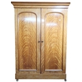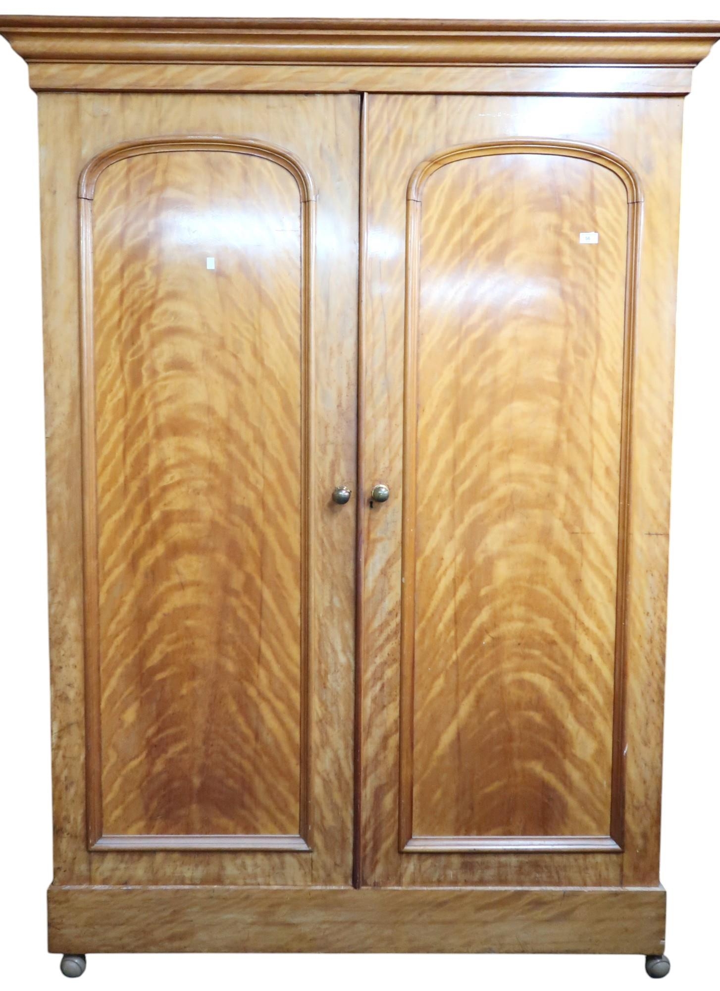 A Victorian maple two door wardrobe with moulded cornice over pair of panel doors concealing fitted interior on plinth base terminating in casters, 209cm high x 152cm wide x 64cm deep