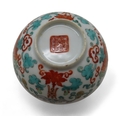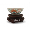 Painted with enamels depicting Shou symbols and bats, with single plum within the bowl, Guangxu seal mark, 8.8cm diameter, wood stand