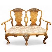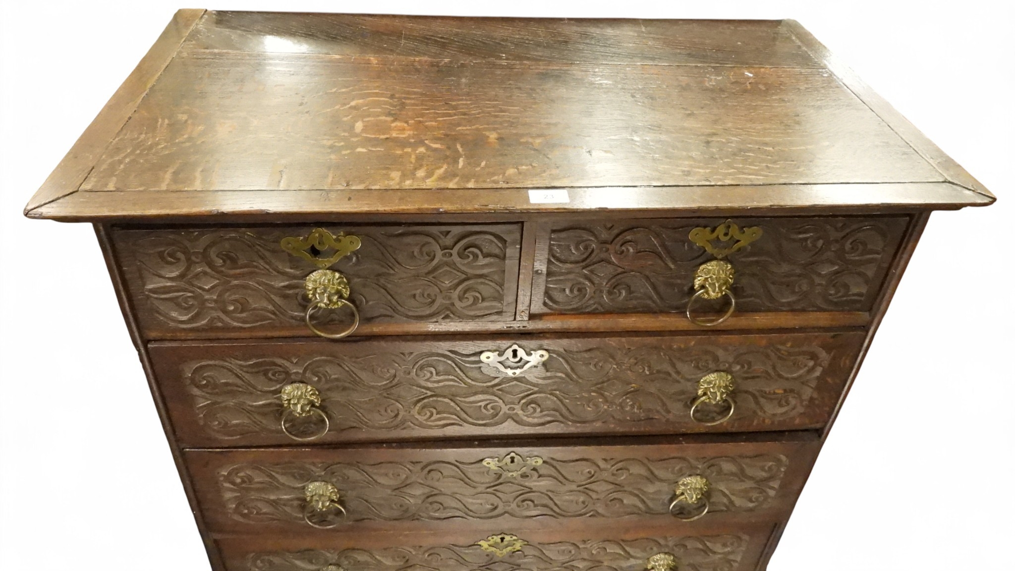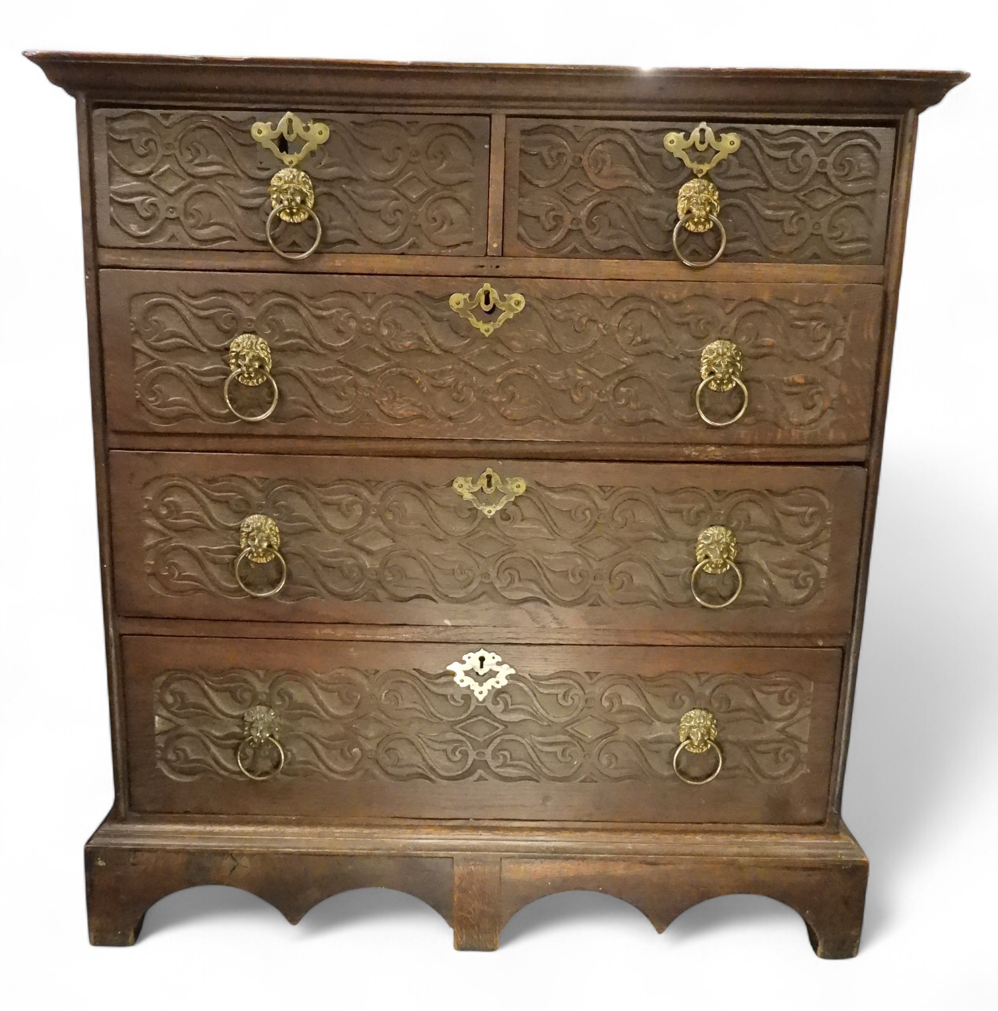 An early 19th century oak chest of drawers with two short over three long drawers with extensively carved front facings and lion masque drawer pulls on bracket supports, 101cm high x 96cm wide x 52cm deep