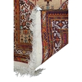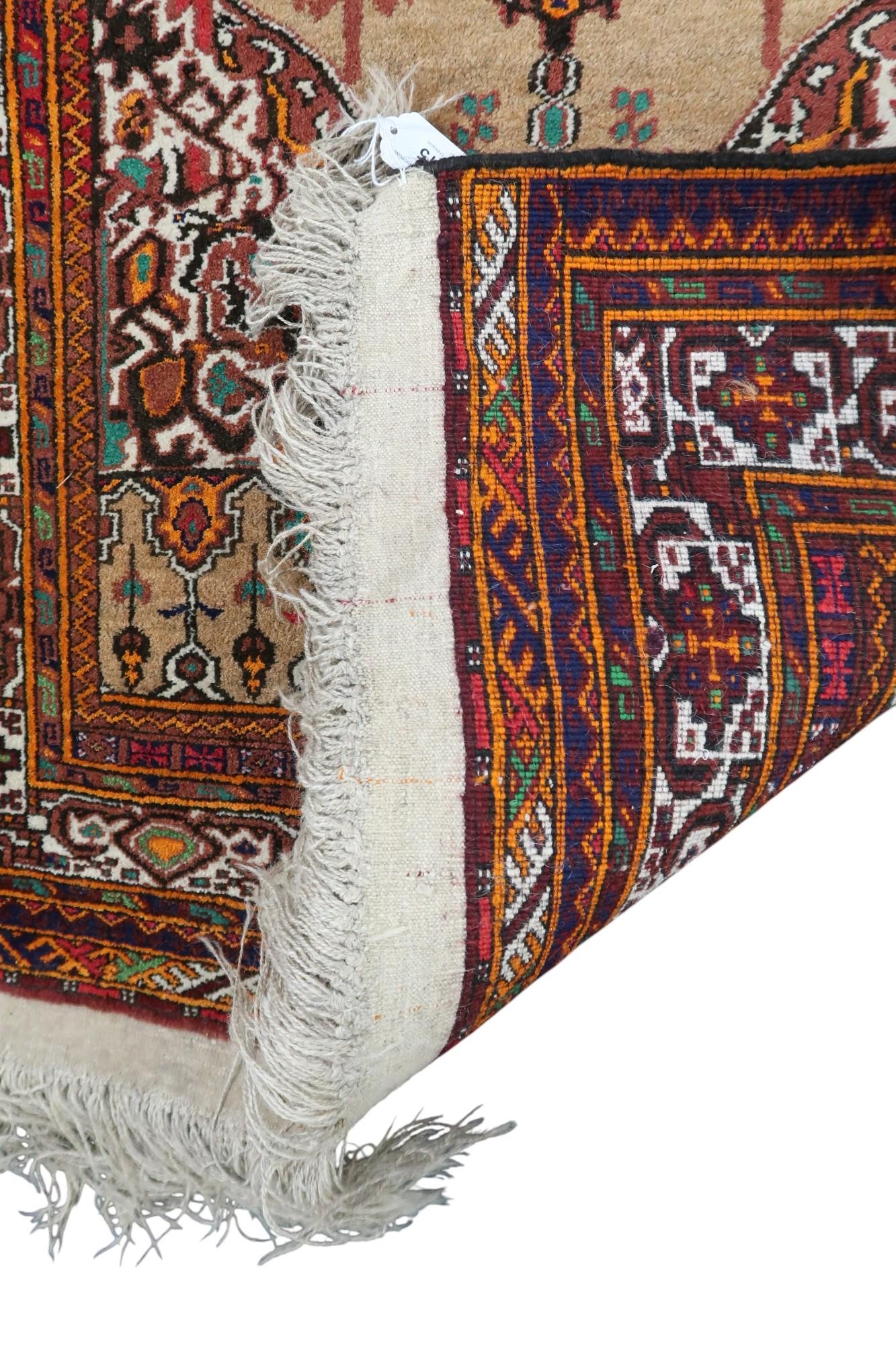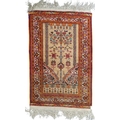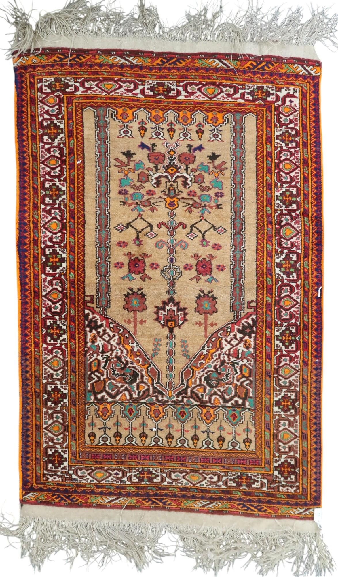A beige ground eastern style prayer rug with floral patterned ground within multicoloured geometric border, 152cm long x 96cm wide