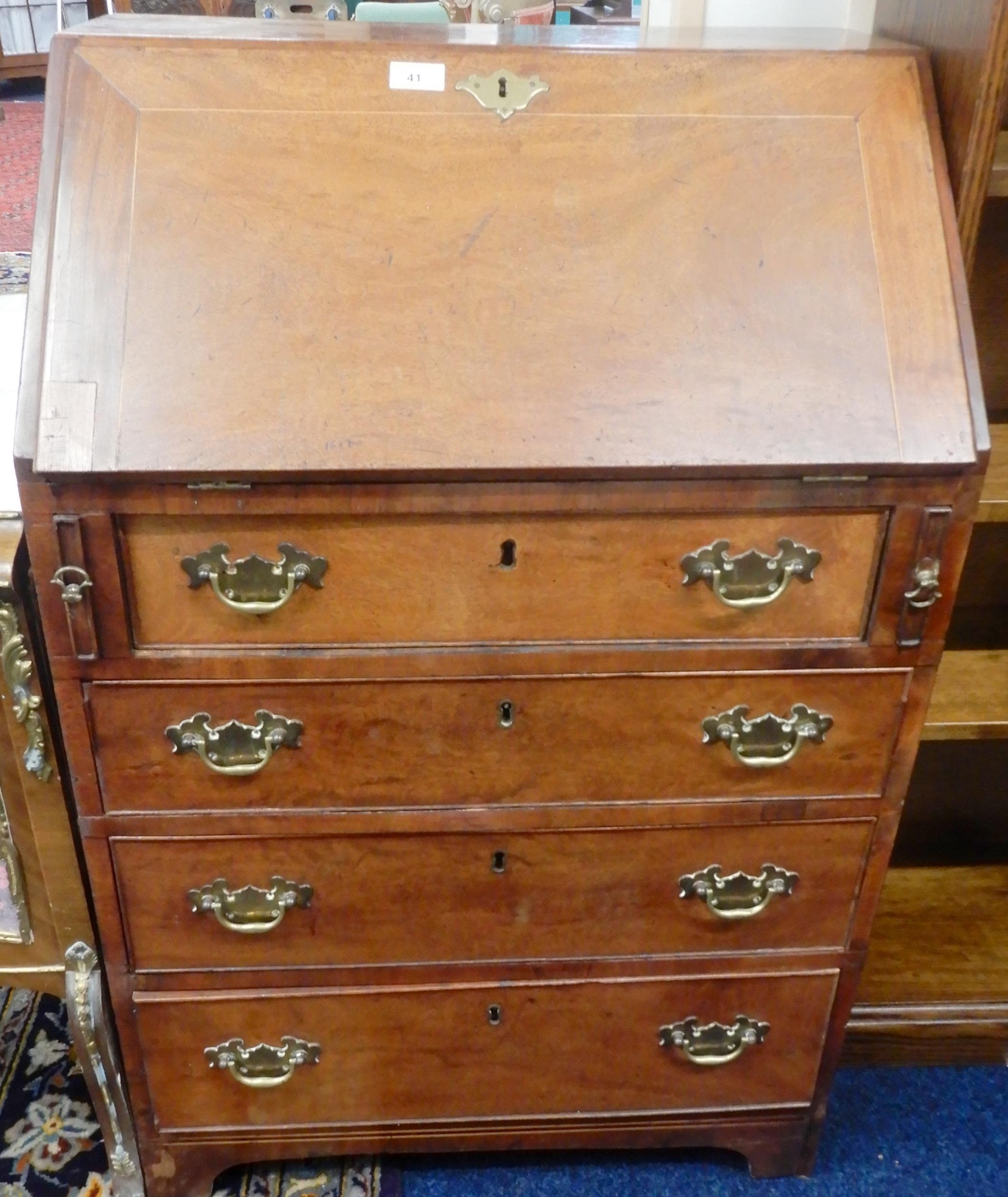 An early 20th century mahogany writing bureau with fitted fall front writing compartment over four long drawers on bracket feet, 100cm high x 65cm wide x 44cm deep