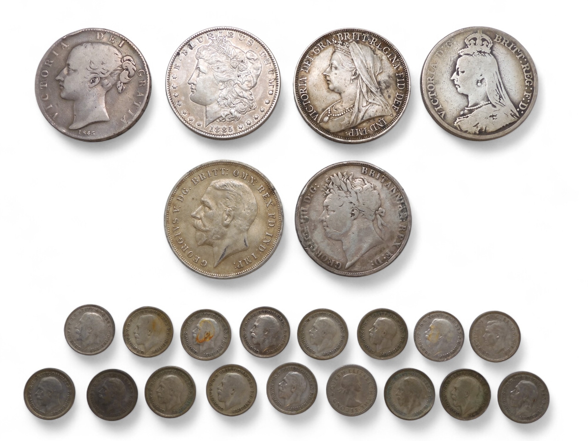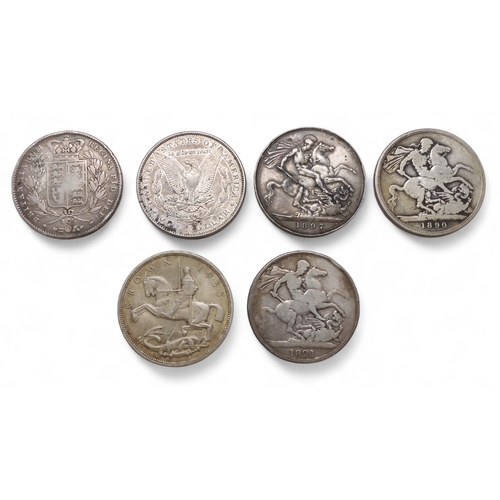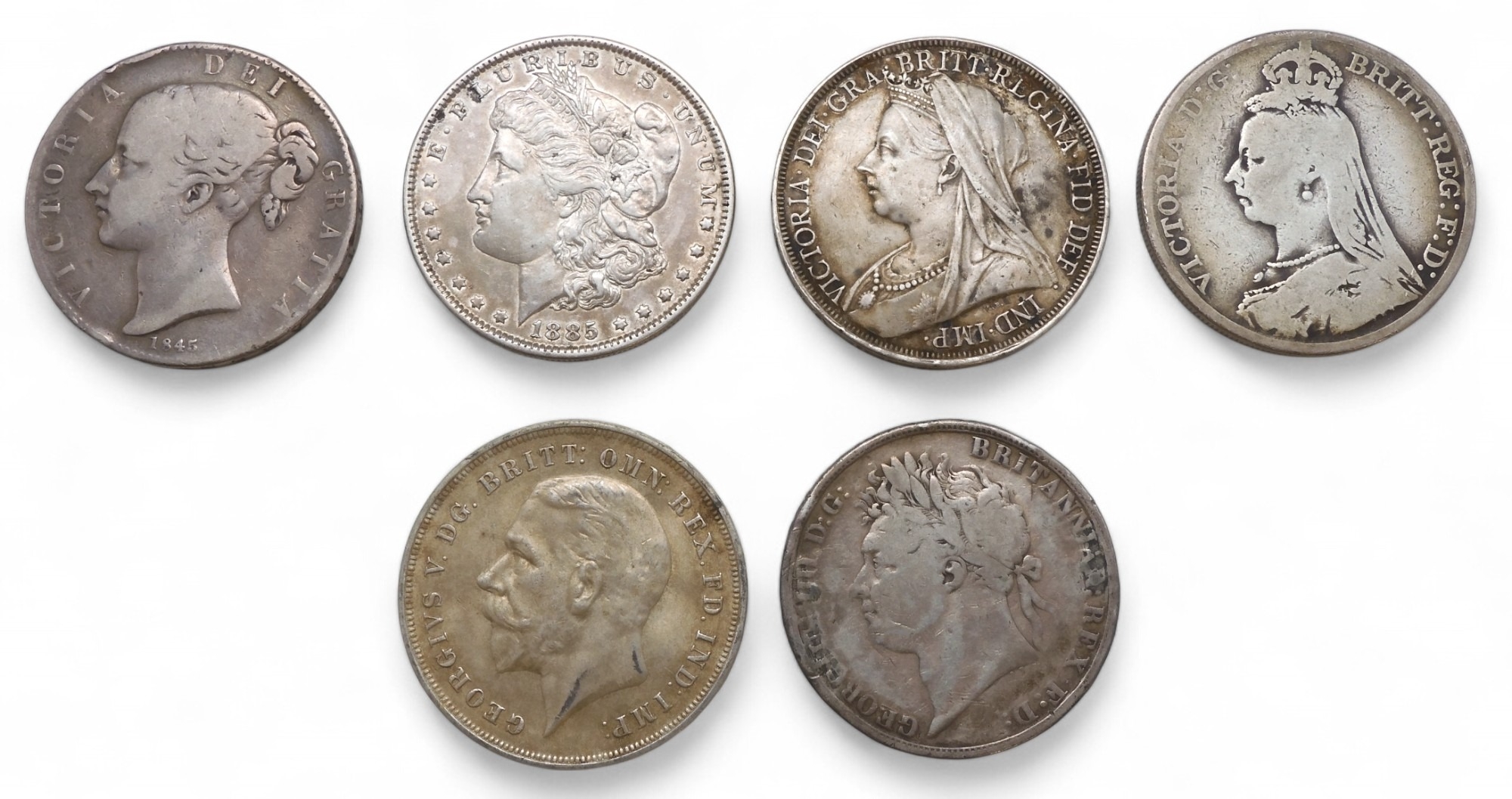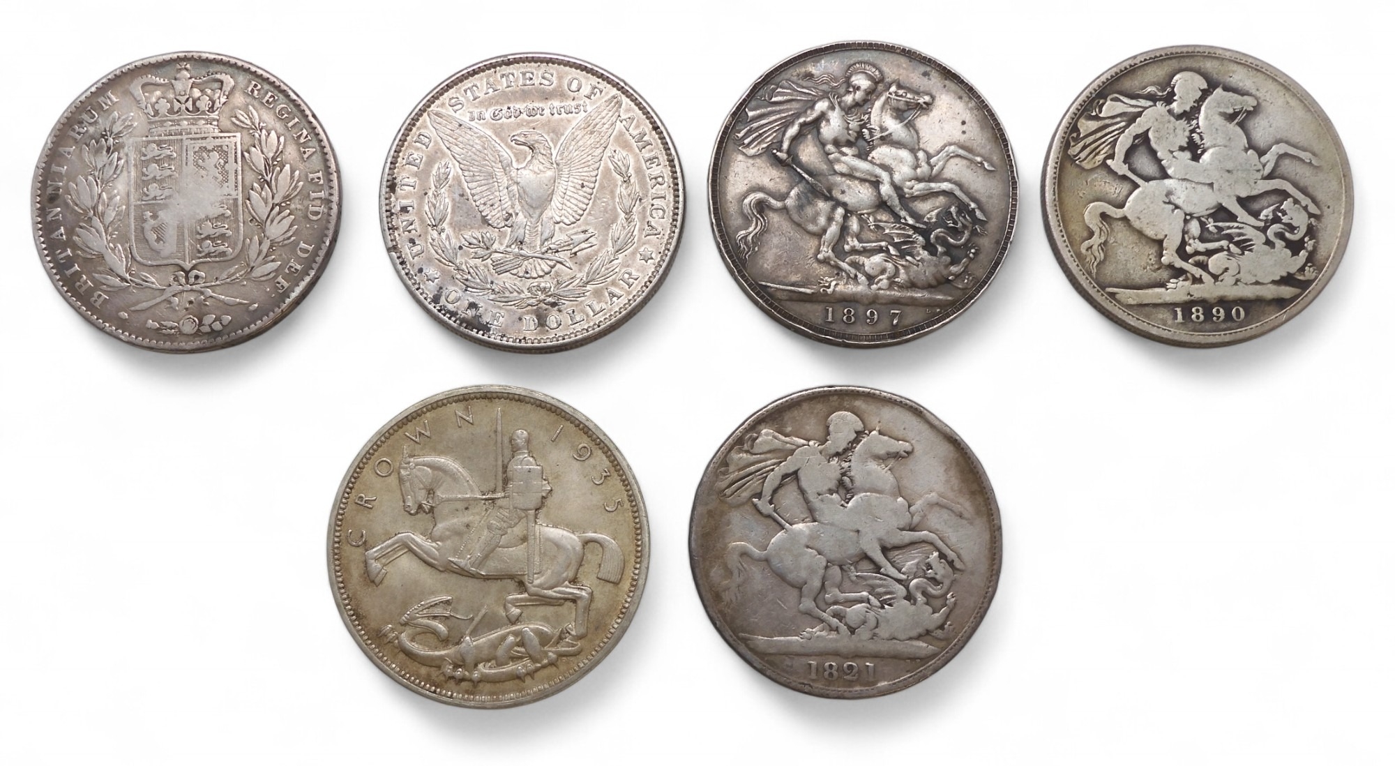 A lot comprising a U.S. Morgan dollar 1885 together with various dated G.B. crowns George IIII 1821, Victoria 1845, 1890 and 1897, George V 1935 together with pre 1947 sixpence examples approximate overall weight 188 grams