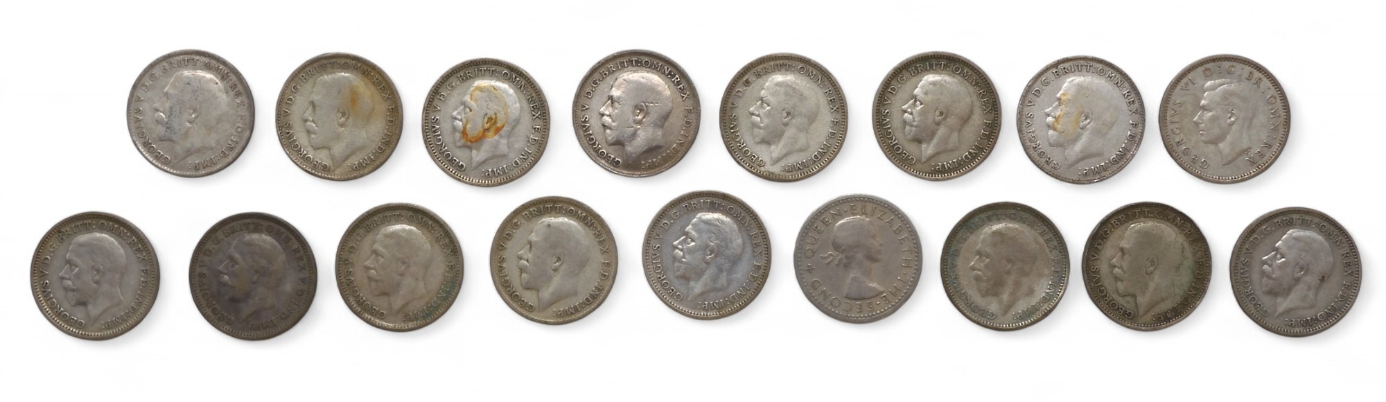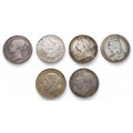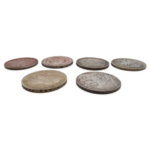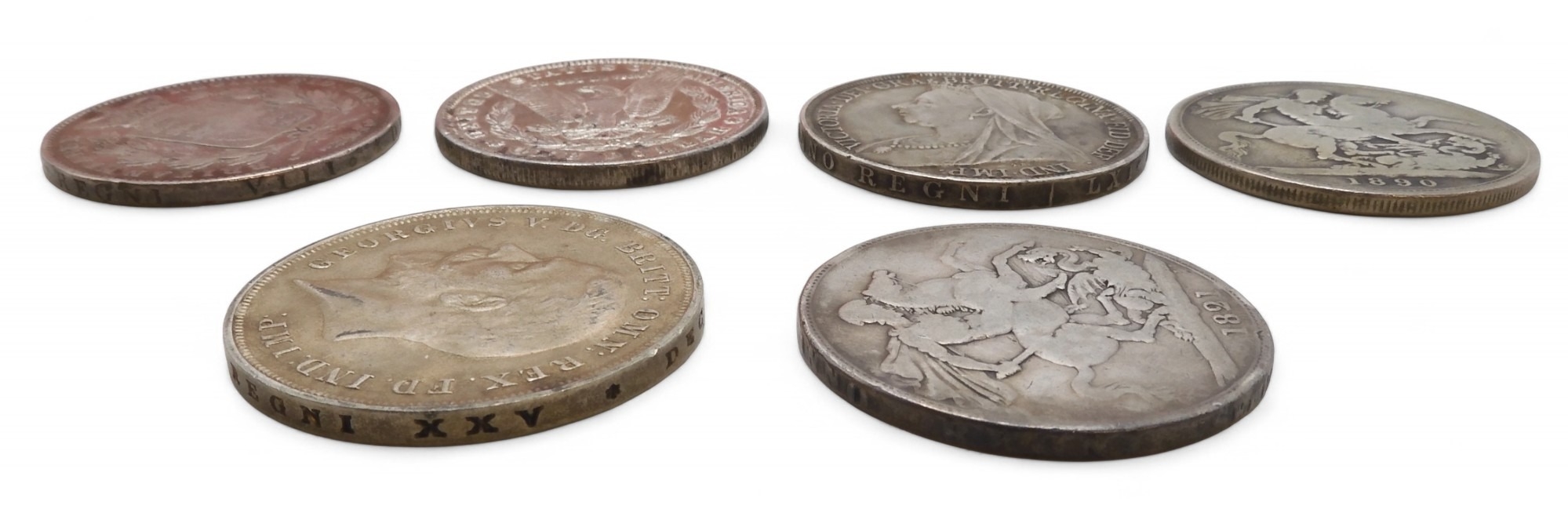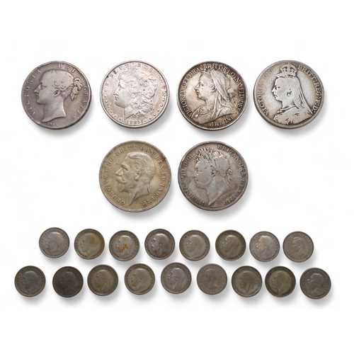 A lot comprising a U.S. Morgan dollar 1885 together with various dated G.B. crowns George IIII 1821, Victoria 1845, 1890 and 1897, George V 1935 together with pre 1947 sixpence examples approximate overall weight 188 grams