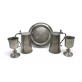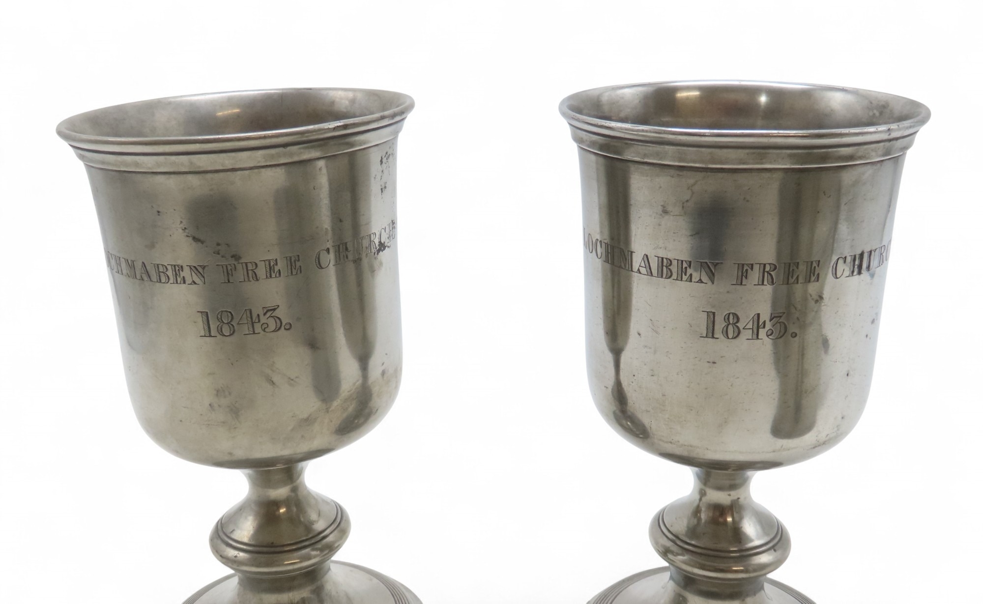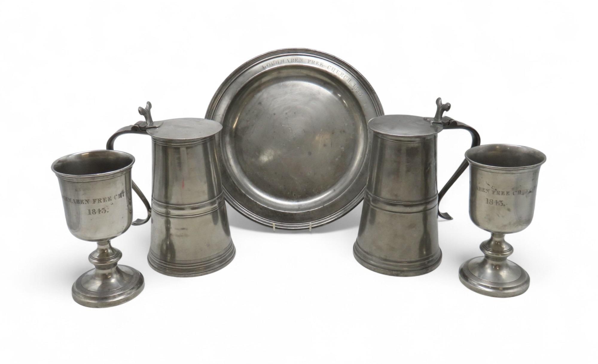 28cm high, together with a pair of large wine goblets, 22cm high and a charger, 36cm diameter, some marked for Lochmaben Free Church 1843 (5)