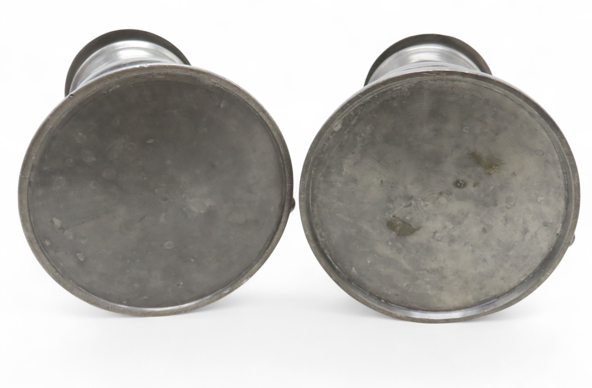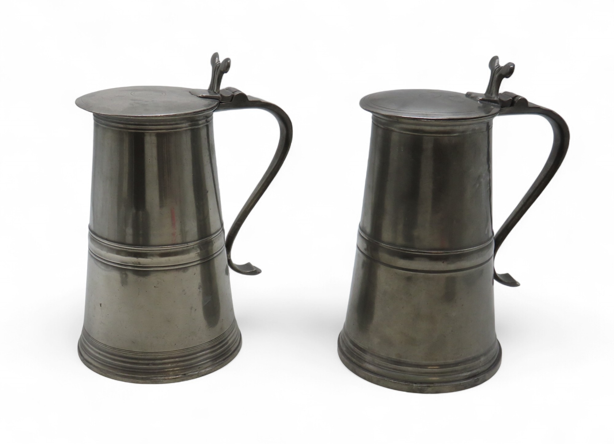 A PAIR OF SCOTTISH PEWTER FLAT-LID FLAGONS