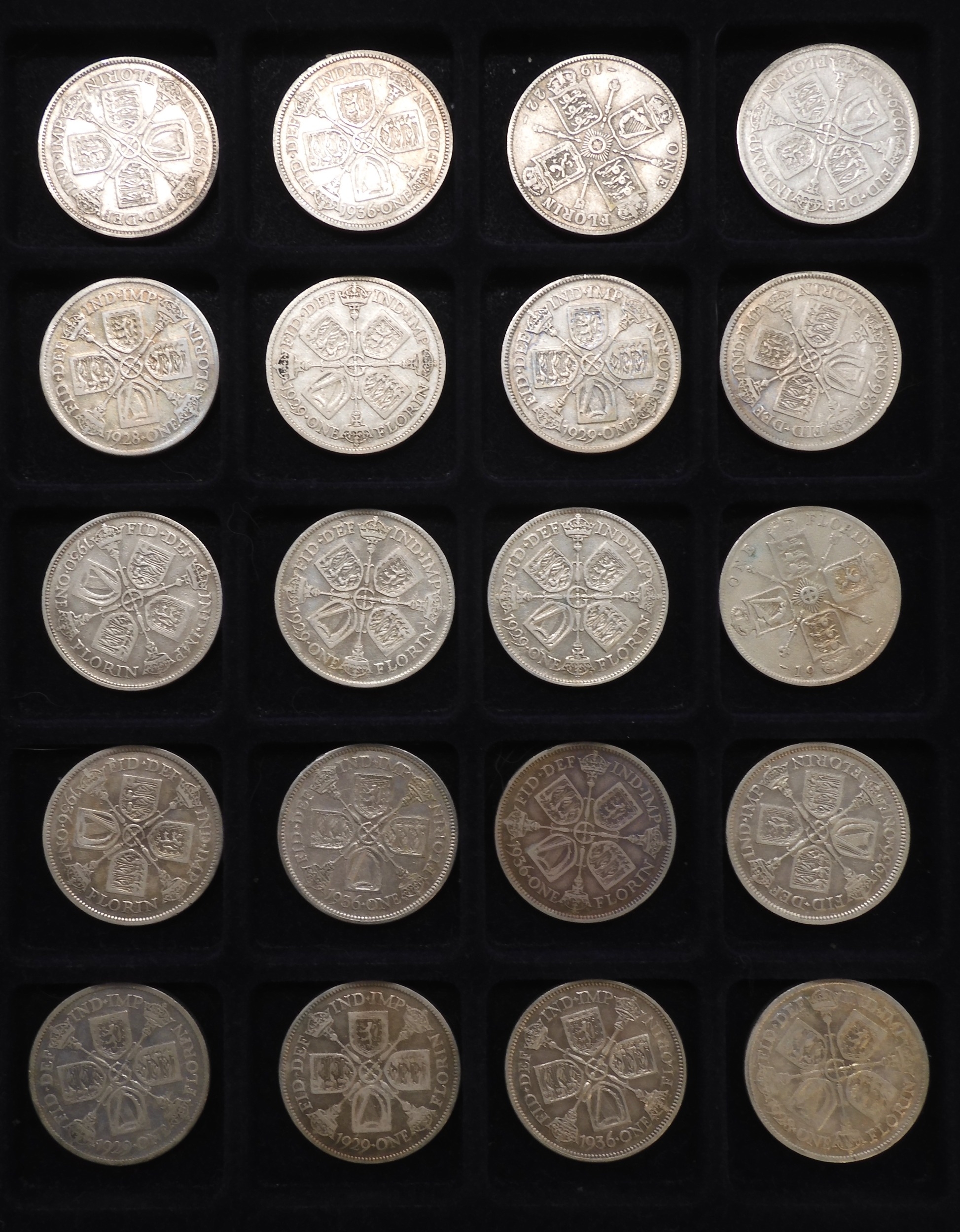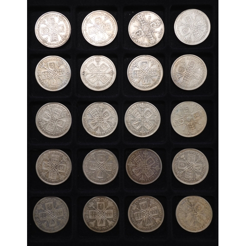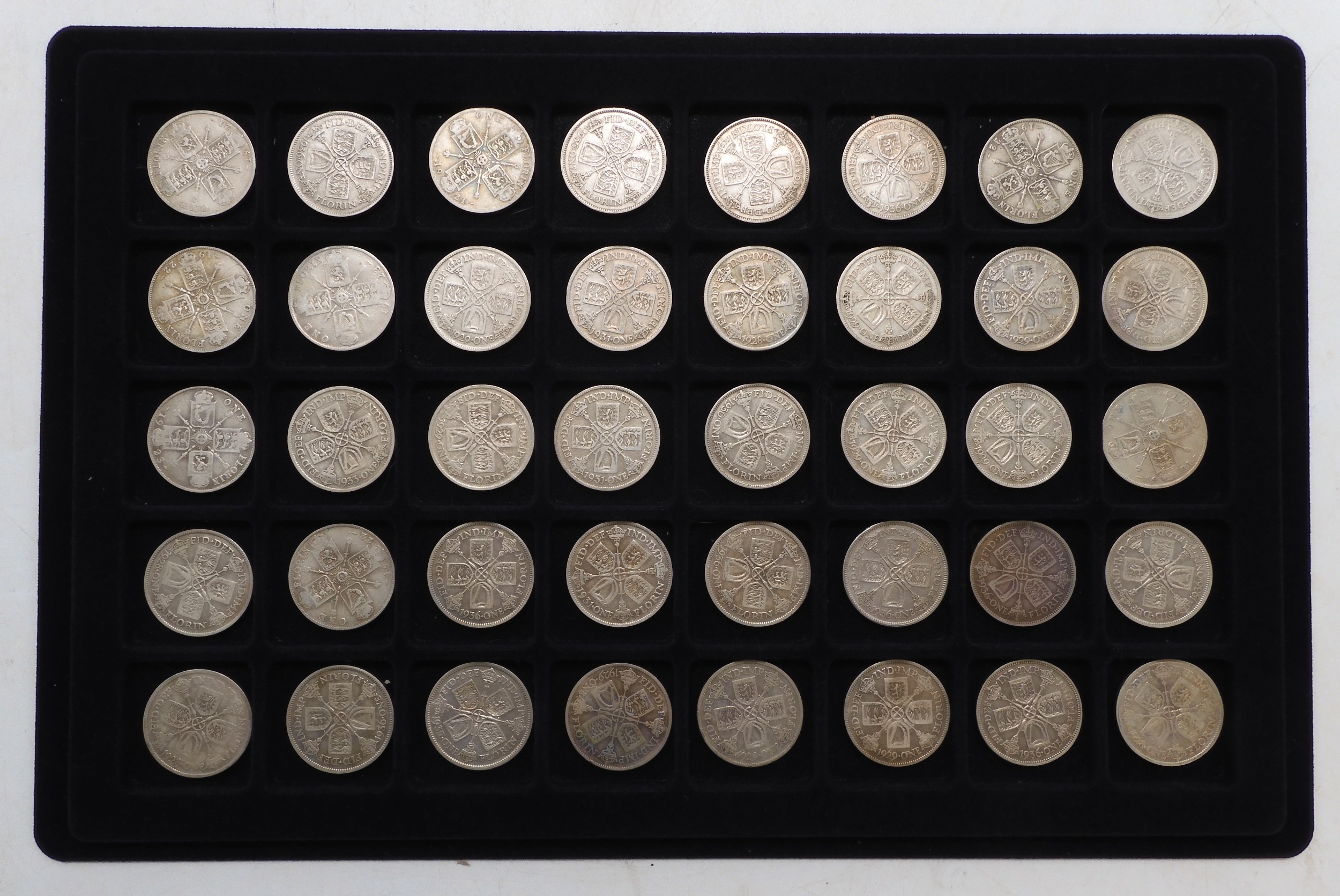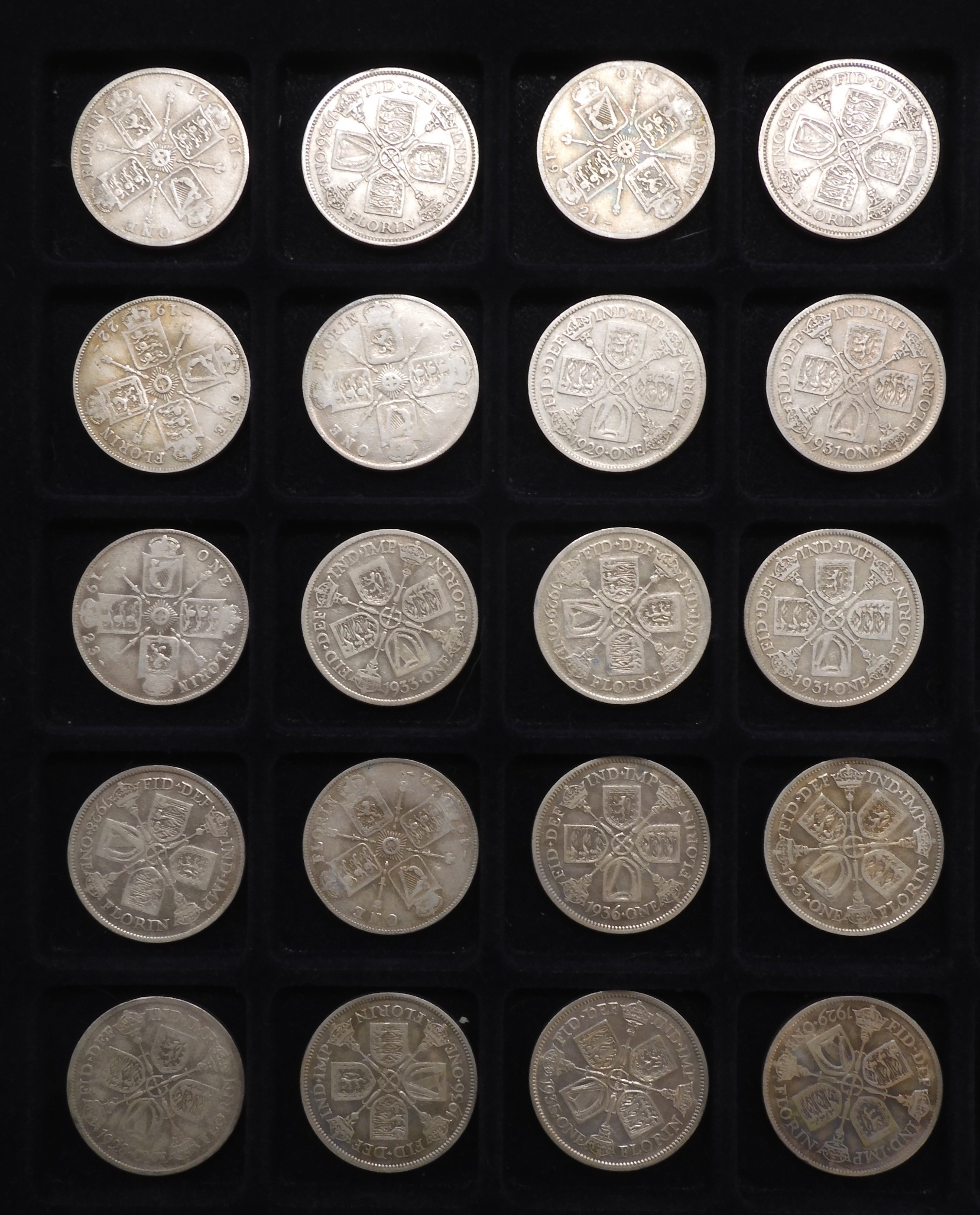 GREAT BRITAIN a collector's tray of pre-1947 George V 1 florin coins (40)
