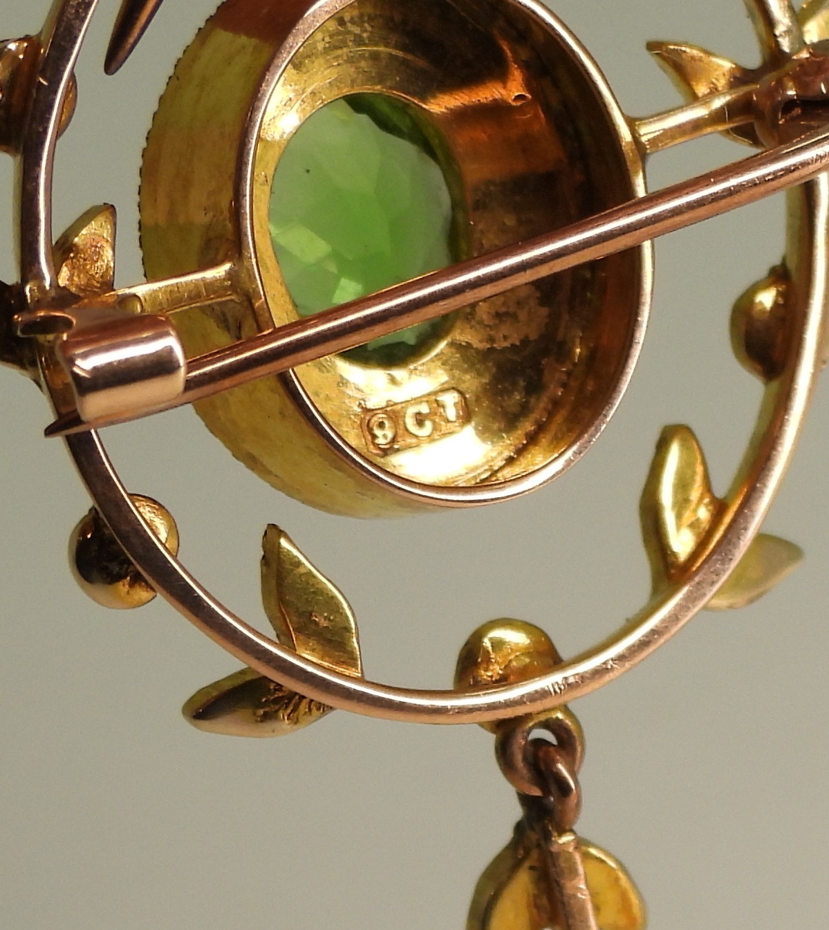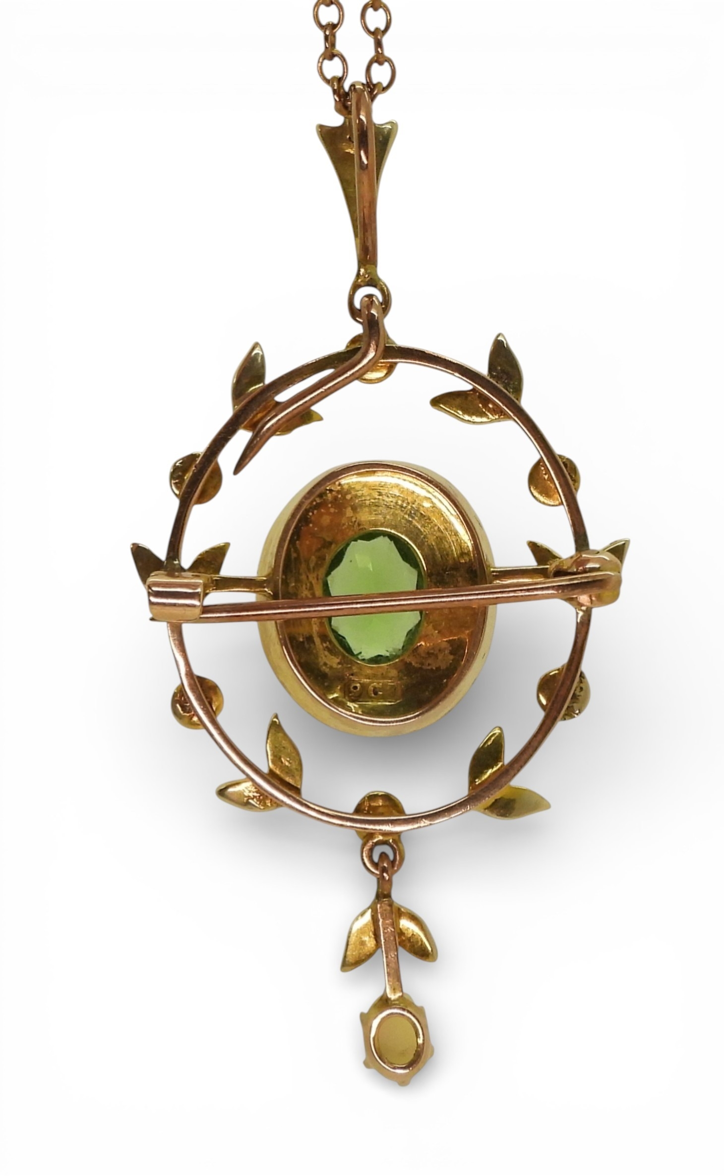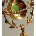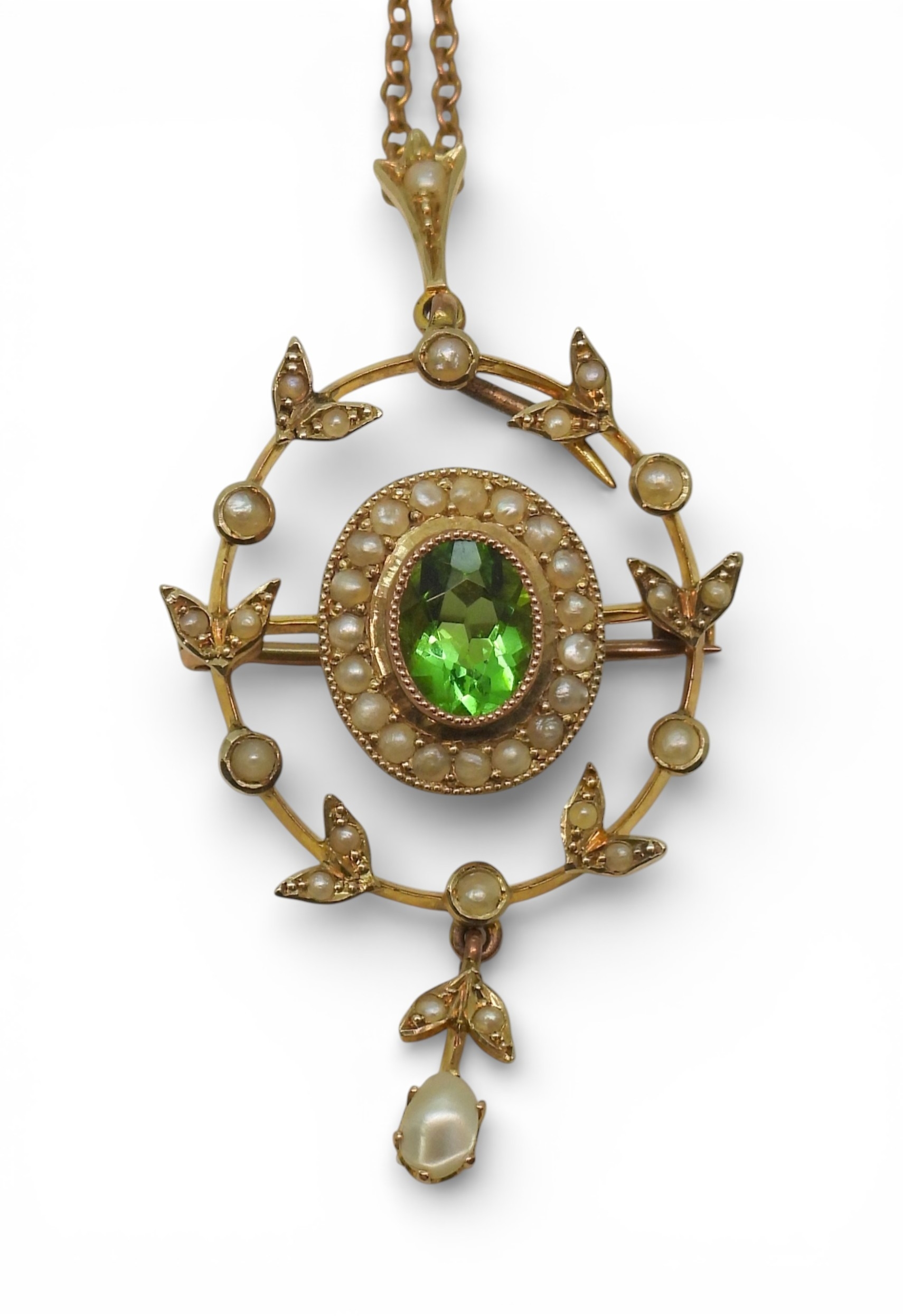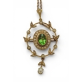 made in 9ct gold set with a green gem and seed pearls, length with bail, 5cm, on a 50cm trace chain, weight combined 7.5gms