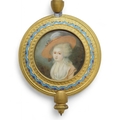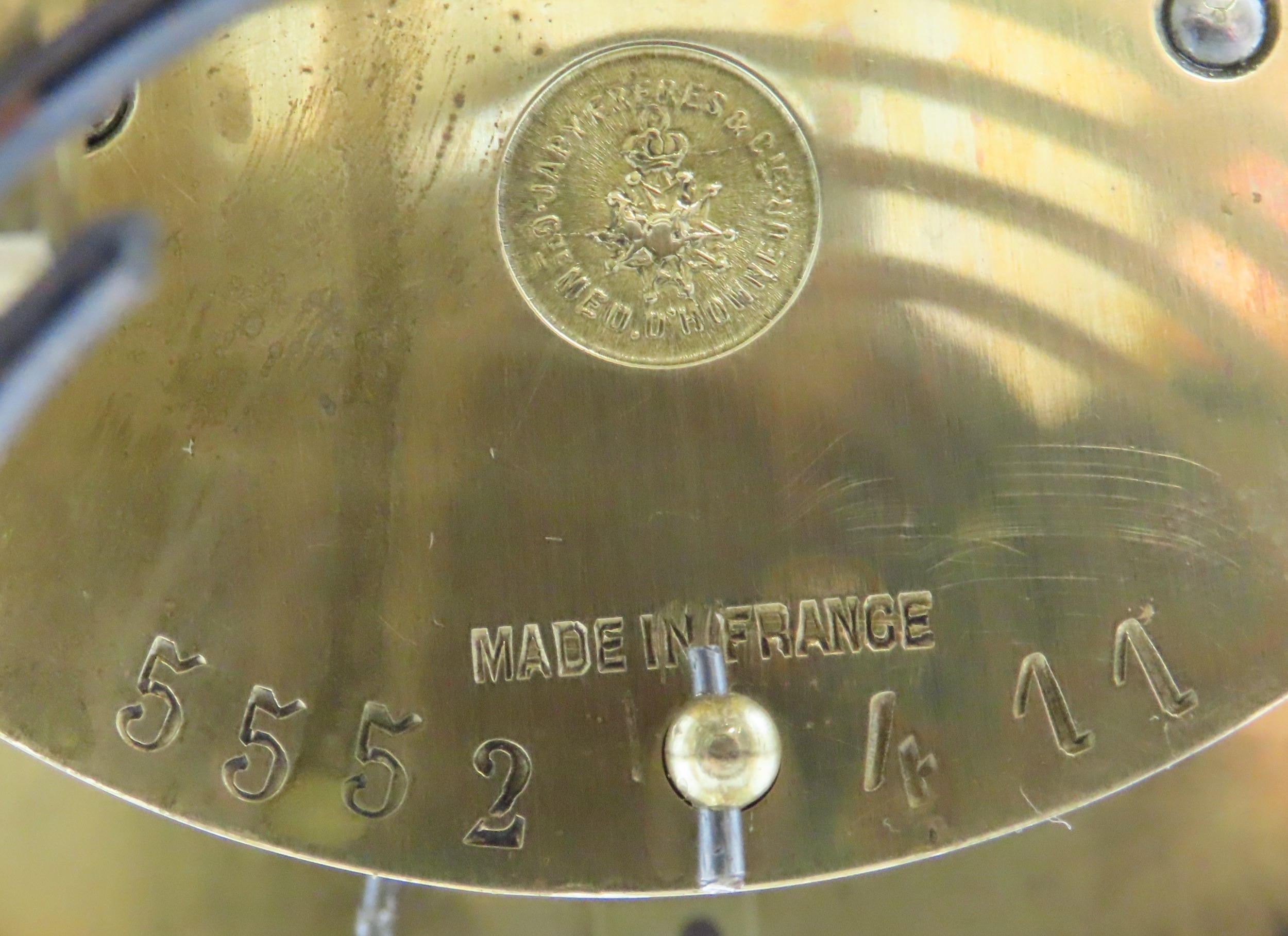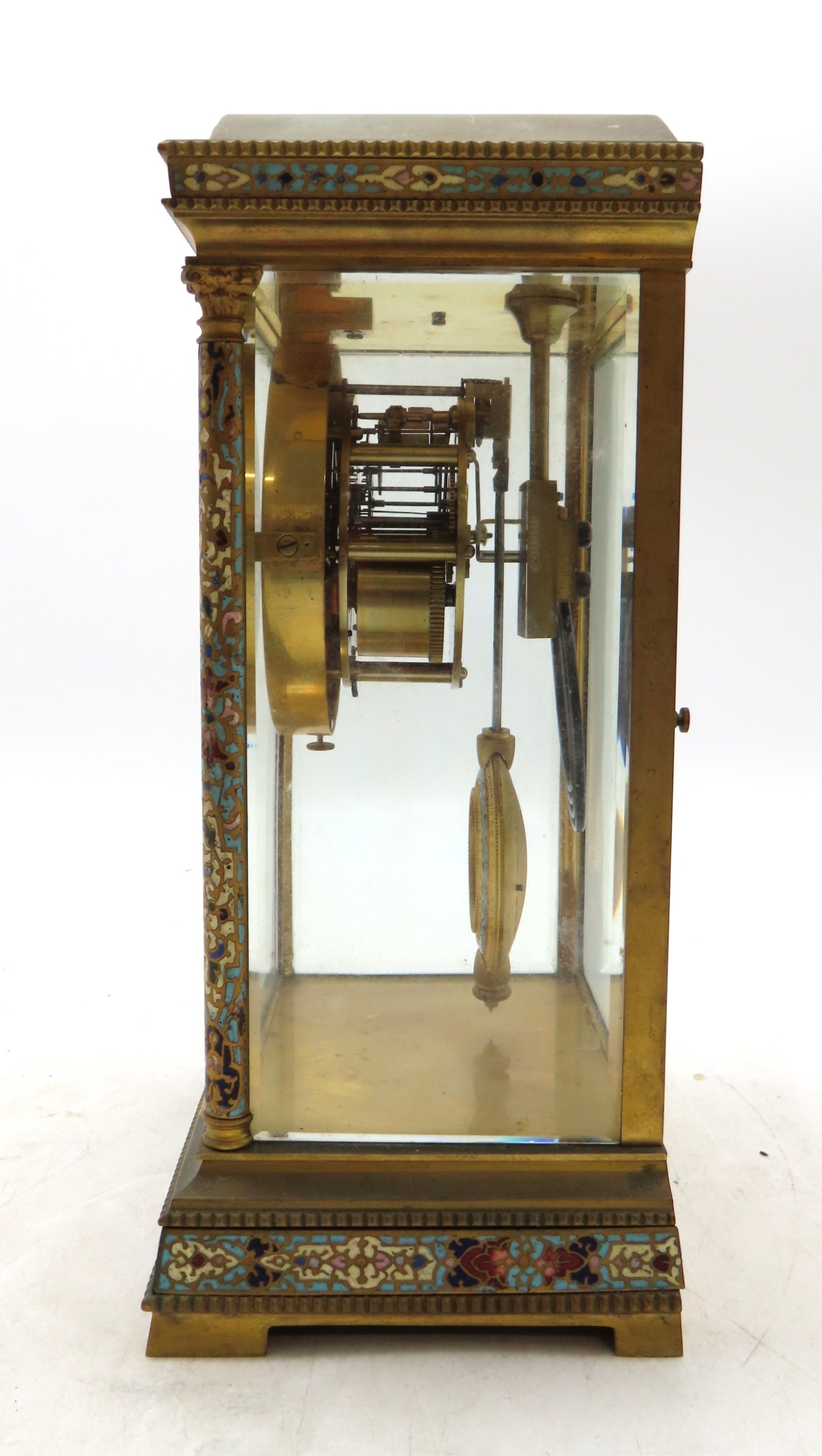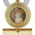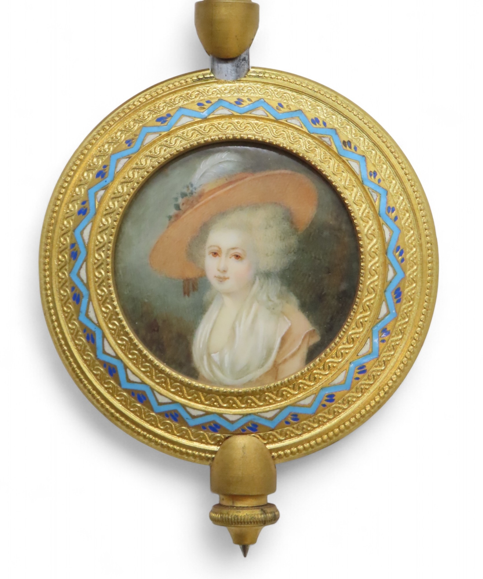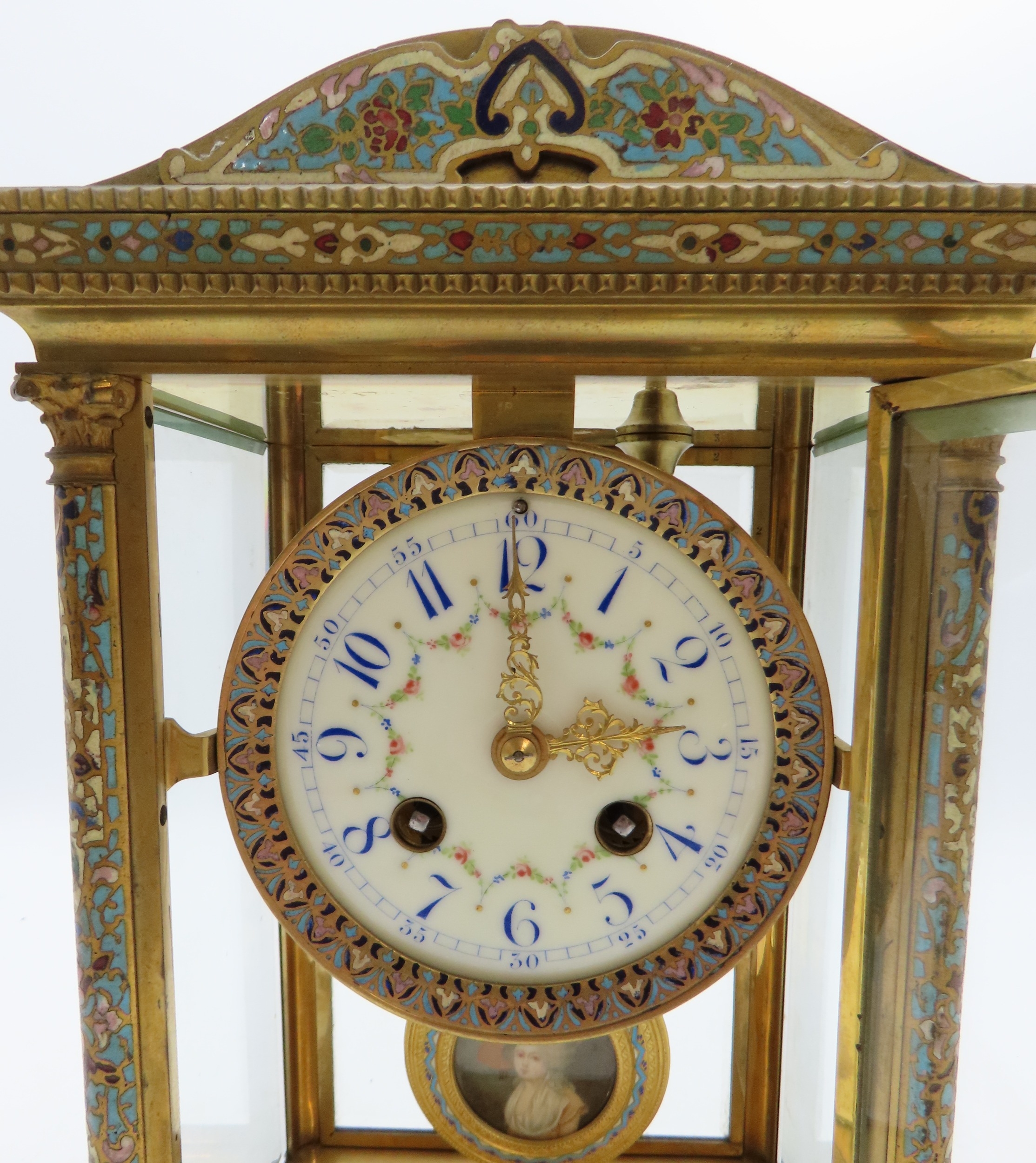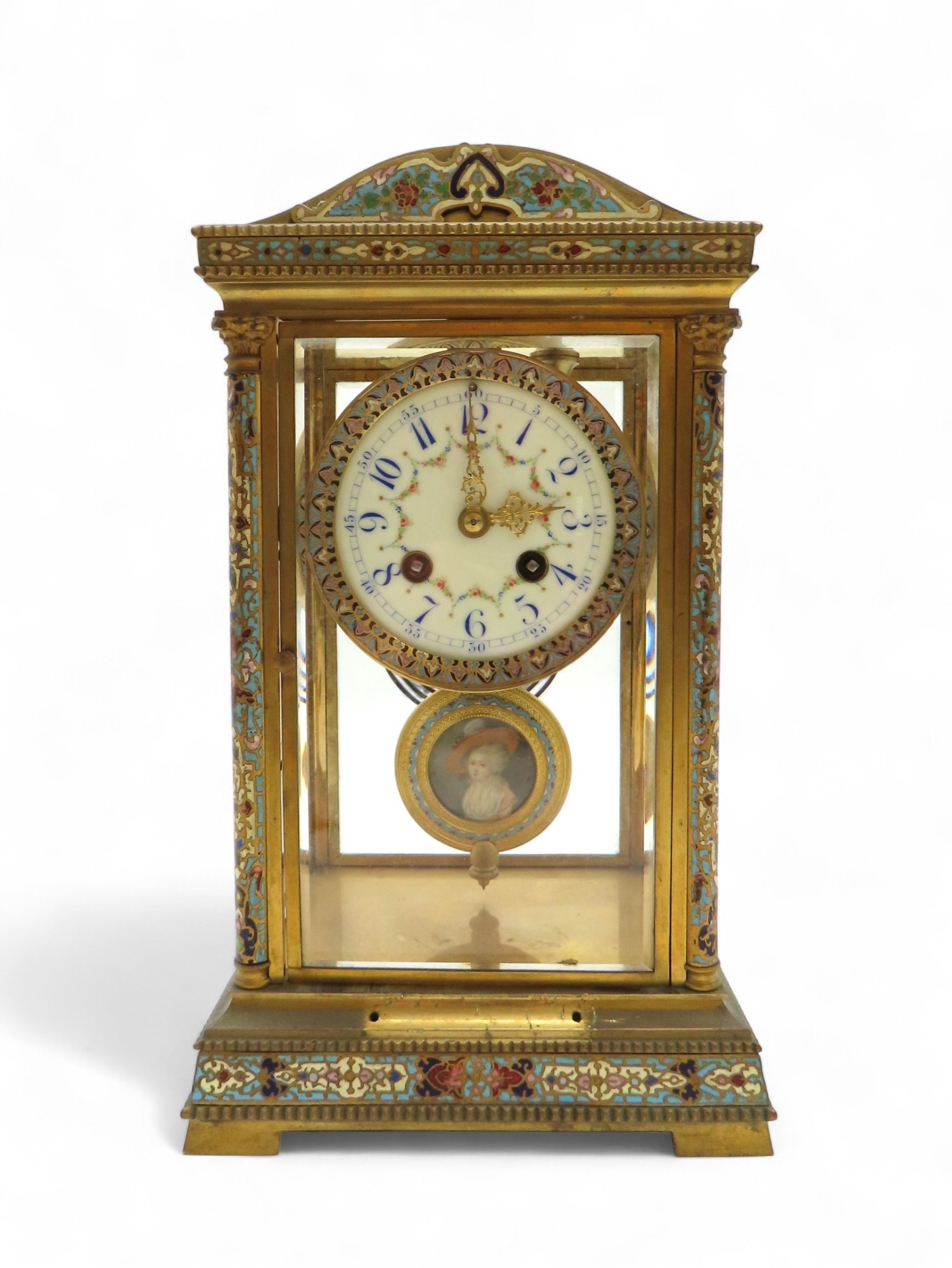 the white enamelled dial with Arabic numerals and swags of flowers within a champleve enamel mount, the movement marked for Japy Freres and with numbers 5552 411, the pendulum with enclosed portrait miniature of a lady, 31cm high