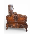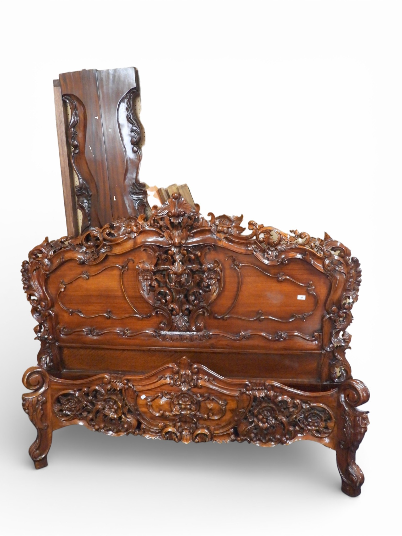 A contemporary hardwood continental style king sized bed frame with elaborately carved head and foot boards