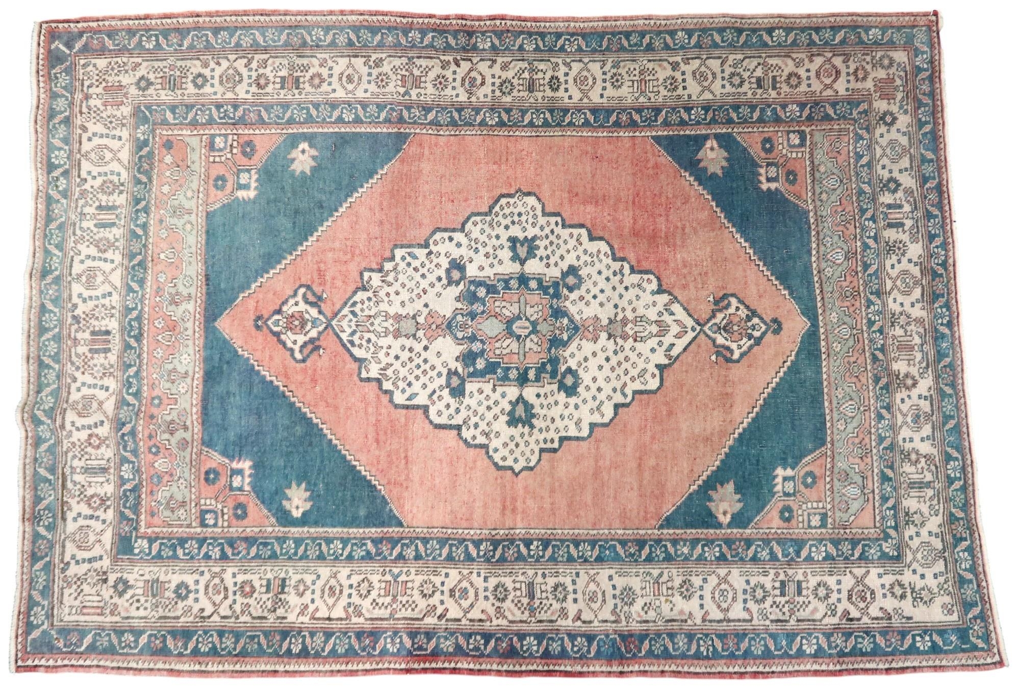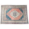 A pink ground Oushak rug with cream central medallion and blue spandrels within beige geometric patterned border, 195cm long x 139cm wide