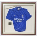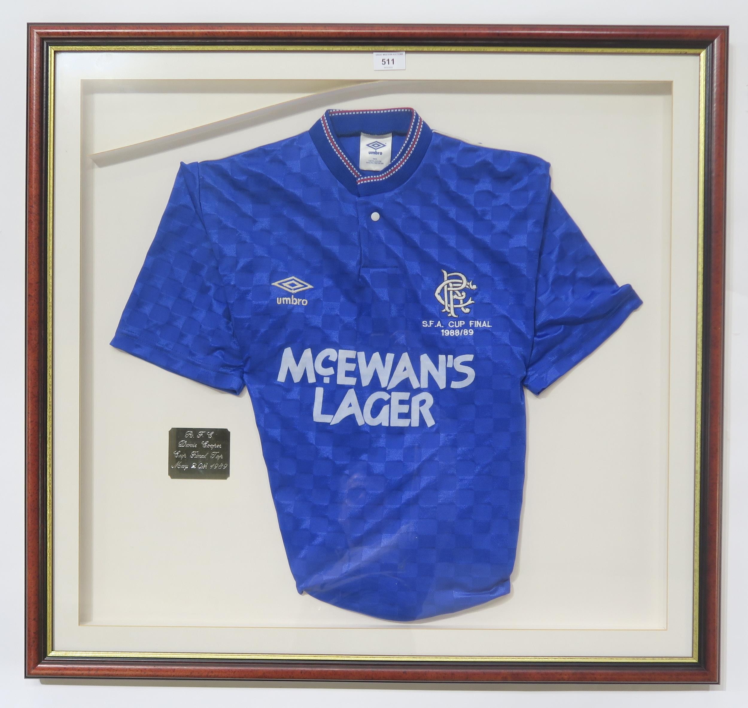 A match-worn Scottish Cup 1988/89 Final Rangers F.C. jersey, by Umbro, framed under glass, measuring approx. 84cm x 79cm externally