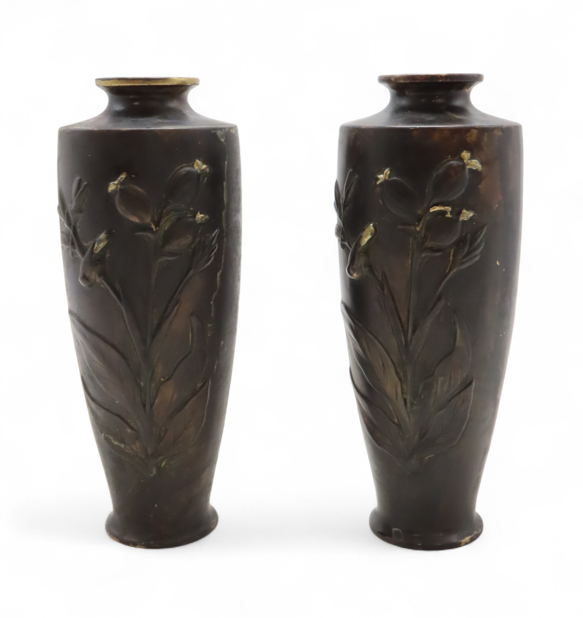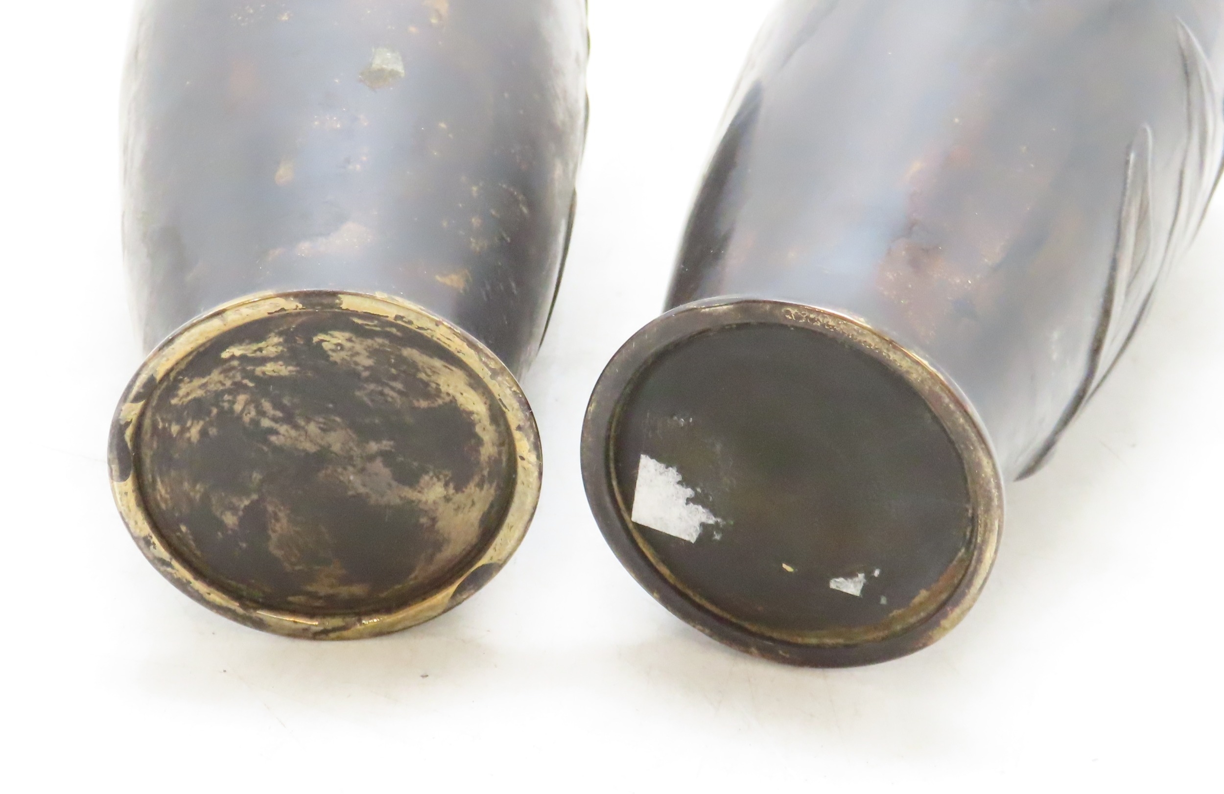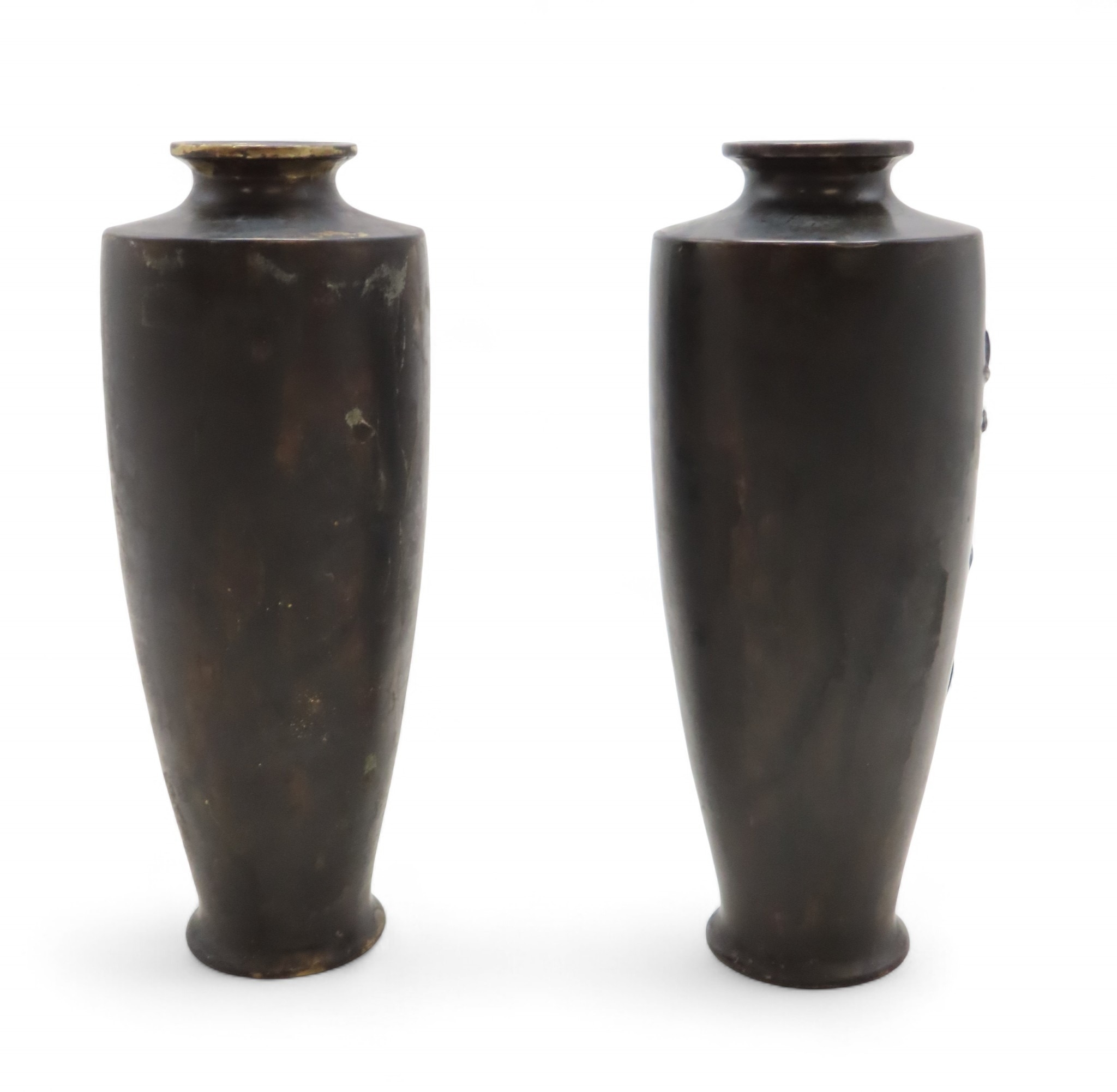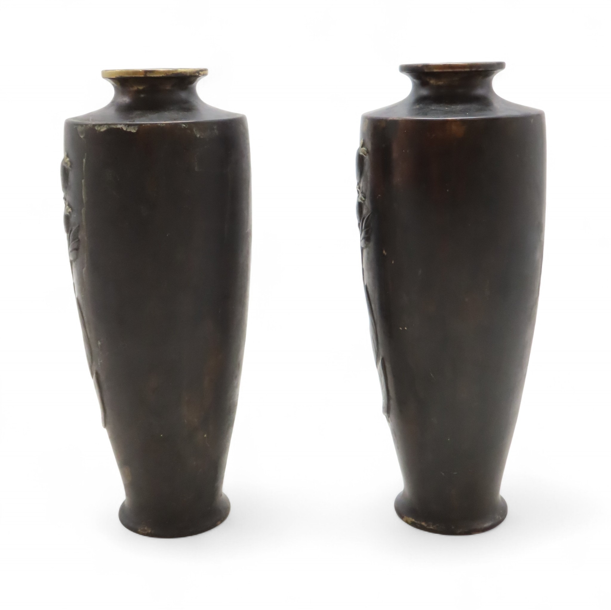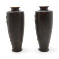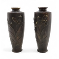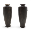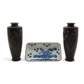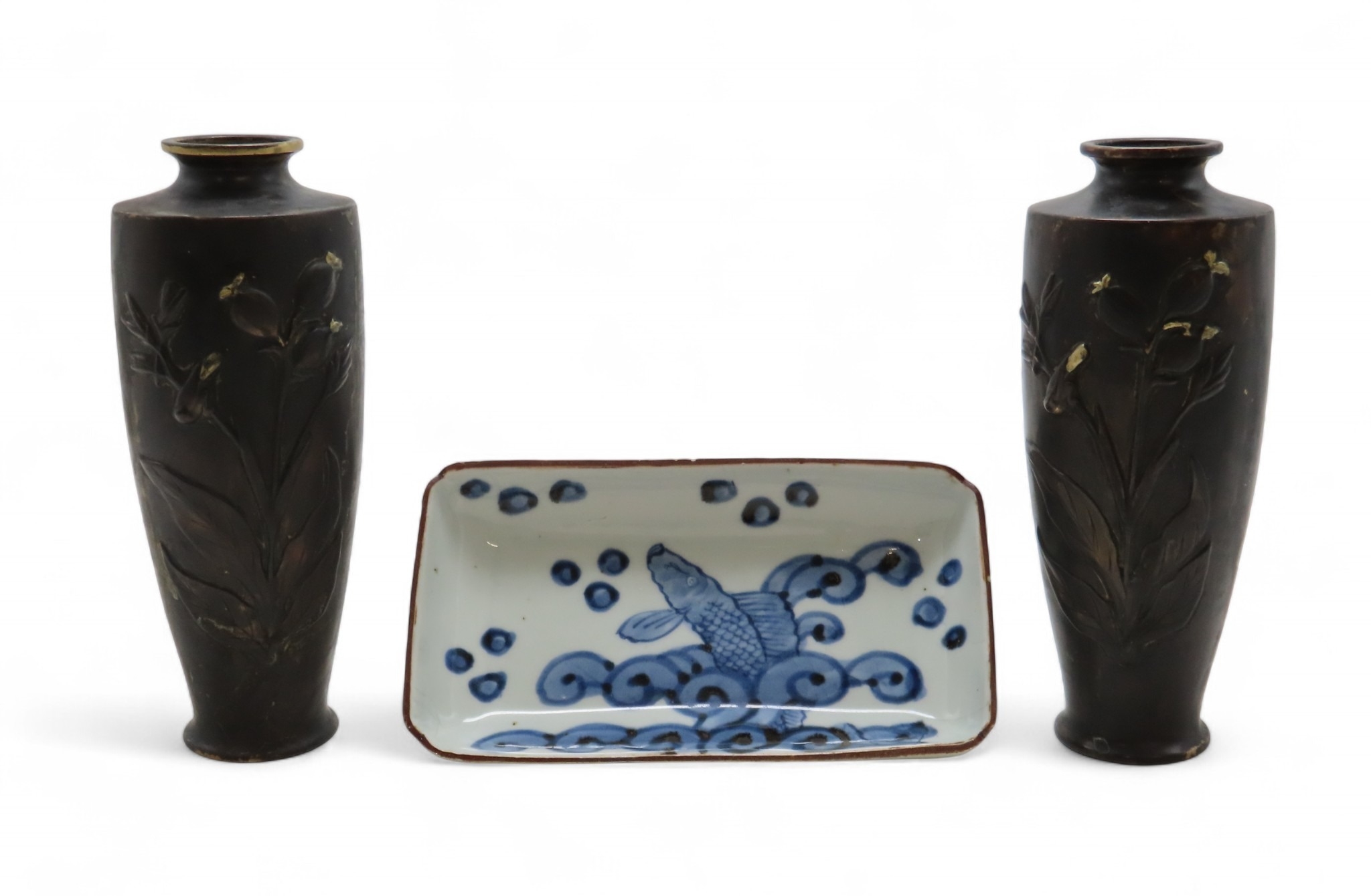 Painted with a Kashiki carp amongst pond foliage, four character Fuki-Chosun marks, 20.5cm wide and a pair of bronzed cast vases, 21.5cm high (3)