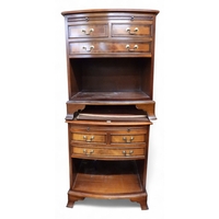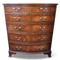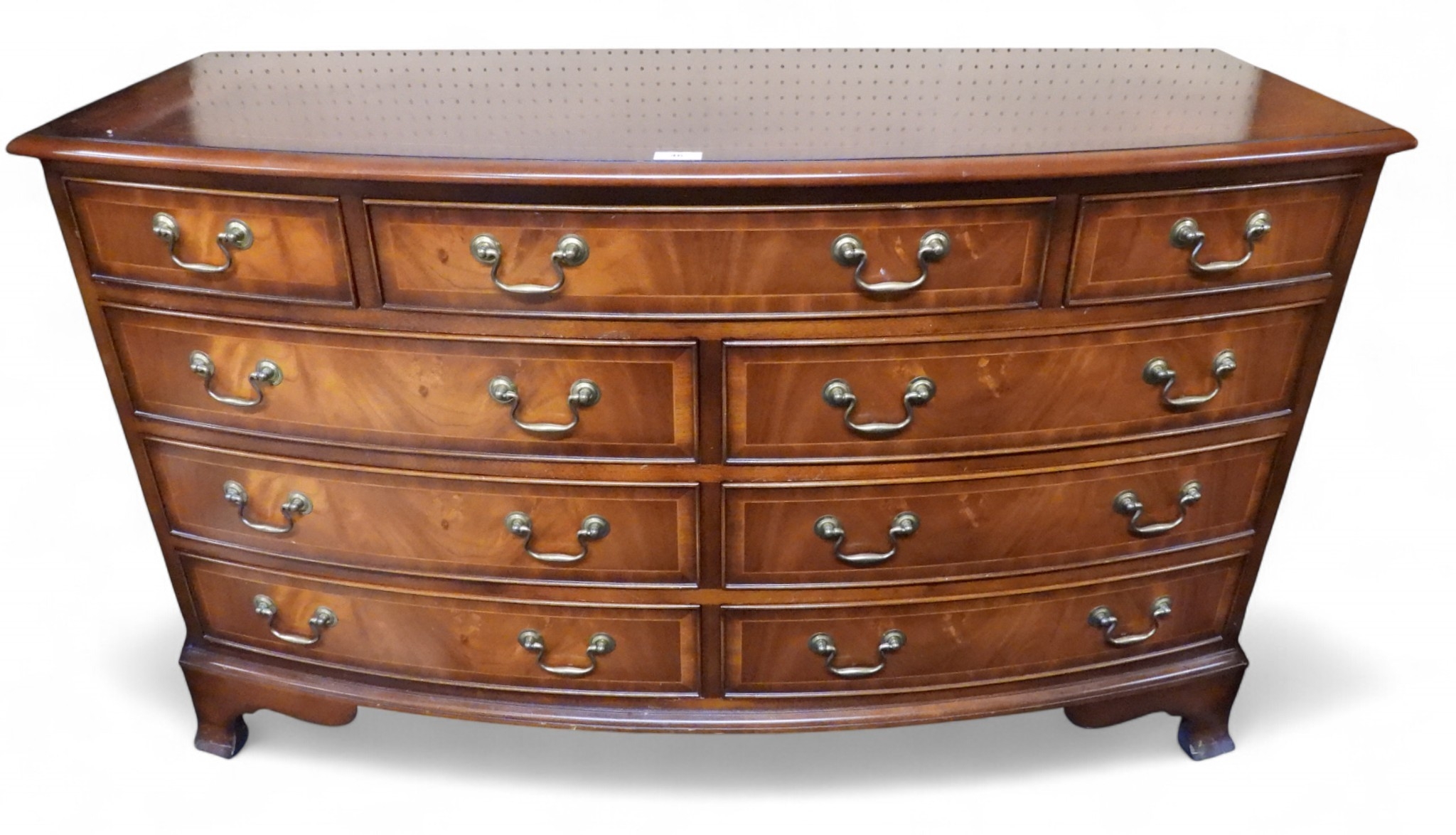 A 20th century mahogany bow front bank of drawers with one long flanked by two short drawers over three pairs of long drawers with brass drawer pulls on shaped supports, 75cm high x 124cm wide x 51cm deep